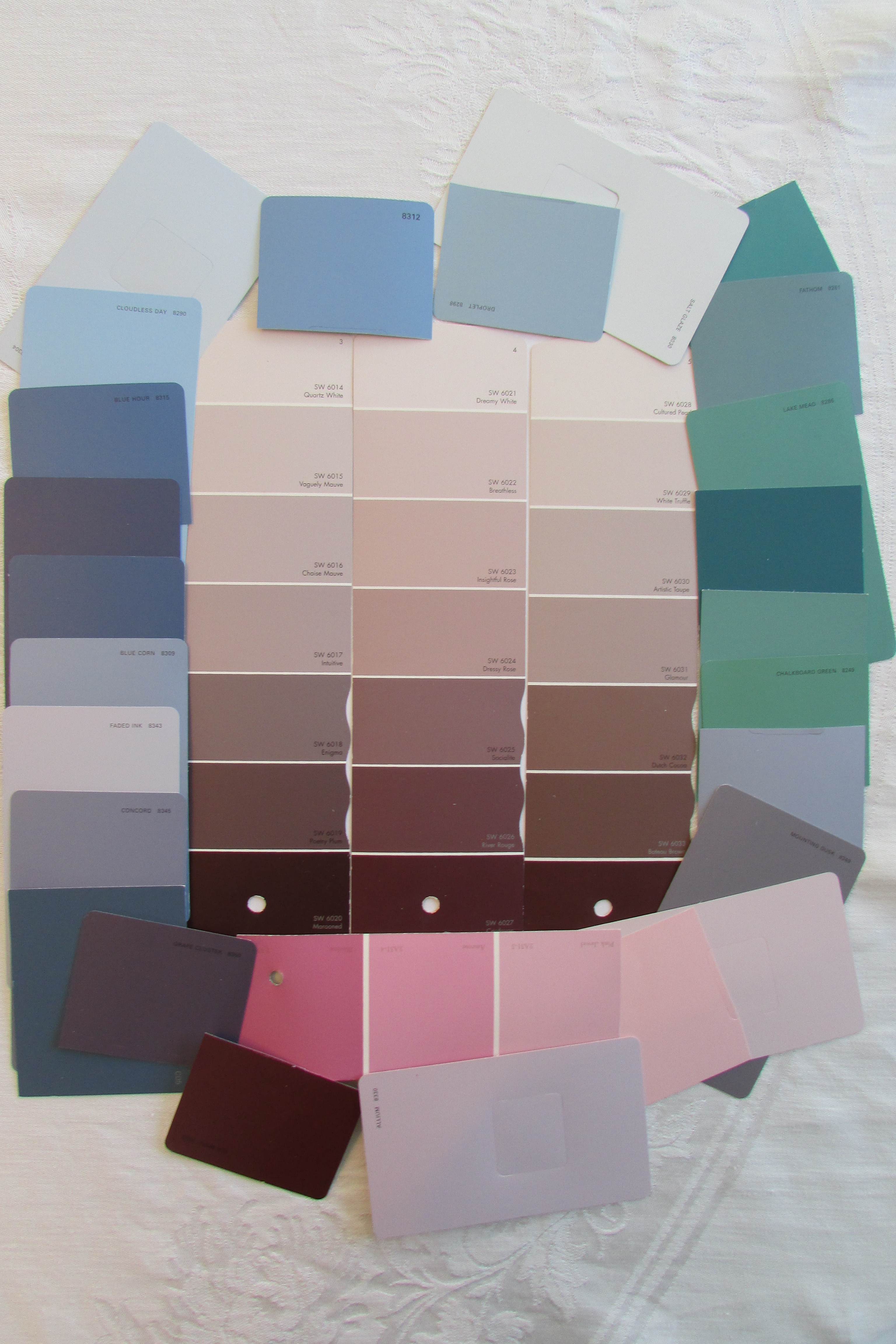 The third beige is Taupe (seen on the right). Taupe is a mix of gray and beige or black, brown and white. It is considered a warm color. Sometimes taupe is thought of as a brownish gray and other times it is looked at as a grayish brown. Sometimes gold is added to taupe which makes it even warmer toned, and by adding the gold it fits in even more with the warm side of the color wheel. Fabric and textile designers have been known to use together golden-beige and taupe or golden-taupe as part of the color stories when designing upholstery, bedding and drapery fabrics and well as ceramic tiles and multicolored carpets. IMG_0098 The above photo shows three paint color strips that are consecutively next to each other on a paint color fan. The three paint color strips show different versions of Rose-Beige, which is a cool toned beige. (Rose-Beige was shown between golden beige and taupe in the previous photo). An assortment of many different cool toned colors, from the blue based side of the color wheel surround the three strips. The colors that you see are tints (lighter versions) of the shades red-violet, violet (purple), blue-violet, blue and blue-green as seen on the color wheel. All these colors and many lighter and darker shades/versions of these colors, would work as accent walls in rooms that are rose-beige, or even blue-beige colored.
