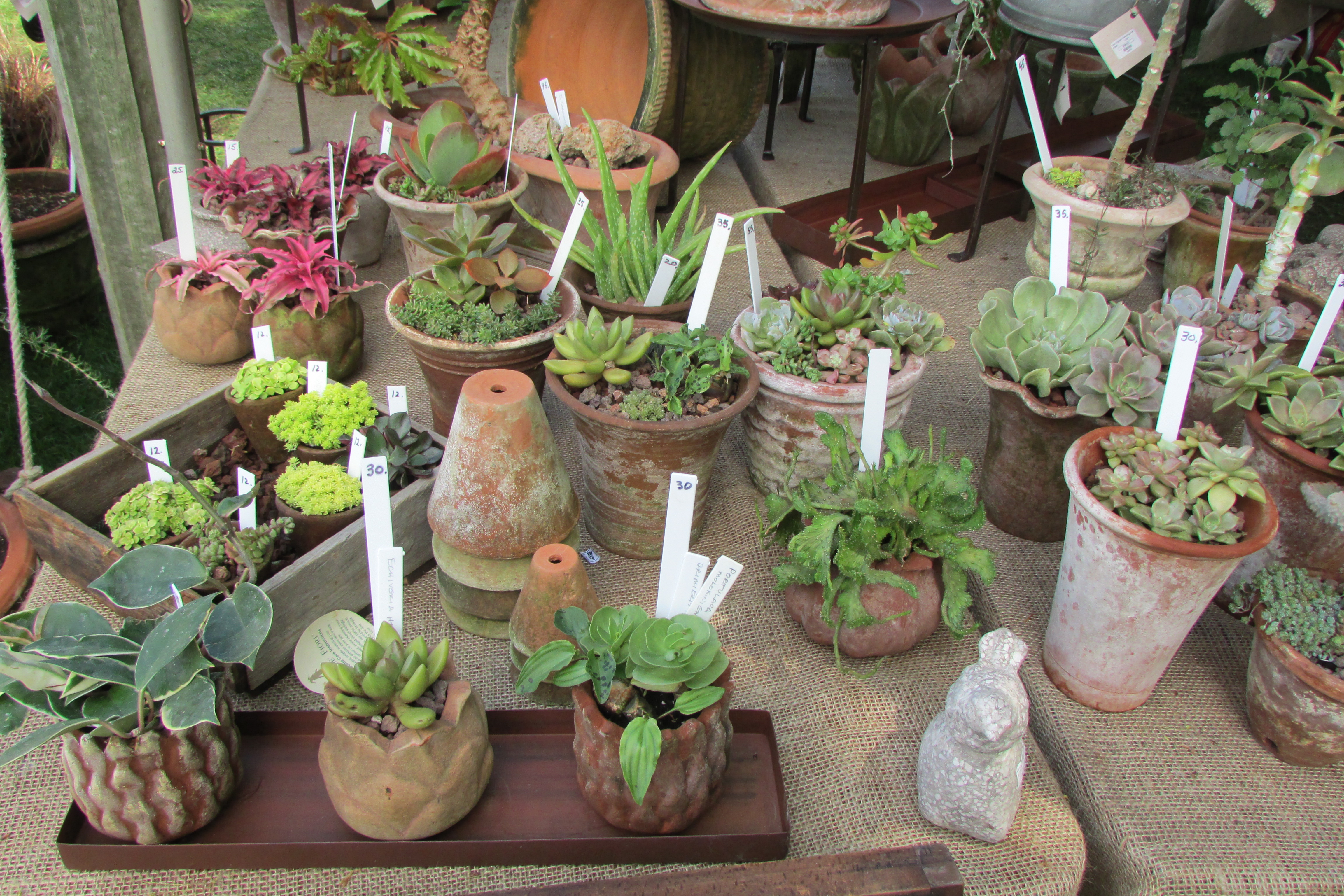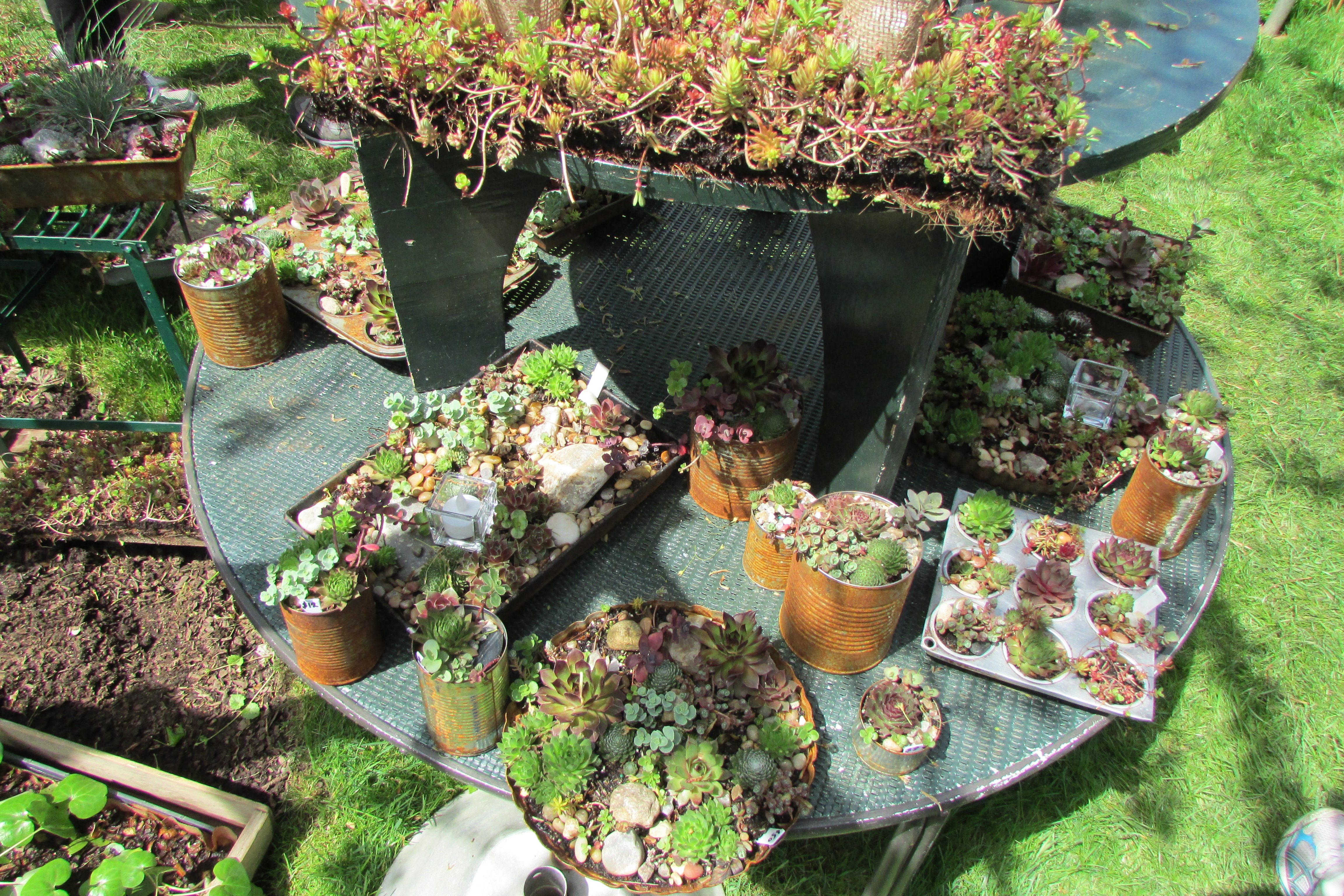 An interesting arrangement of hens and chicks and other succulents.