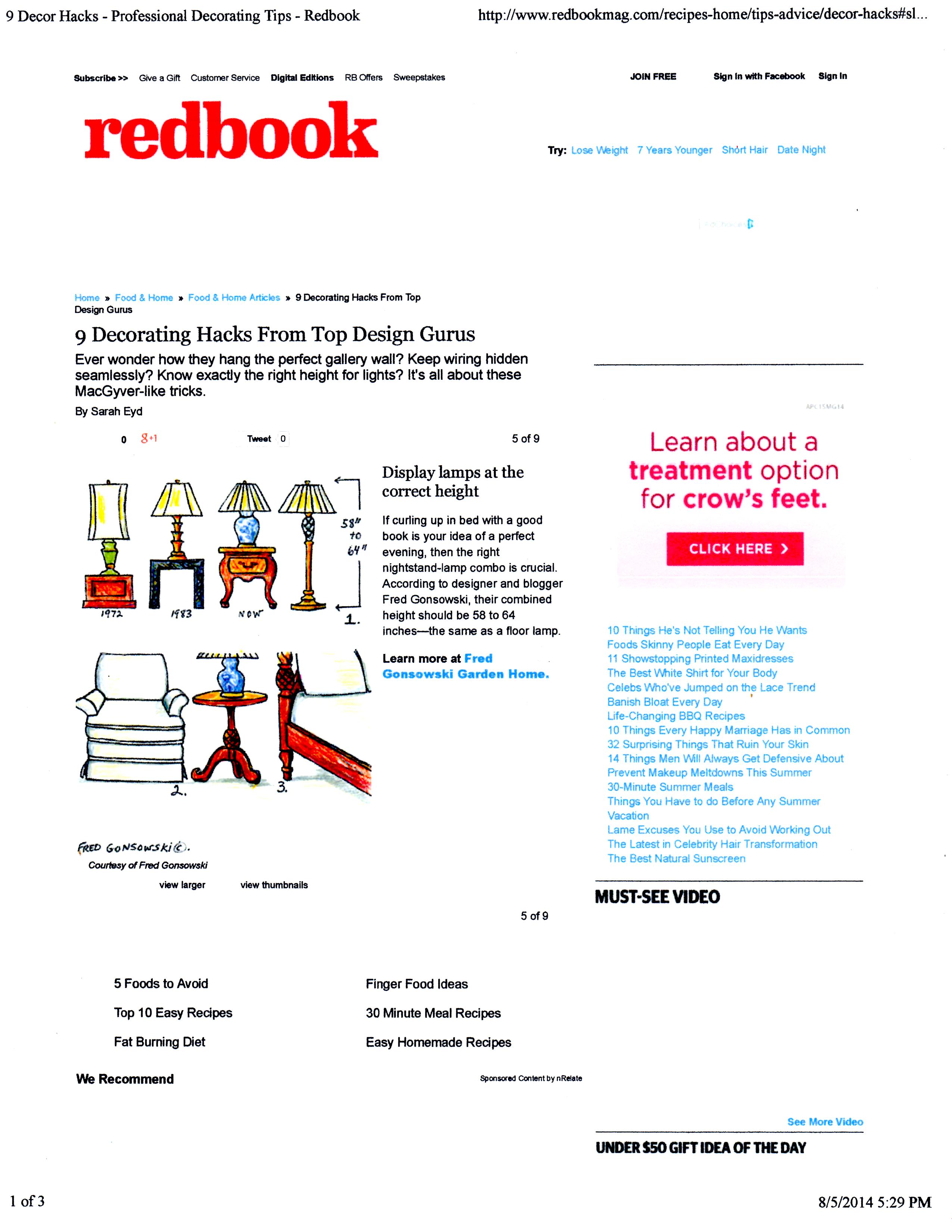 Hi there Everyone. I’m soo excited. Recently the people at Redbook Magazine got in touch with me because they liked my post titled The Right height of Table Lamp for your End Table, and asked if it could be part of a piece they were writing for their online presence Redbookmag.com. The title of the Redbookmag article is 9 Decorating Hacks From Top Design Gurus; I’m number five. If you have a minute check out the article. Go to Redbookmag.com, look for Food & Home which is at the top of the page (right under the K in Redbook), you will see the article 9 Decorating Hacks from Top Design Gurus there. The direct link to Redbookmag’s site will be in the first comment after this post.