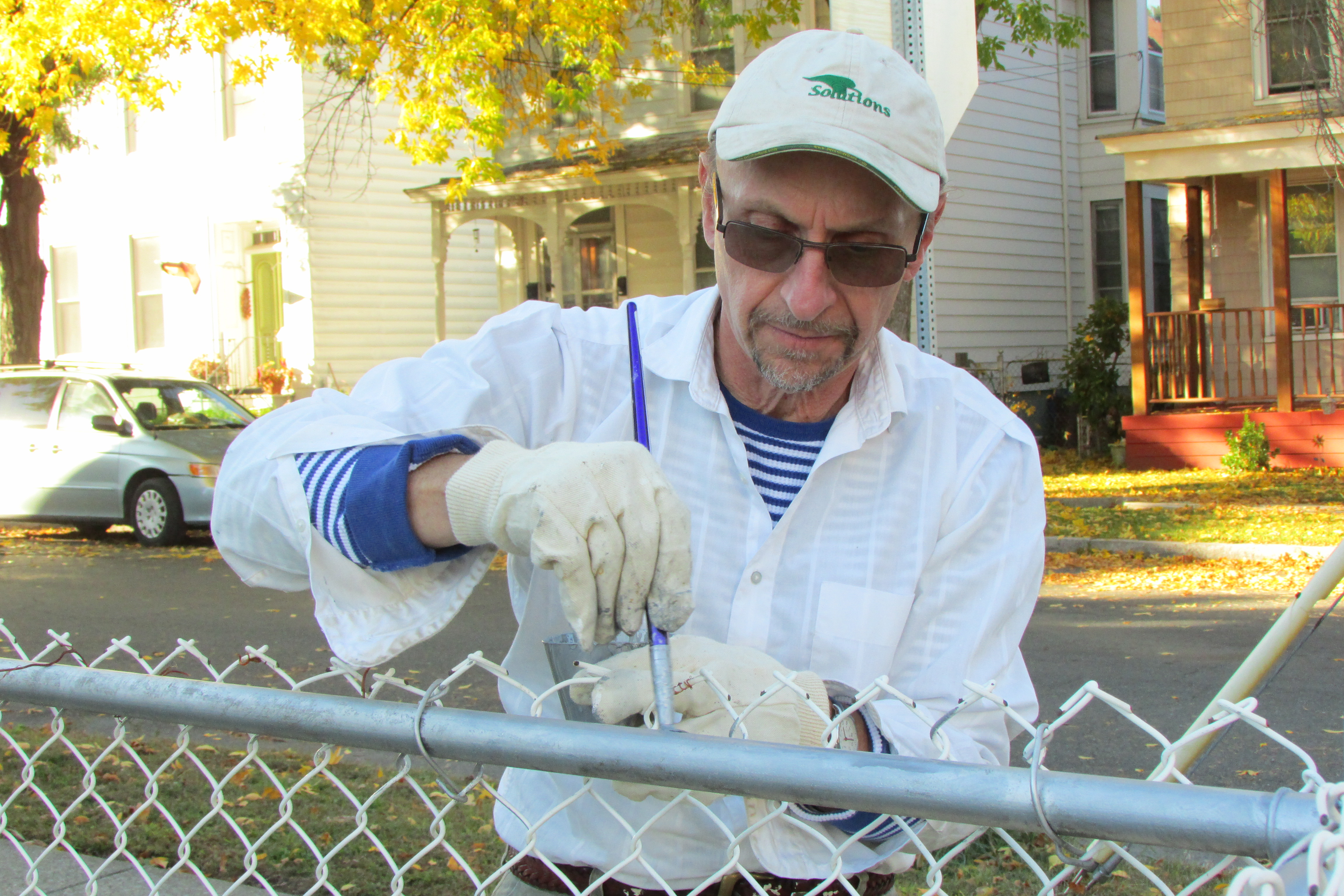 This is an important photo for you to look at. Notice how I’m pulling back the vinyl coated chain link fencing with my middle and ring fingers; while holding the paint filled plastic cup with my index finger and thumb. By pulling back the top edge of the fence you don’t get too much paint on the chain link fencing where it is not wanted.