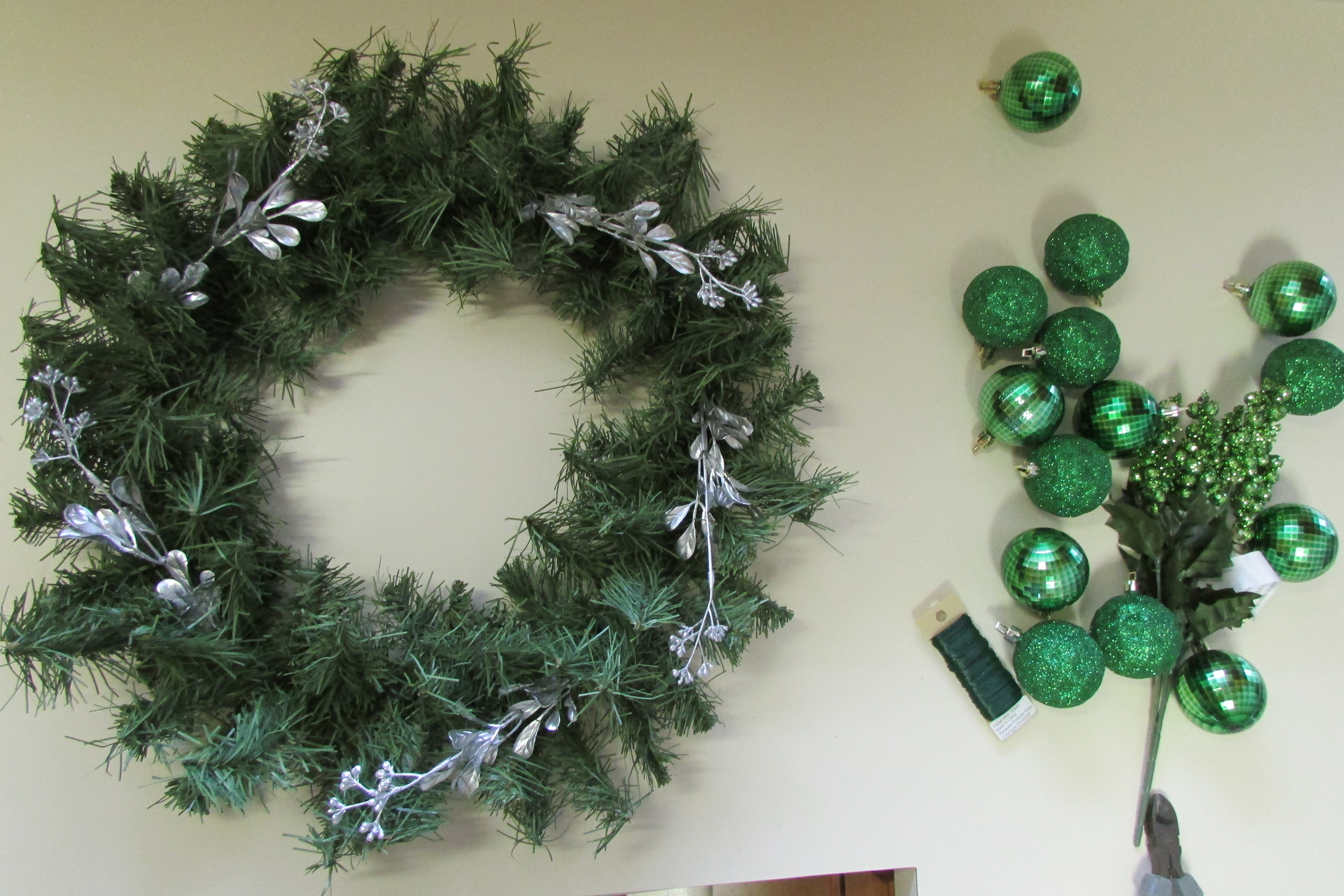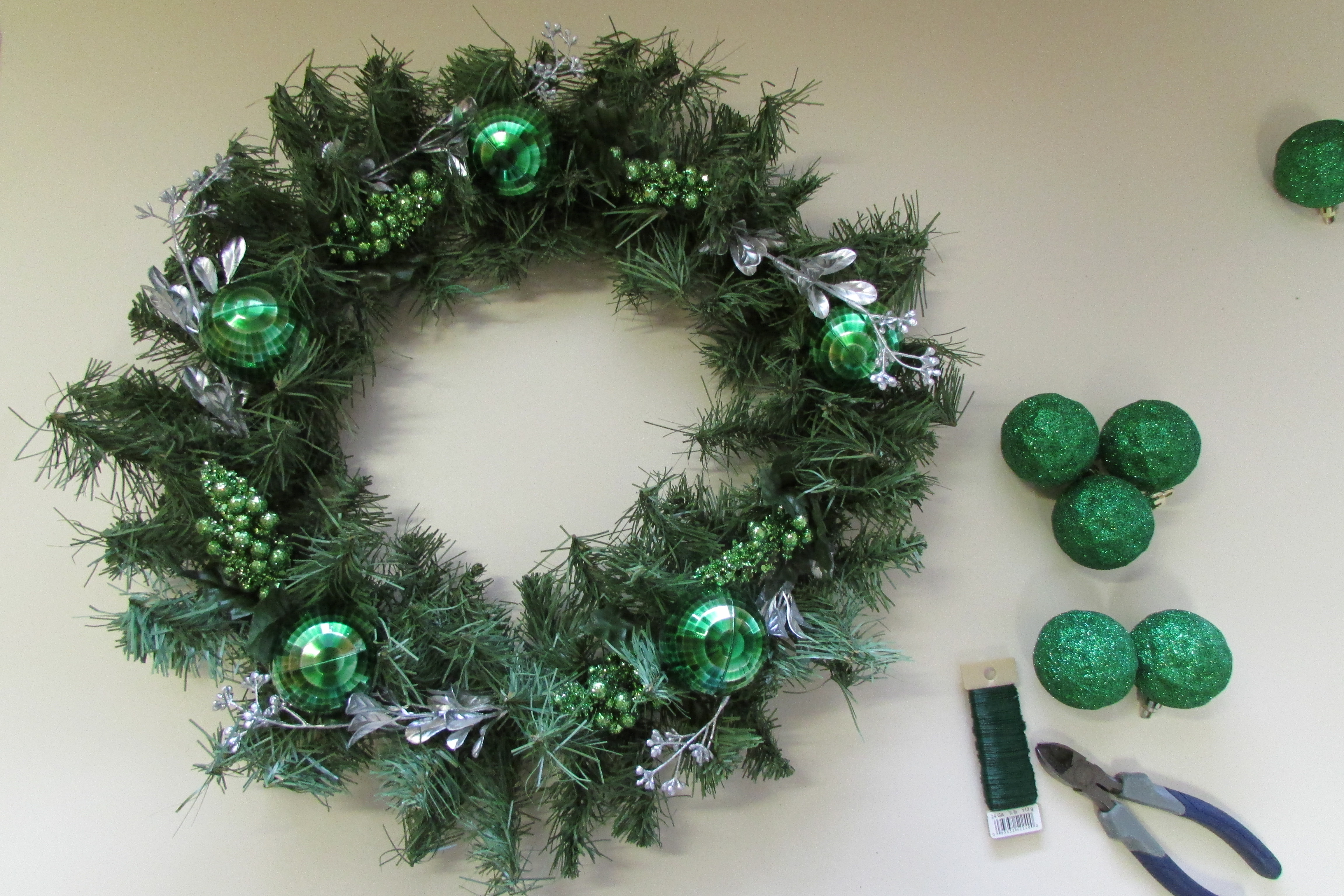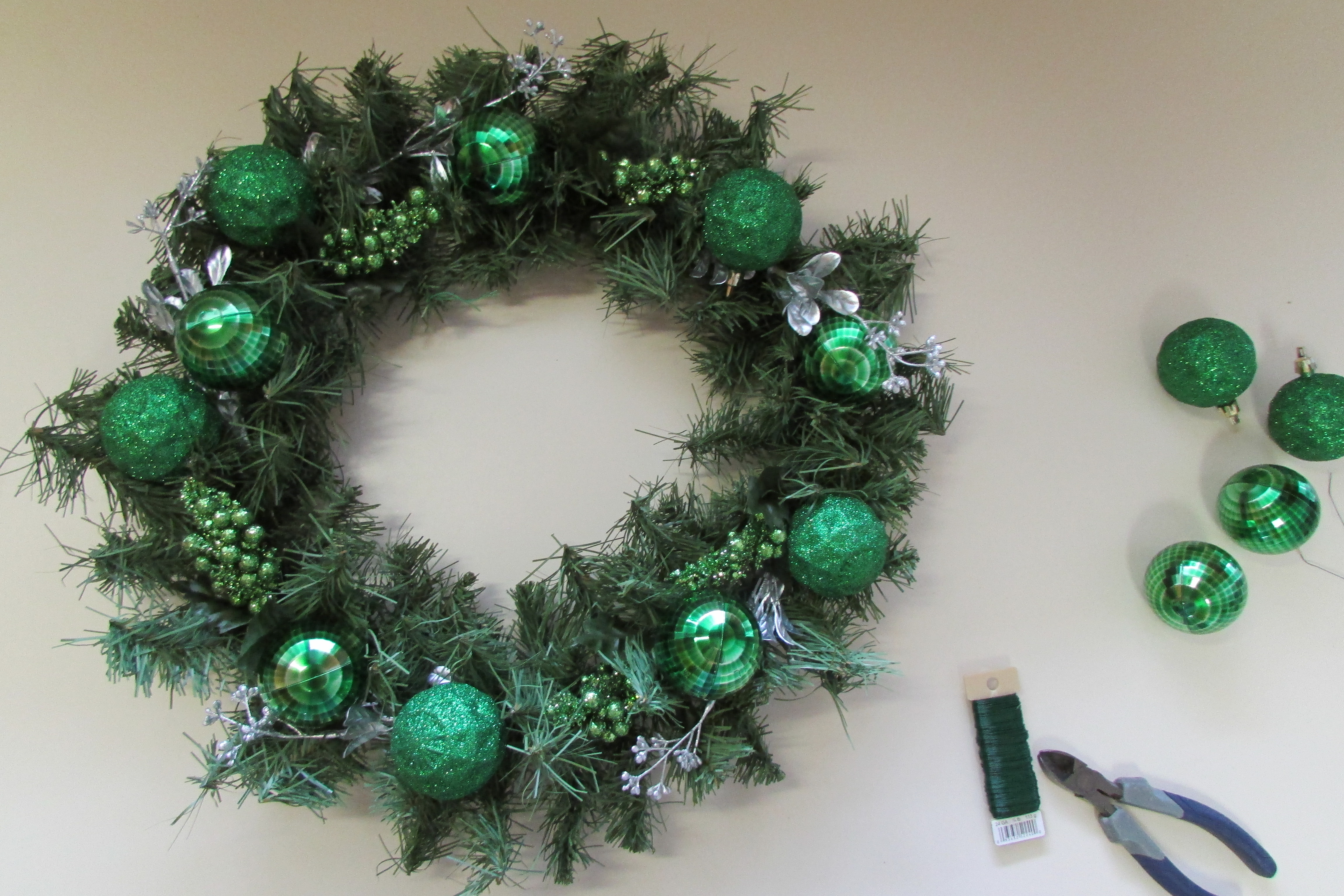 Step Three Do a dry run. Lay out all of your elements on your wreath before wiring anything permanently down. Start with your base foliage and continue adding elements, layer by layer, until you have completed your wreath and have come up with an arrangement of product that you find attractive. The next photos show how I added the different element, one-by-one, to my wreath.IMG_1519 This photo shows how the 5 silver sprigs were first spread (evenly spaced) around the wreath; all going in the same direction.IMG_1526 Next 5 glittered clumps of berries were placed between the 5 silver sprigs; again all pointing in the same direction.IMG_1528 5 shiny green mirror balls were evenly placed around the wreath, and then followed by..IMG_1529 five glittered balls.