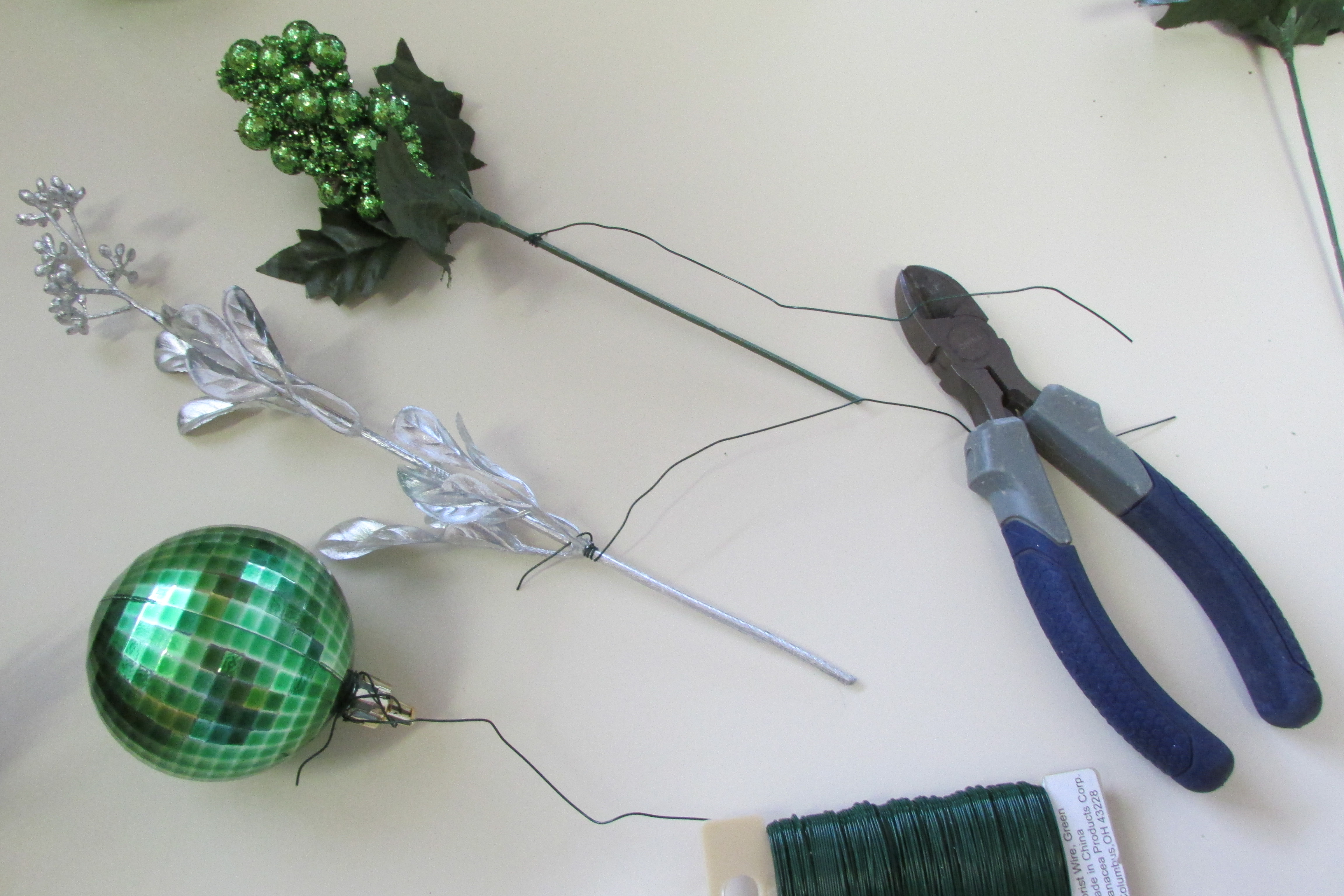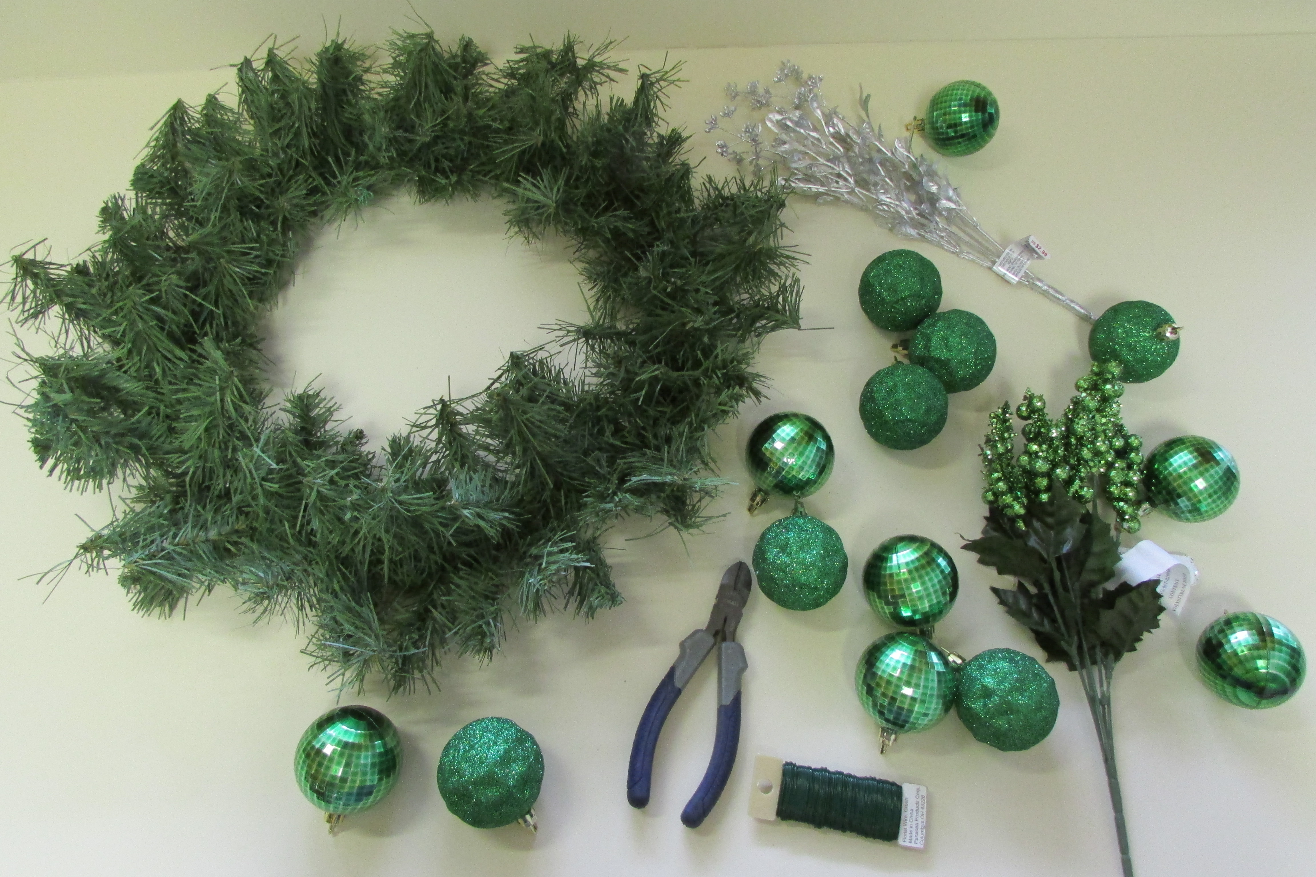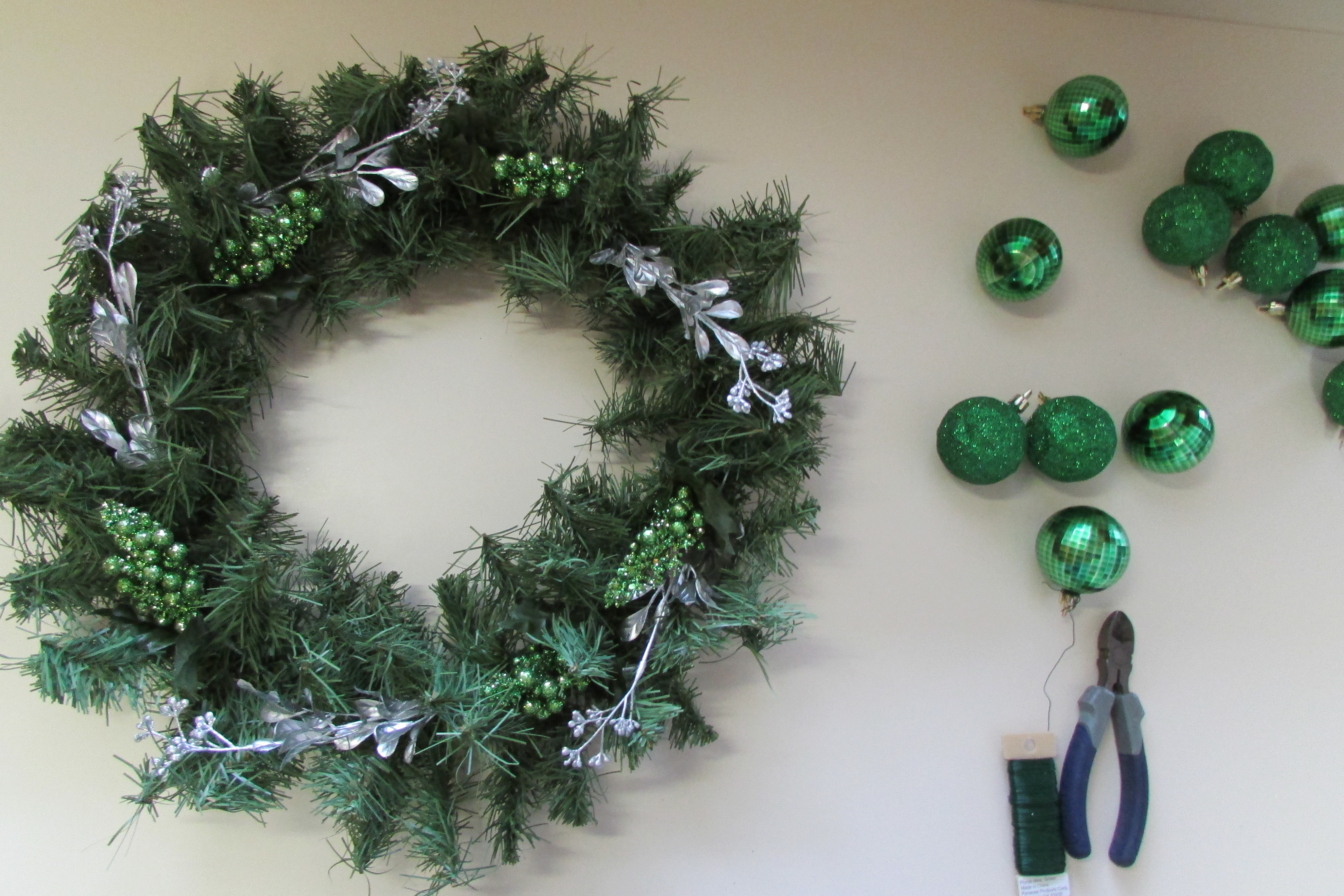 Step Three Do a dry run. Lay out all of your elements on your wreath before wiring anything permanently down. Start with your base foliage and continue adding elements, layer by layer, until you have completed your wreath and have come up with an arrangement of product that you find attractive. The next photos show how I added the different element, one-by-one, to my wreath.IMG_1519 This photo shows how the 5 silver sprigs were first spread (evenly spaced) around the wreath; all going in the same direction.IMG_1526 Next 5 glittered clumps of berries were placed between the 5 silver sprigs; again all pointing in the same direction.IMG_1528 5 shiny green mirror balls were evenly placed around the wreath, and then followed by..IMG_1529 five glittered balls.