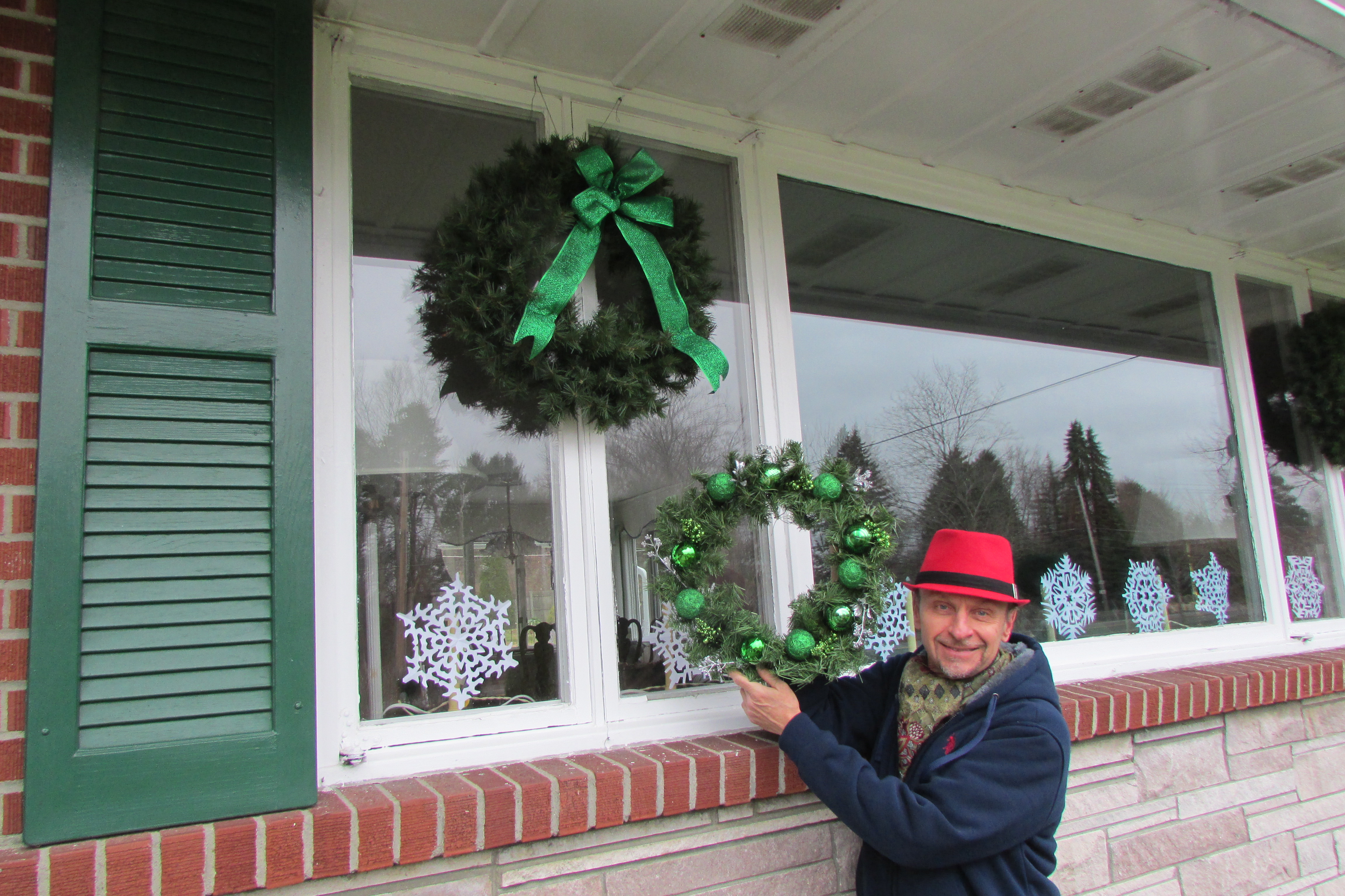 If I were going to add a bow to the wreath, I would Making a No Tie Bow, but I did not want one on my wreath. I have  hung five  un-decorated wreaths with big bows on all of the windows on the front of my house and wanted something, that went with, but was a bit different for the front door. The next photo shows me out front, and you can see one of the other wreaths. IMG_1536 If you find the snowflakes attractive, that also grace my windows during the Winter months, learn how to make them by reading my post Cutting /Making Paper Snowflakes.