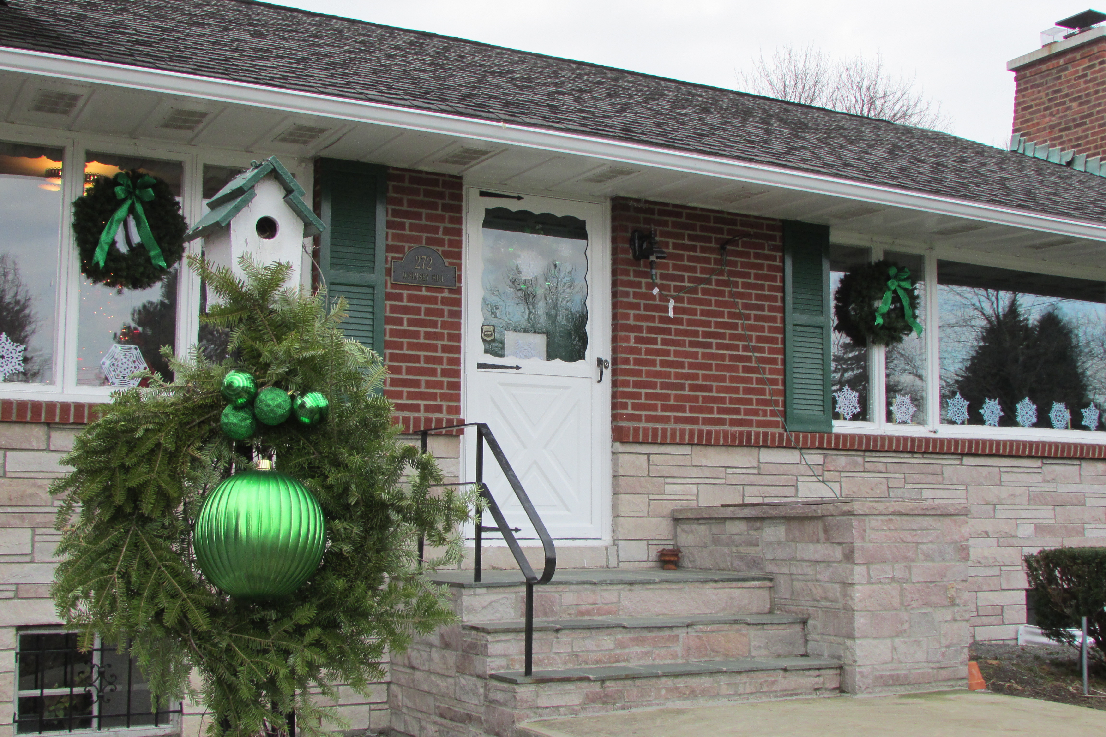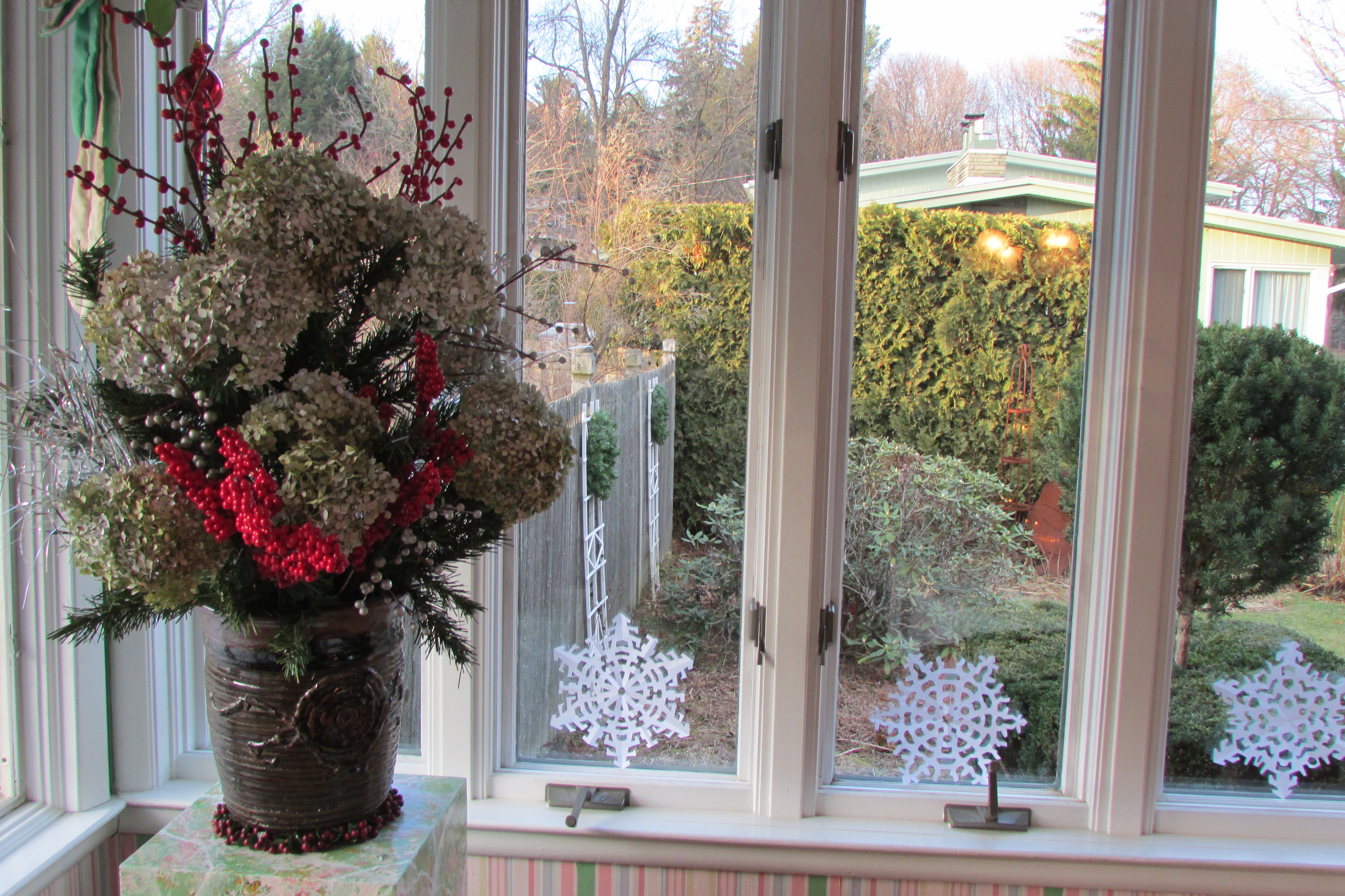 and large artificial evergreen swags and cut paper snowflakes add visual interest to the front facade of my house.