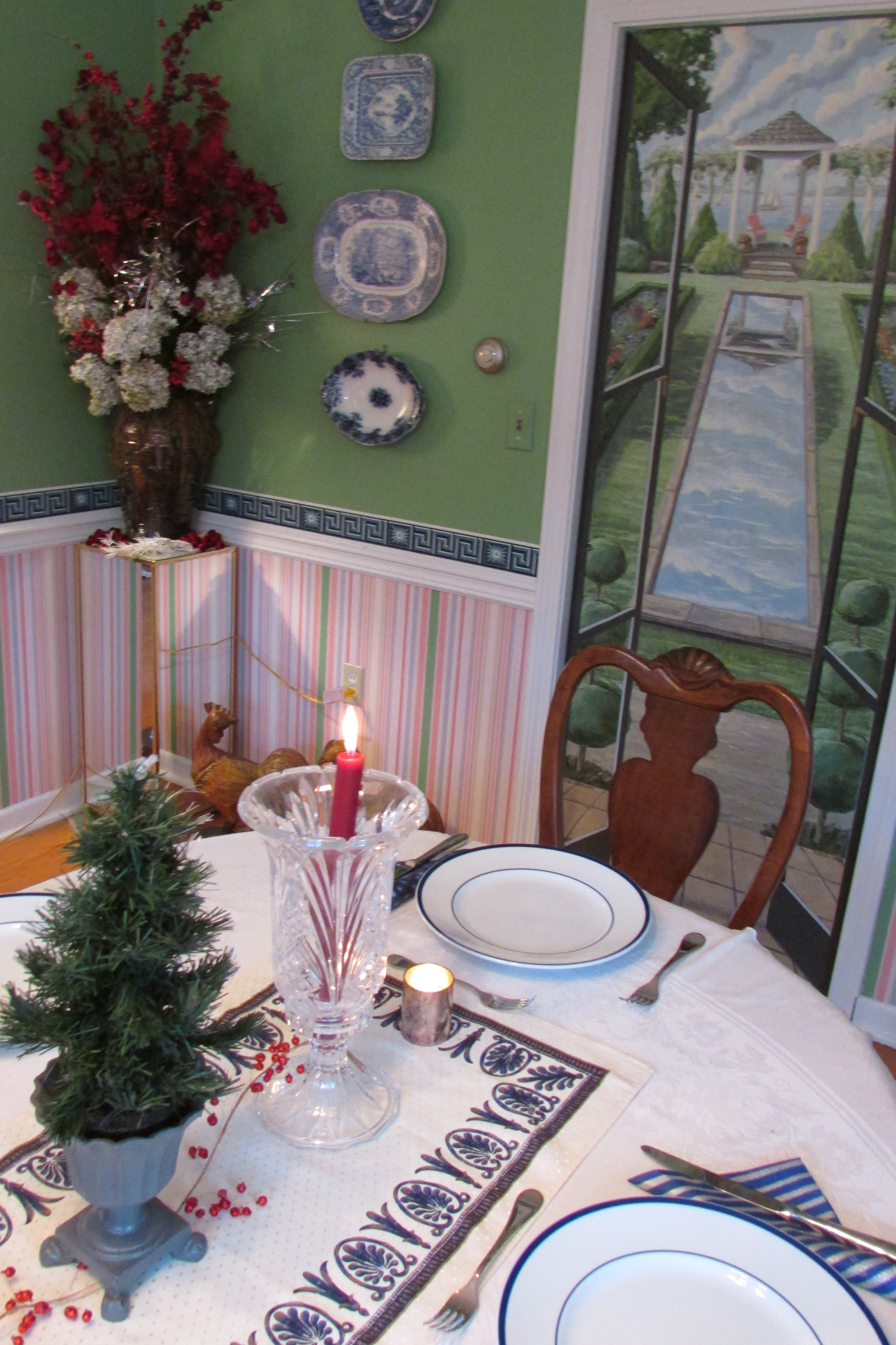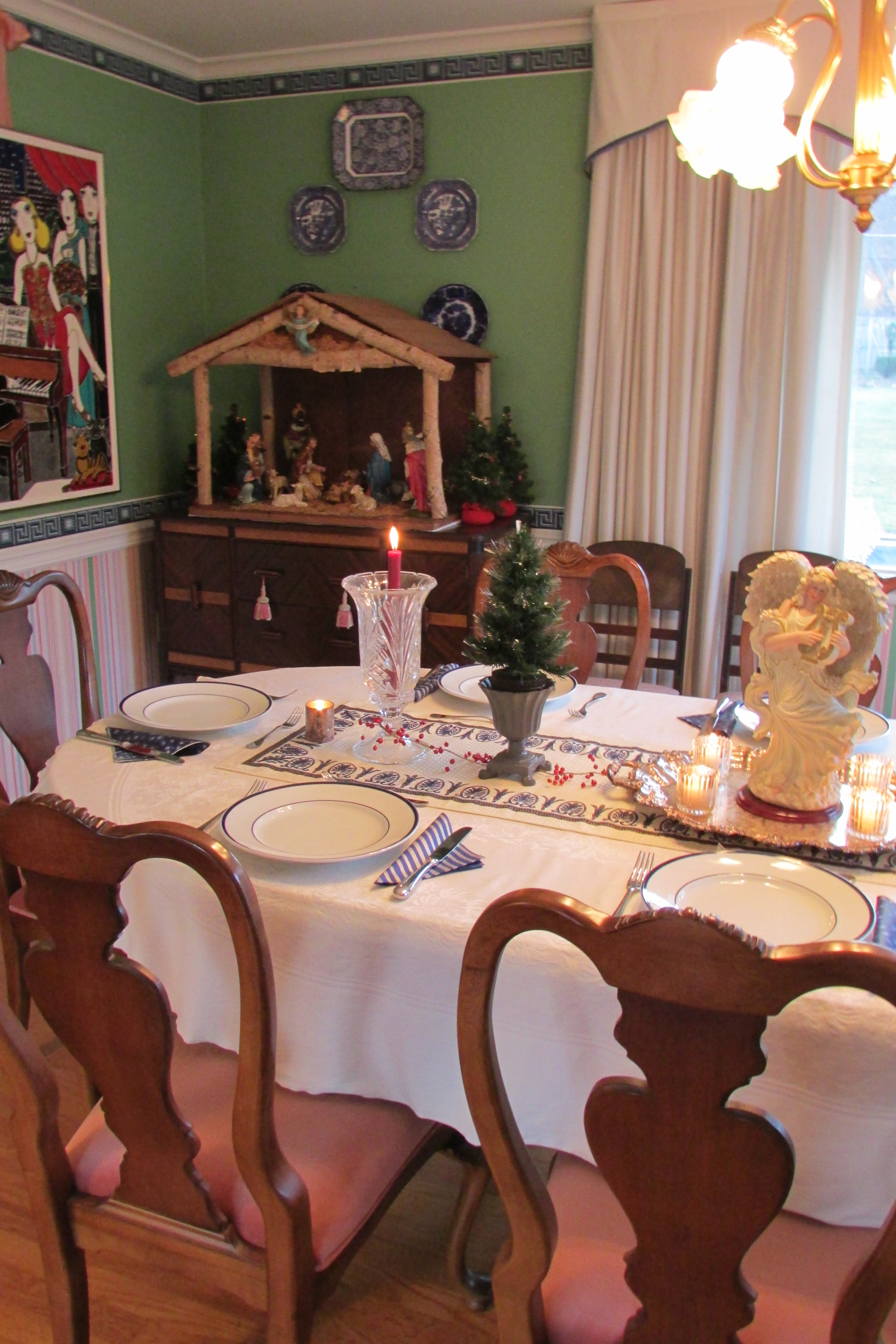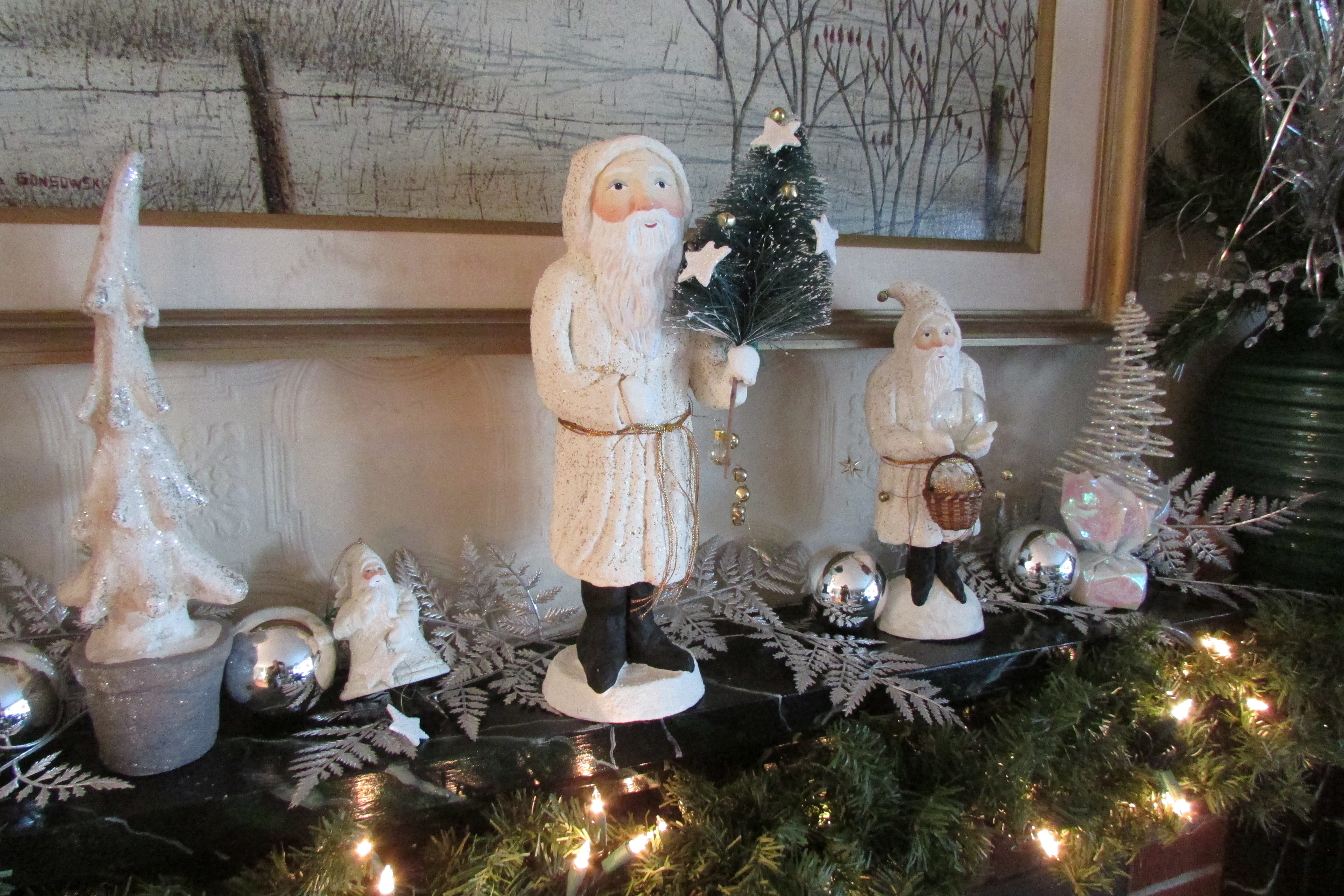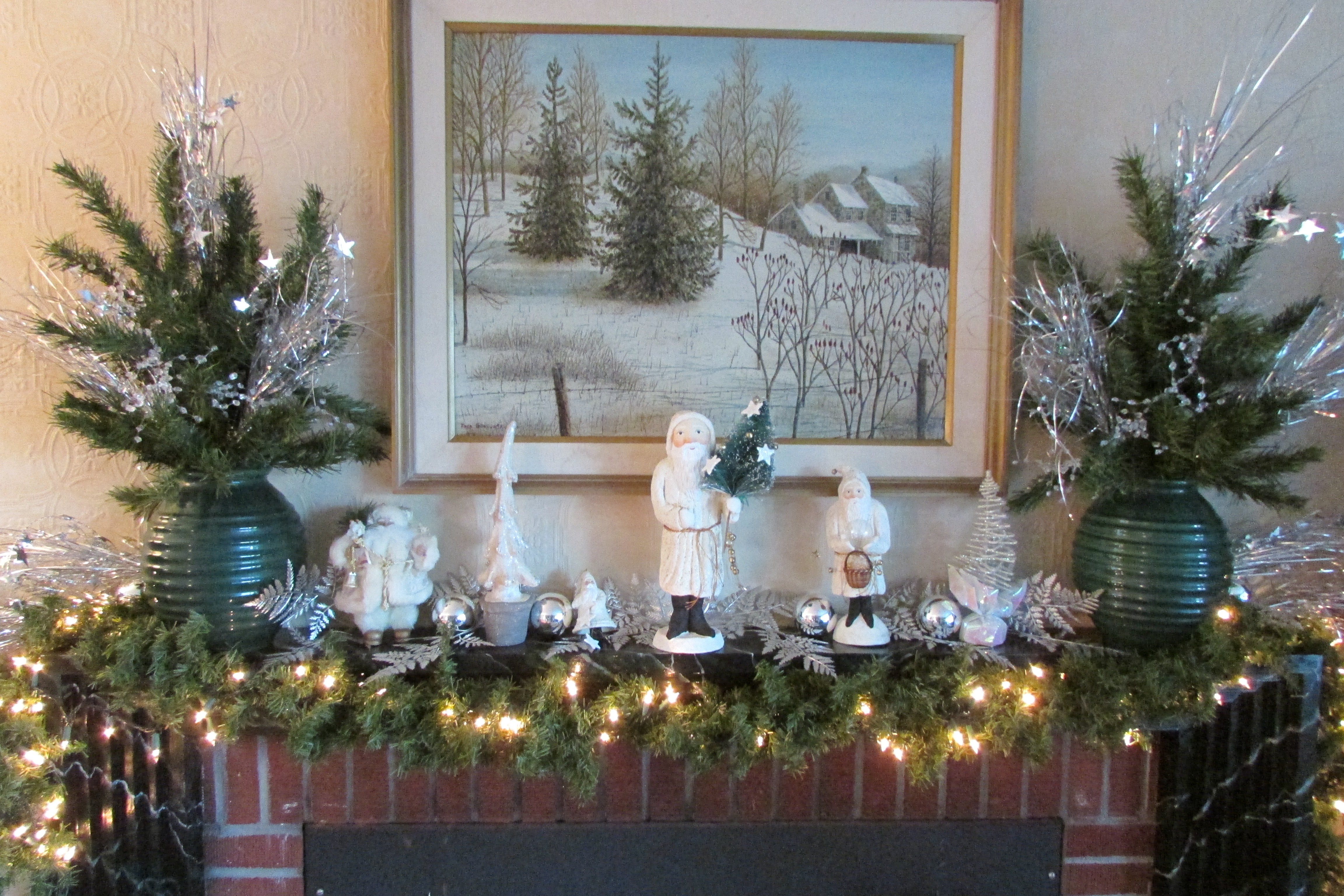The above photo shows a large Chinese floor vase, that is in a space between my living room and dining room that I’ve filled with artificial greenery (branches from my old Christmas tree), the flocked fern fronds that inspired this years decorations, white-painted branches, white plastic glittered snowflakes and white sprayed hydrangea flower heads that I picked from my garden. (if you like, click on all the photos in this post to enlarge)IMG_1578 This is a closeup of the large living-dining room arrangement, which is a major focal point in the two rooms, and inspired all of the other decorations in those two spaces. Looking at the photo you can see that, for extra sparkle, white lights were strung throughout the evergreen base and sprays of thin tinsel-like silvered metallic decorations with stars were also added. The hydrangea flower heads in the arrangement were first sprayed with white paint, then after they dried two coats of Aqua Net hair spray were applied to firm them up which makes them easy to work with.IMG_1581IMG_1582 The next two photos show a collection of white chalk-ware Santas on the fireplace mantel in the living room. Looking between the first shot and the detailed closeup of the second photo, notice how the silvered plastic fern fronds move the fern shapes from the large arrangement in the Chinese floor vase to the mantelpiece, and how the silvered sprays from the large arrangement in the floor vase were also used in the green vases on the mantel and at the ends of the display; also notice the scattering of the silver bulbs. (For those of you wondering about  the painting over the mantel, it was made by me, sometime in the 1980’s). IMG_1591 Now we have moved on to an end-table that is next to one of my sofas. A collection of icy glass objects and silver ornaments keep the White Christmas theme moving around my living room. Here I’ve taken a bubble vase and filled it with different sizes of silver tree ornaments, then covered it with a dome. Look at the silver ornament in the glass sleigh, it is an old Christmas corsage worn by my maternal grandmother. (To know more about making groupings of objects read my post Arranging your Decorative Accessories (Knickknacks and Collectables).IMG_1602 This photo shows how the top of my large Christmas tree has been turned into a table-top tree. The tree sits in a vase that I made in college. Clear plastic prisms (bought in the 1960’s), clear plastic dated ornaments (mostly from the 1980’s) as well as silver beads and small silver bulbs decorate it. A silver sleigh and two reindeer are at its base; a gift from my sister.IMG_1617IMG_1595 Now we are in the dining room where the table has been set for a holiday meal. A pair of crystal hurricane shades, the mostly white table runner and the dinner plates keep the white theme going. Look at how a garland of fine red metal bells runs under all of the elements down the center of the table and then winds around the bases of the hurricanes. By doing this, red is moved from the red of the candles, to the table top and then to the arrangement in the corner of the room. Notice in the second photo how the white sprayed hydrangea flower heads are incorporated into the arrangement on the pedestal.  The white hydrangea heads keeps the plant material, that was seen in the large arrangement in the Chinese floor vase, as seen at the beginning of this post, working through the dining room.IMG_1612 Looking from the other side of the room you see an angel wearing a white robe, used as a table centerpiece, that picks up the white of the manger in the corner of the room.IMG_1565 IMG_1598The nativity set is probably 50 years old, came from Montgomery Wards and cost $9.99; the largest figurine, one of the kings, is 12 inches tall. My father, with a hand saw (he did not have an electric saw at that time) designed and fashioned the stable from plywood, the tops of wooden vegetable crates and white birch branches cut at his parents farm in Melrose, NY. I remember dad cutting the plywood, in an unheated back room, in our old house. IMG_1561 On the other side of the dining room I’ve placed another large arrangement incorporating the painted hydrangea. White paper snowflakes are taped to the bottoms of the windows, as they are in the living room and all the other windows that face the front of the house.( To learn how to make paper snowflakes read my post Cutting/Making Paper Snowflakes) IMG_1630In the kitchen poinsettias, an artificial winter berry wreath and a red cardinal decorate the windowsill above the kitchen sink. Look carefully and you will see in the center of the wreath one of a pair of white wire deer and wooden and metal snow flakes that decorate my back garden during Winter. (For more ideas about decorating your outdoors for Winter read my post Some Christmas Decorations projects that you can leave up ALL WinterIMG_1717At the other end of the kitchen, the table is set for a light lunch for a few friends.  Gingerbread cookies serve duel purpose as both table decorations and later as part of the dessert.  Notice how the winter berry is a reoccurring theme in the room.  It was first seen as the wreath over the sink, now as a garland hung over the painting made by me, and at the base of the candlestick.   The counted cross stitch table cloth is from my maternal grandfathers family, it is probably about eighty years old.