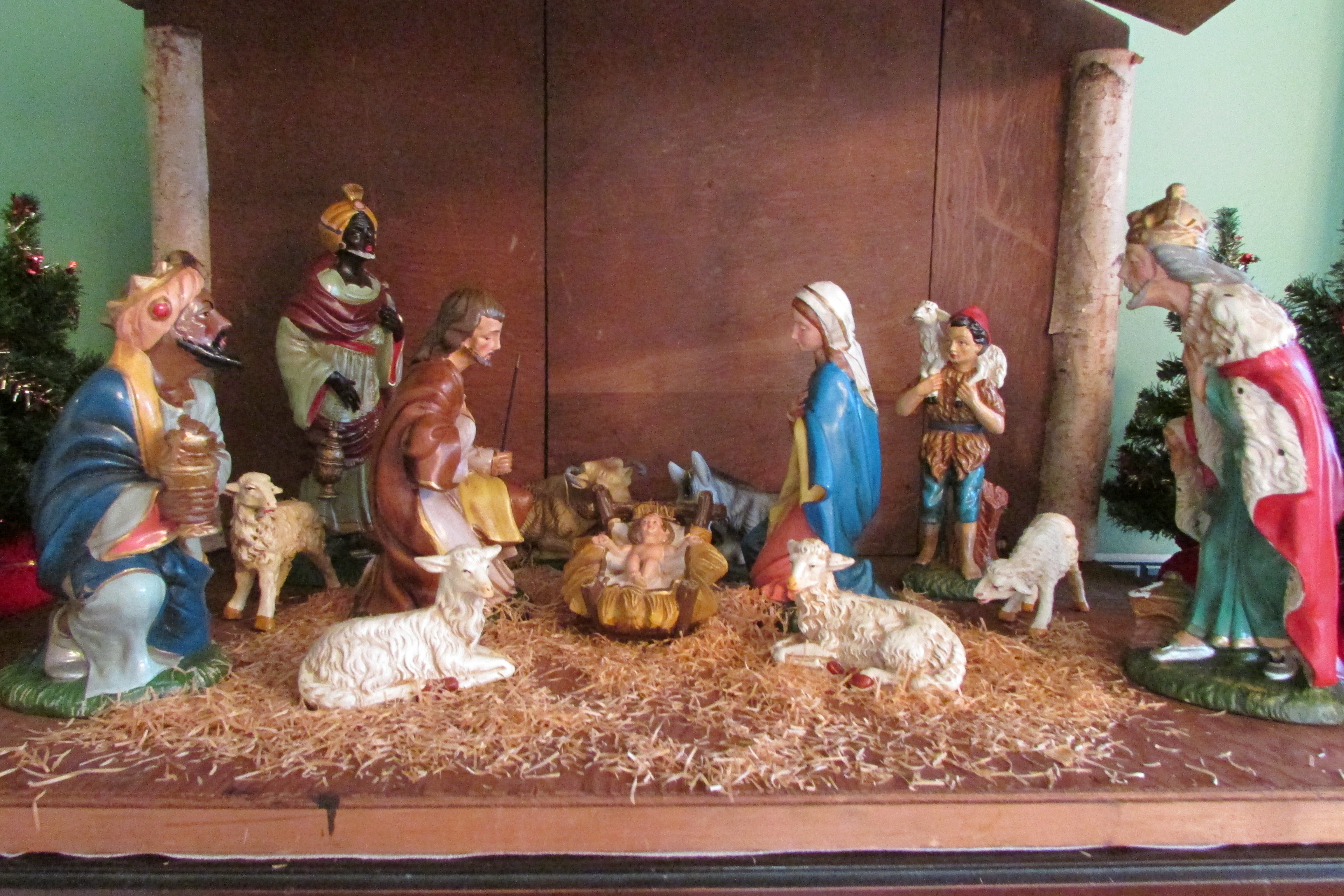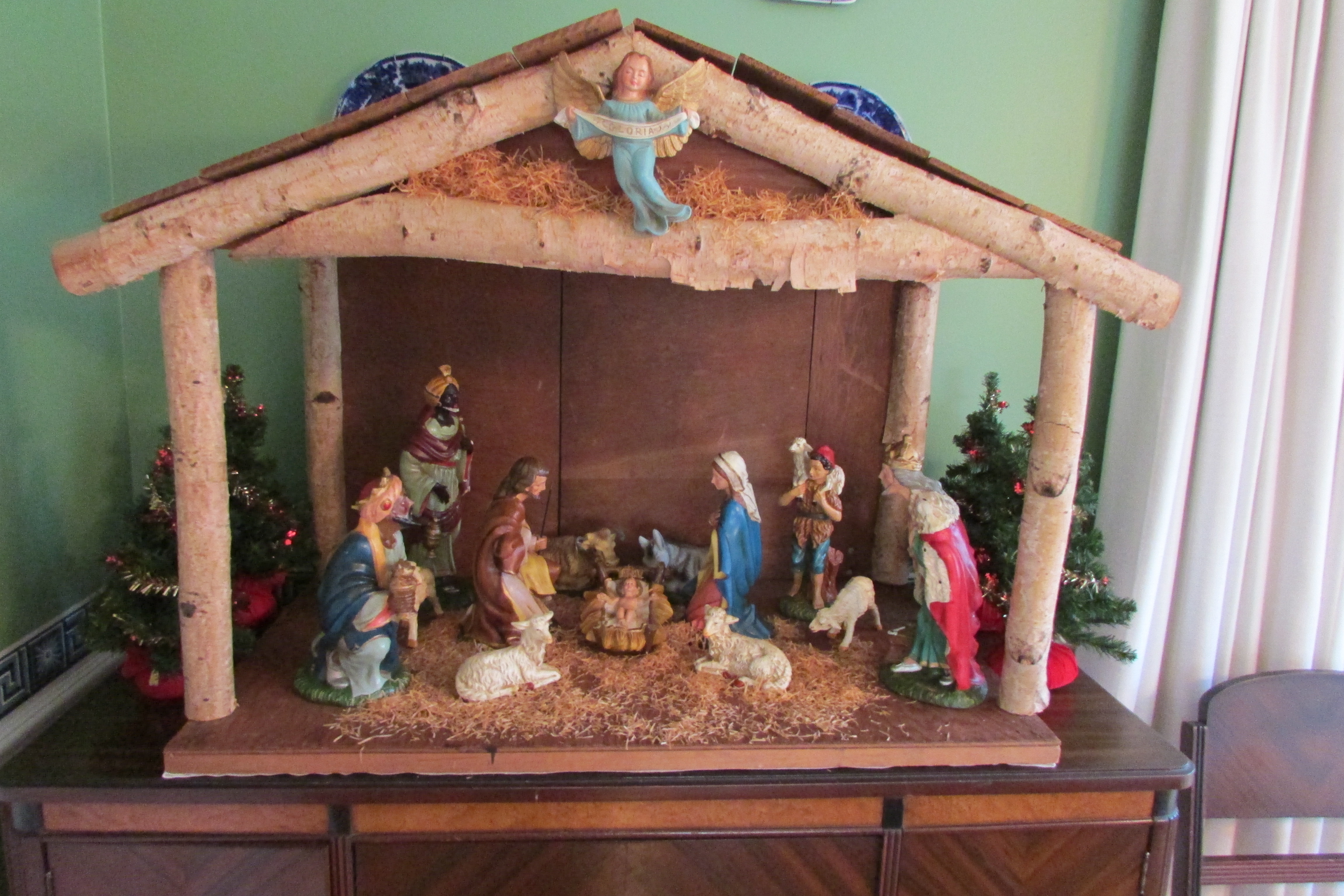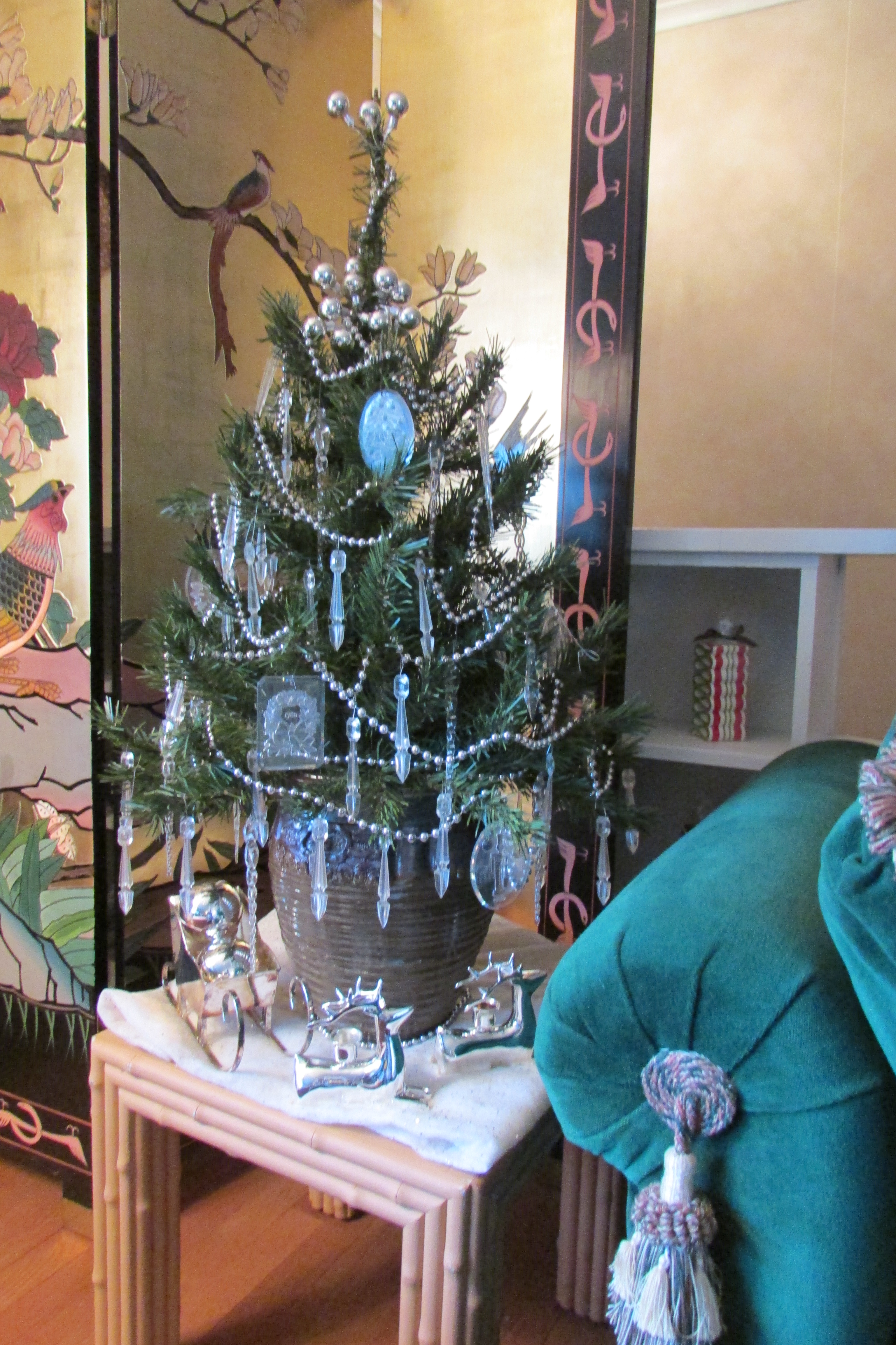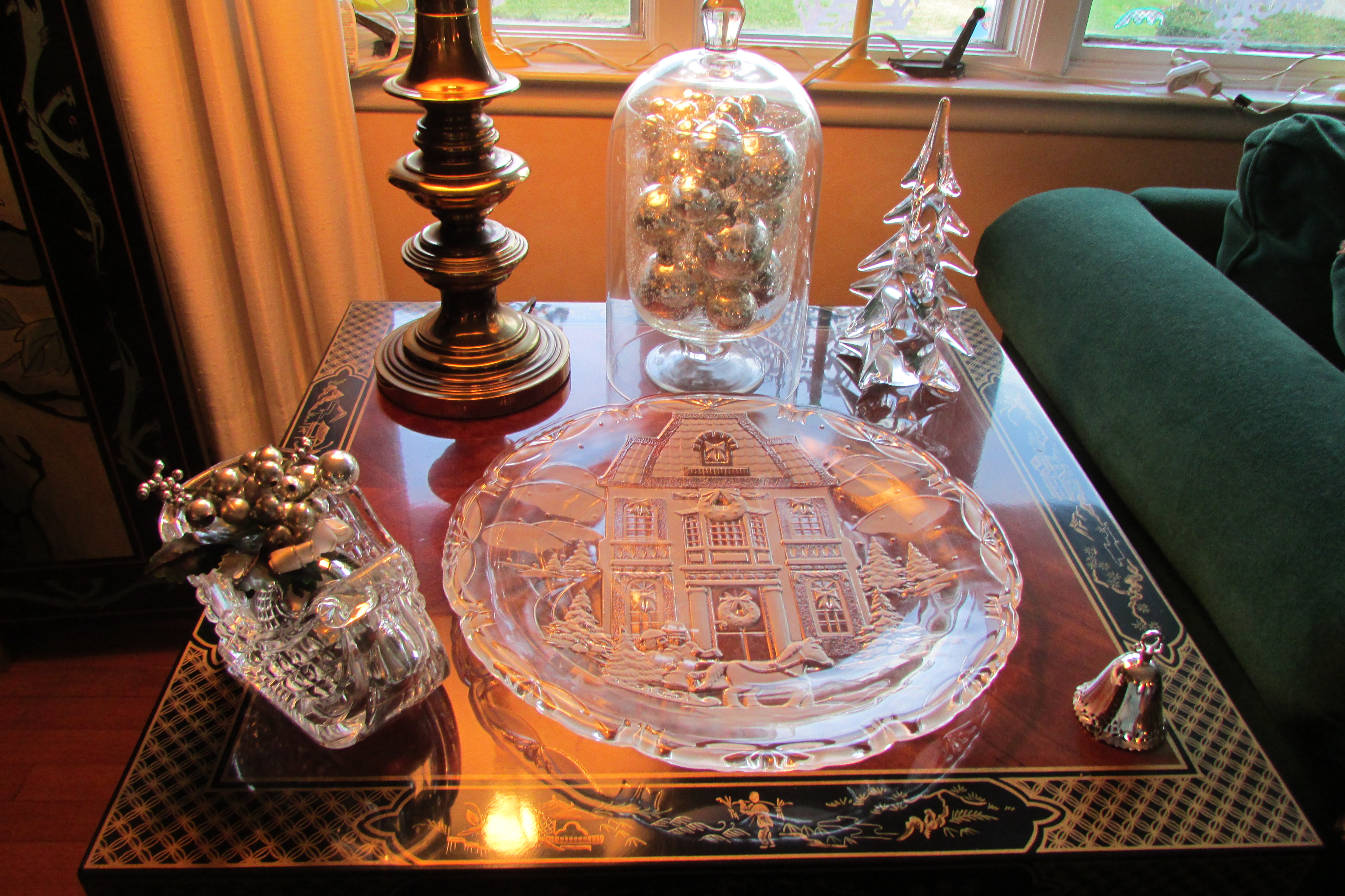 The above photo shows a large Chinese floor vase, that is in a space between my living room and dining room that I’ve filled with artificial greenery (branches from my old Christmas tree), the flocked fern fronds that inspired this years decorations, white-painted branches, white plastic glittered snowflakes and white sprayed hydrangea flower heads that I picked from my garden. (if you like, click on all the photos in this post to enlarge)IMG_1578 This is a closeup of the large living-dining room arrangement, which is a major focal point in the two rooms, and inspired all of the other decorations in those two spaces. Looking at the photo you can see that, for extra sparkle, white lights were strung throughout the evergreen base and sprays of thin tinsel-like silvered metallic decorations with stars were also added. The hydrangea flower heads in the arrangement were first sprayed with white paint, then after they dried two coats of Aqua Net hair spray were applied to firm them up which makes them easy to work with.IMG_1581IMG_1582 The next two photos show a collection of white chalk-ware Santas on the fireplace mantel in the living room. Looking between the first shot and the detailed closeup of the second photo, notice how the silvered plastic fern fronds move the fern shapes from the large arrangement in the Chinese floor vase to the mantelpiece, and how the silvered sprays from the large arrangement in the floor vase were also used in the green vases on the mantel and at the ends of the display; also notice the scattering of the silver bulbs. (For those of you wondering about  the painting over the mantel, it was made by me, sometime in the 1980’s). IMG_1591 Now we have moved on to an end-table that is next to one of my sofas. A collection of icy glass objects and silver ornaments keep the White Christmas theme moving around my living room. Here I’ve taken a bubble vase and filled it with different sizes of silver tree ornaments, then covered it with a dome. Look at the silver ornament in the glass sleigh, it is an old Christmas corsage worn by my maternal grandmother. (To know more about making groupings of objects read my post Arranging your Decorative Accessories (Knickknacks and Collectables).IMG_1602 This photo shows how the top of my large Christmas tree has been turned into a table-top tree. The tree sits in a vase that I made in college. Clear plastic prisms (bought in the 1960’s), clear plastic dated ornaments (mostly from the 1980’s) as well as silver beads and small silver bulbs decorate it. A silver sleigh and two reindeer are at its base; a gift from my sister.IMG_1617IMG_1595 Now we are in the dining room where the table has been set for a holiday meal. A pair of crystal hurricane shades, the mostly white table runner and the dinner plates keep the white theme going. Look at how a garland of fine red metal bells runs under all of the elements down the center of the table and then winds around the bases of the hurricanes. By doing this, red is moved from the red of the candles, to the table top and then to the arrangement in the corner of the room. Notice in the second photo how the white sprayed hydrangea flower heads are incorporated into the arrangement on the pedestal.  The white hydrangea heads keeps the plant material, that was seen in the large arrangement in the Chinese floor vase, as seen at the beginning of this post, working through the dining room.IMG_1612 Looking from the other side of the room you see an angel wearing a white robe, used as a table centerpiece, that picks up the white of the manger in the corner of the room.IMG_1565 IMG_1598The nativity set is probably 50 years old, came from Montgomery Wards and cost $9.99; the largest figurine, one of the kings, is 12 inches tall. My father, with a hand saw (he did not have an electric saw at that time) designed and fashioned the stable from plywood, the tops of wooden vegetable crates and white birch branches cut at his parents farm in Melrose, NY. I remember dad cutting the plywood, in an unheated back room, in our old house. IMG_1561 On the other side of the dining room I’ve placed another large arrangement incorporating the painted hydrangea. White paper snowflakes are taped to the bottoms of the windows, as they are in the living room and all the other windows that face the front of the house.( To learn how to make paper snowflakes read my post Cutting/Making Paper Snowflakes) IMG_1630In the kitchen poinsettias, an artificial winter berry wreath and a red cardinal decorate the windowsill above the kitchen sink. Look carefully and you will see in the center of the wreath one of a pair of white wire deer and wooden and metal snow flakes that decorate my back garden during Winter. (For more ideas about decorating your outdoors for Winter read my post Some Christmas Decorations projects that you can leave up ALL WinterIMG_1717At the other end of the kitchen, the table is set for a light lunch for a few friends.  Gingerbread cookies serve duel purpose as both table decorations and later as part of the dessert.  Notice how the winter berry is a reoccurring theme in the room.  It was first seen as the wreath over the sink, now as a garland hung over the painting made by me, and at the base of the candlestick.   The counted cross stitch table cloth is from my maternal grandfathers family, it is probably about eighty years old.