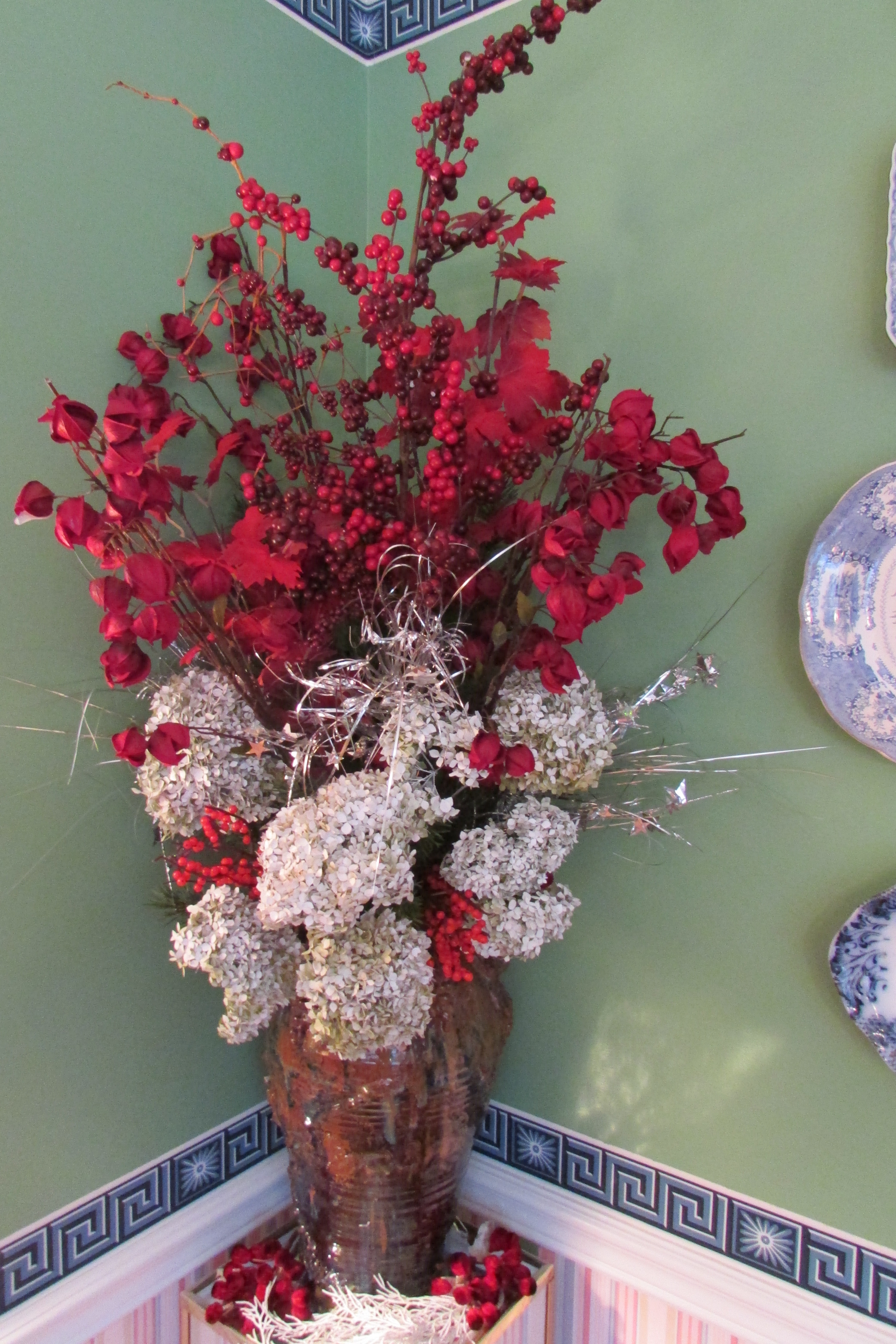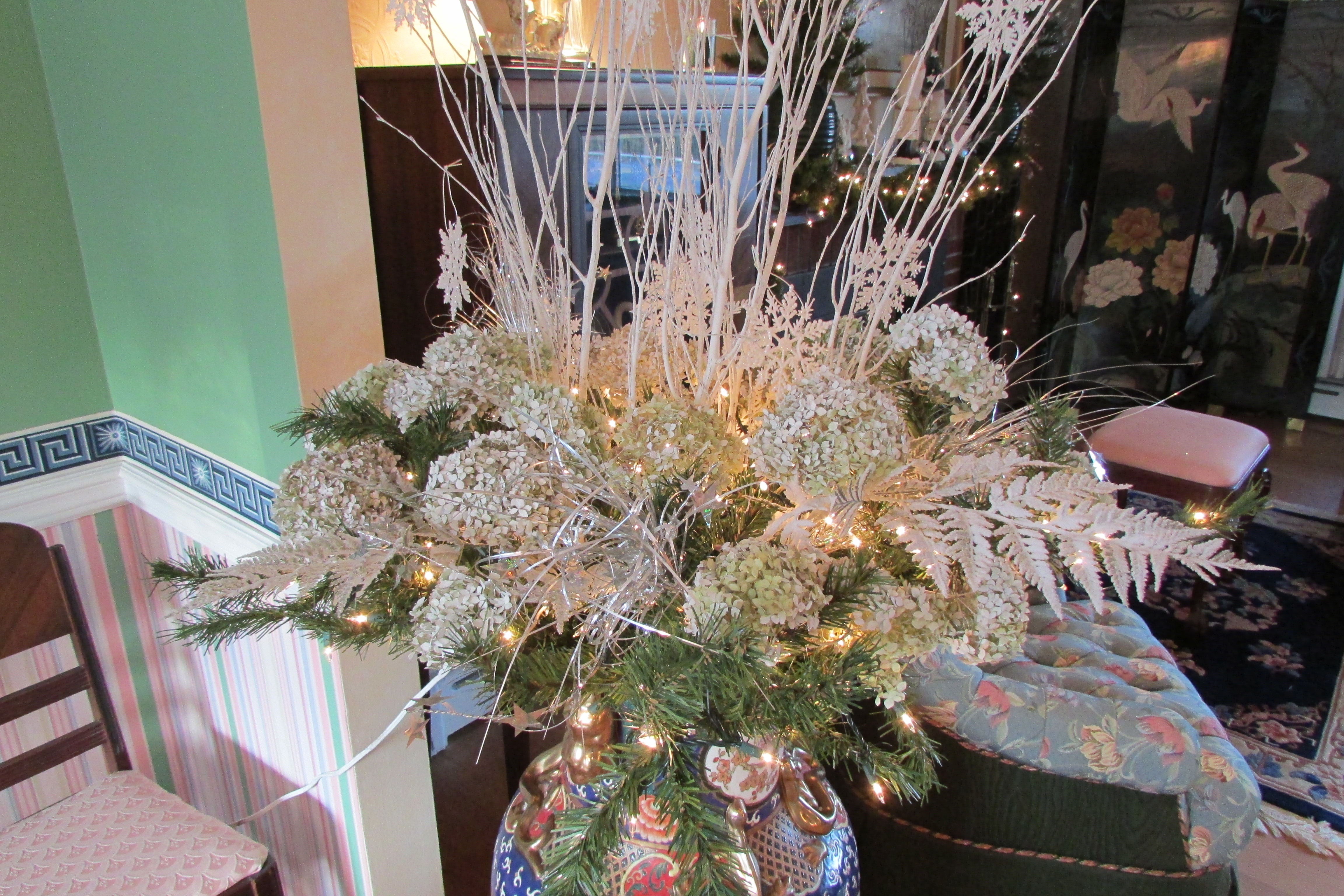 I love reading your blogs, especially the Christmas ones !! I have 16 trees in my house (all sizes) and love to decorate for the holidays !! I love how you did the arrangement in the Chinese vase and I wanted to ask you if it was difficult to spray paint the hydrangas. I would love to try to duplicate yours !!