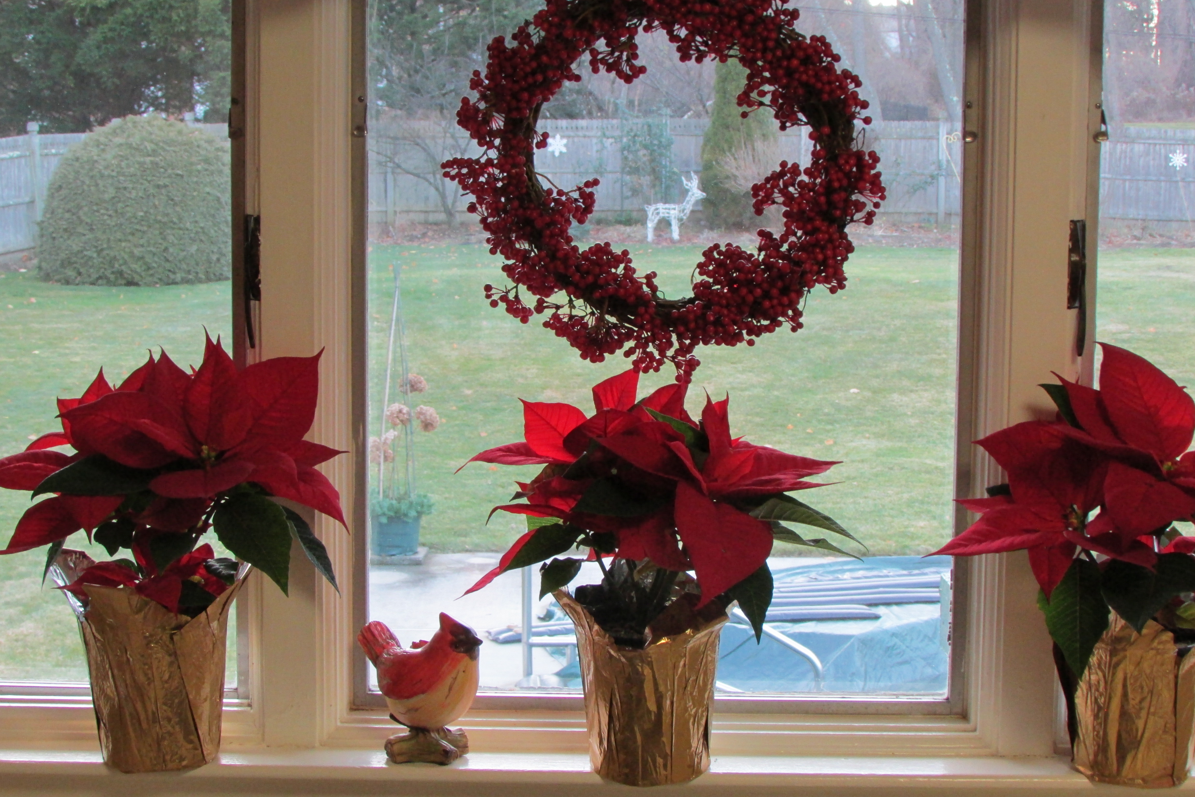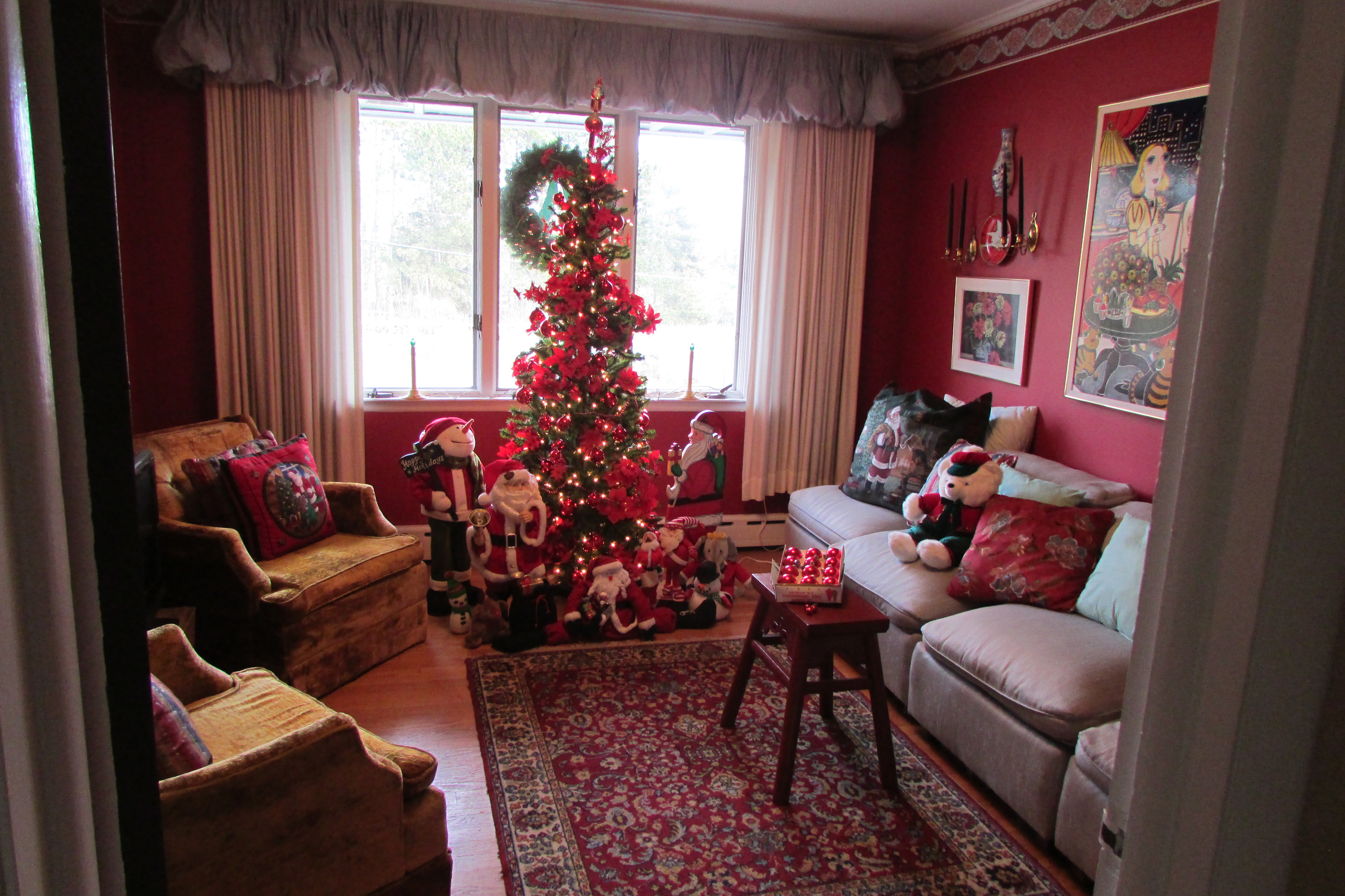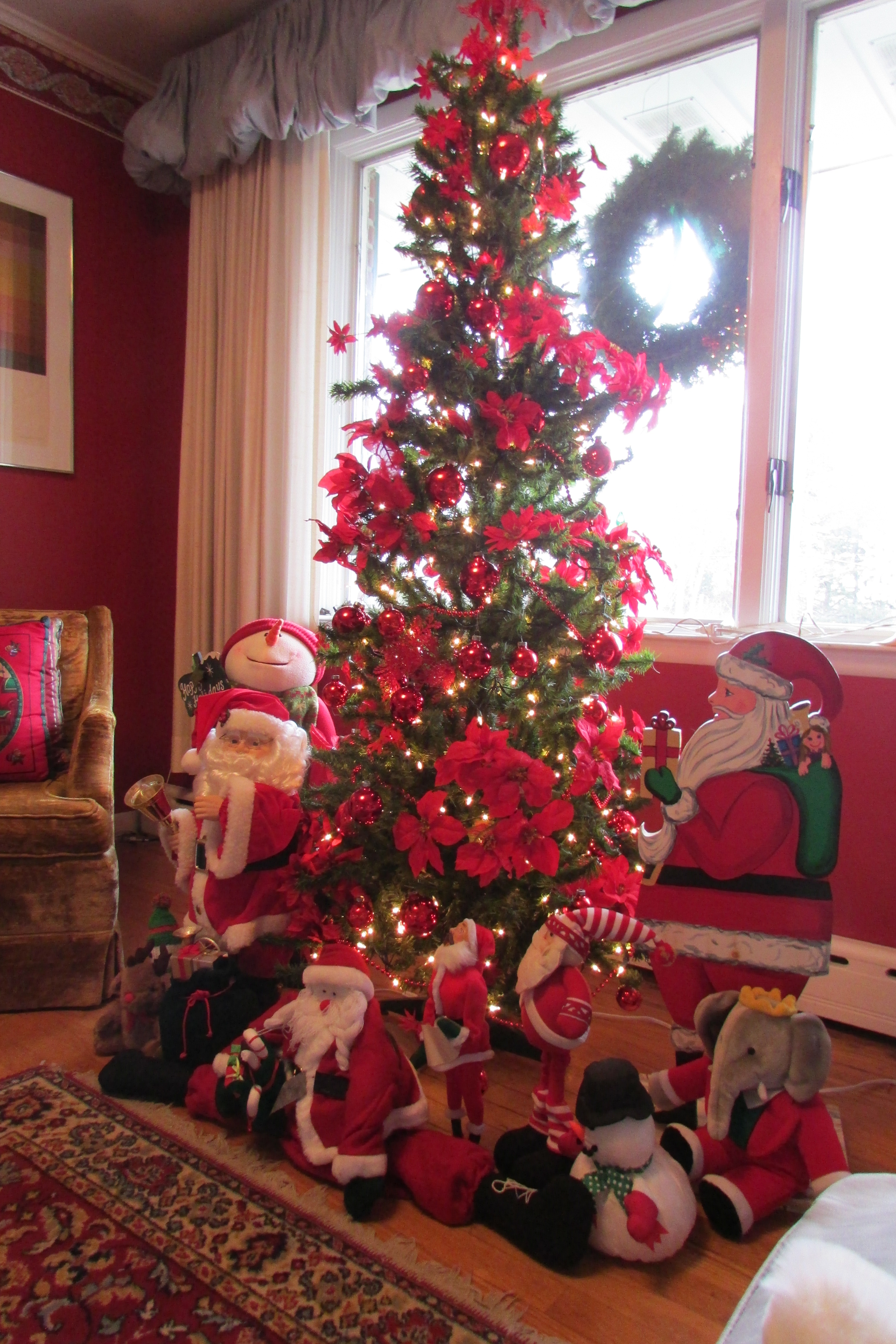 IMG_1682IMG_1695 Our final interior spot to examine is my Ming Red TV room. This year my 31-year-old Slim Canadian Spruce is covered with white lights, red bead garland, assorted sized red metallic bulbs and all different sizes of silk poinsettia flower heads and bouquets. Most years the poinsettias are used in arrangements, but this year they have been re-purposed as tree decorations.