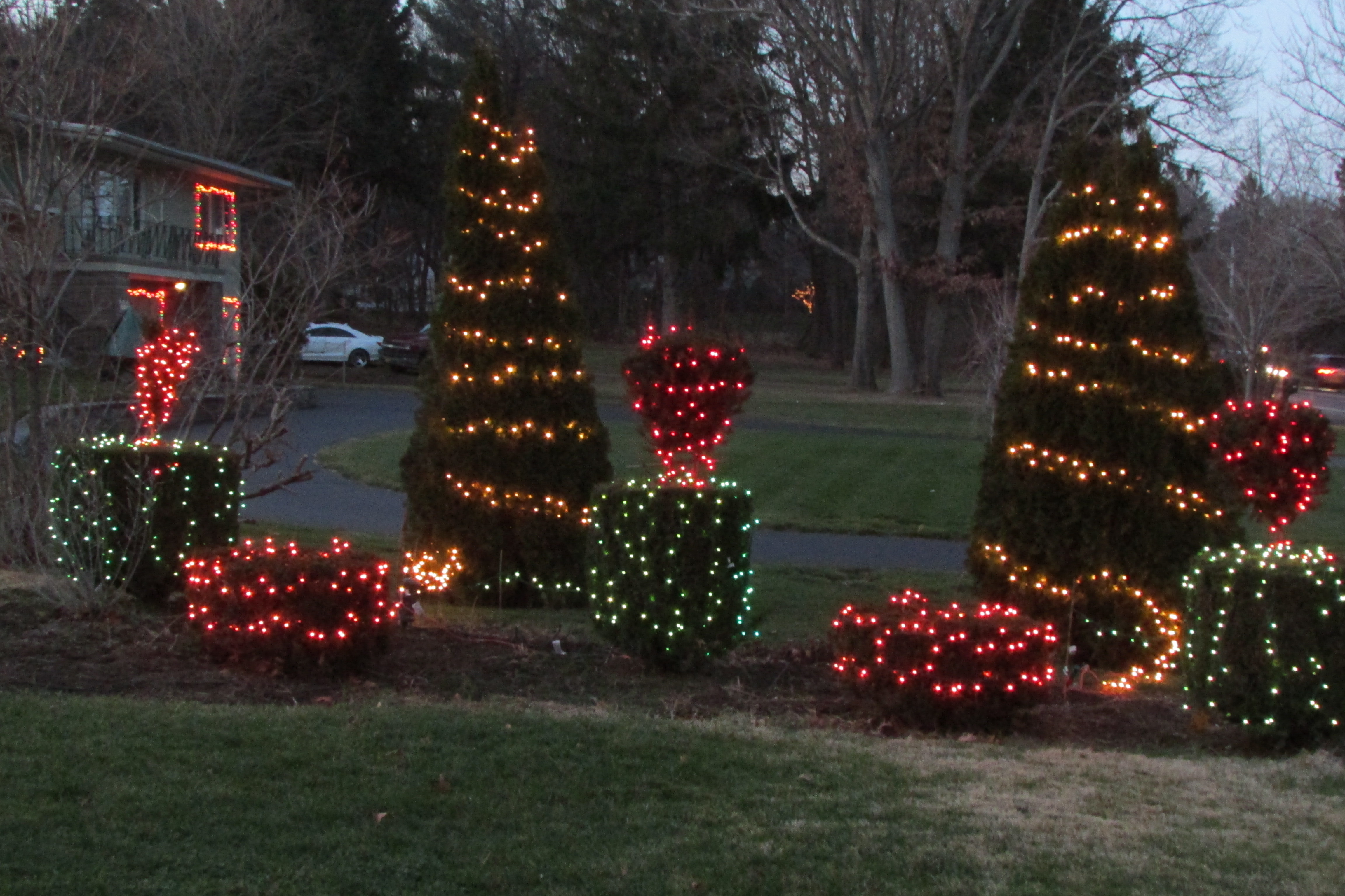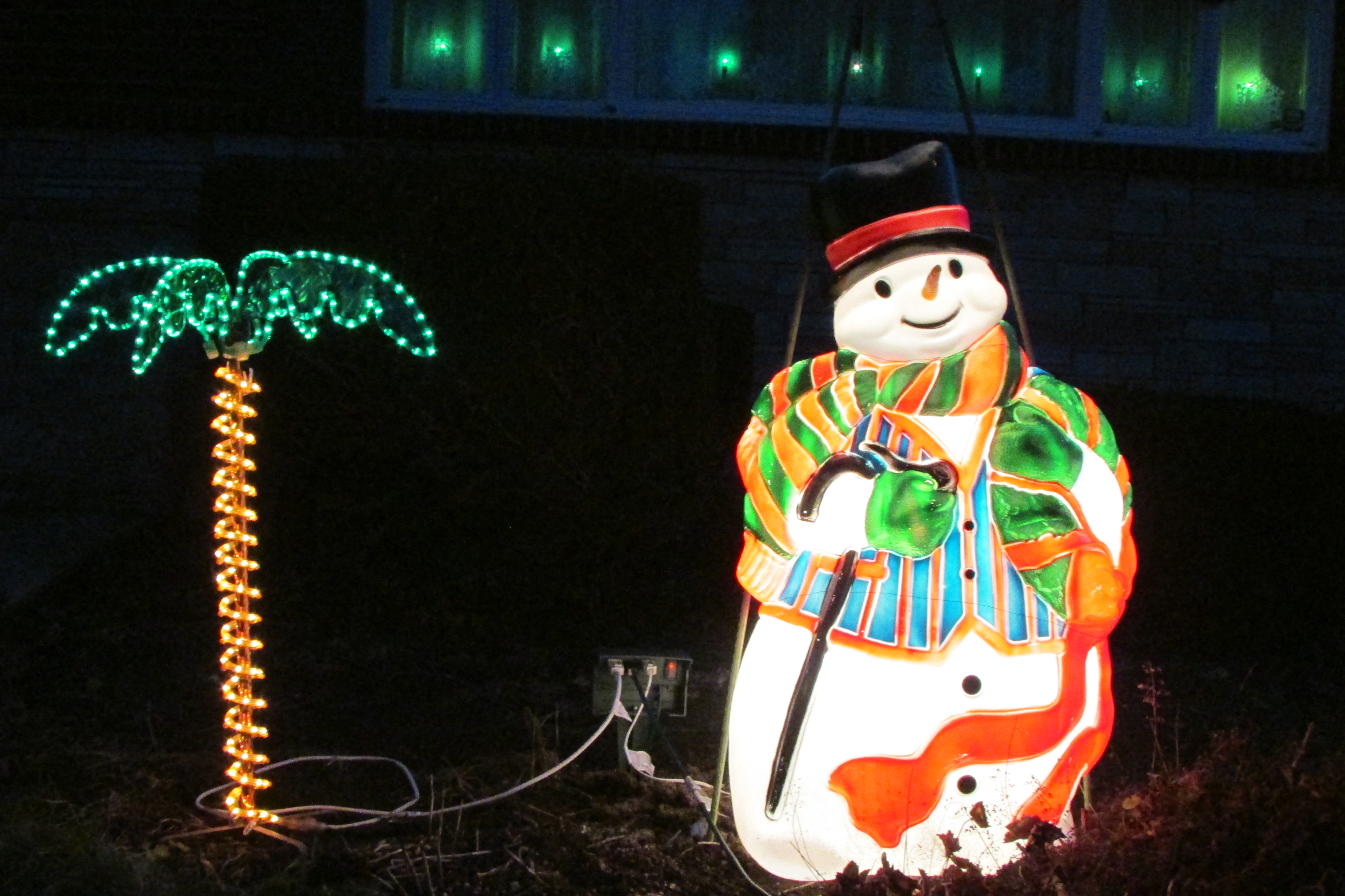 The bottom photo shows a collection of stuffed fabric Santas that are just a small part of my Santa collection, which this year I am not putting out.IMG_1674 Now we’re outside. What says Christmas and Winter more than a light up Snowman next to a Palm tree to greet guests at the front door.IMG_1651 I live in a suburban area that I feel is a bit like country by the city, but I have a major road, with a lot of traffic, that passes by my house. Each year I try to put out lights, down on the lawn, out by the road, for people in passing cars to see.  Don’t the upright yews, that I’ve trained as topiary look a bit like green Christmas packages with red bows.?