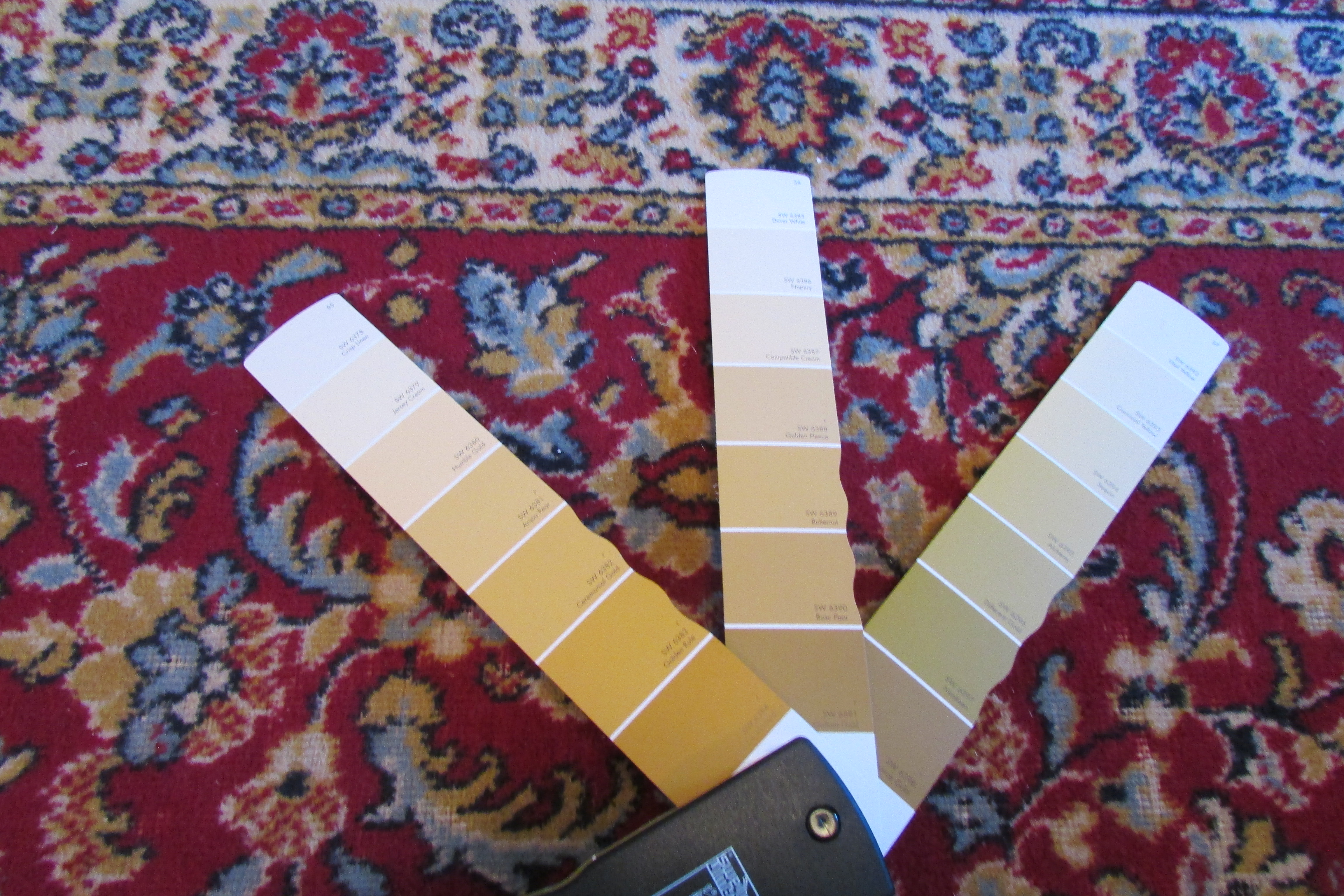 Looking at the above photo and the cover shot for this post (click on photos to enlarge) you can see that burgundy is the predominate color of the oriental carpet. Starting with the predominate color burgundy, I found three dark samples of that color that I think look similar to the color found on the carpet; they are at the bottom of the paint color strips closest to the pin that holds the Sherwin Williams paint color fan together. When looking for paint colors get samples from many different paint companies, as every paint manufacturer produces different versions of colors. No paint color will be an exact match to something like the color of the wool oriental carpet, but try to find something that looks good, even if it is not a 100% perfect.