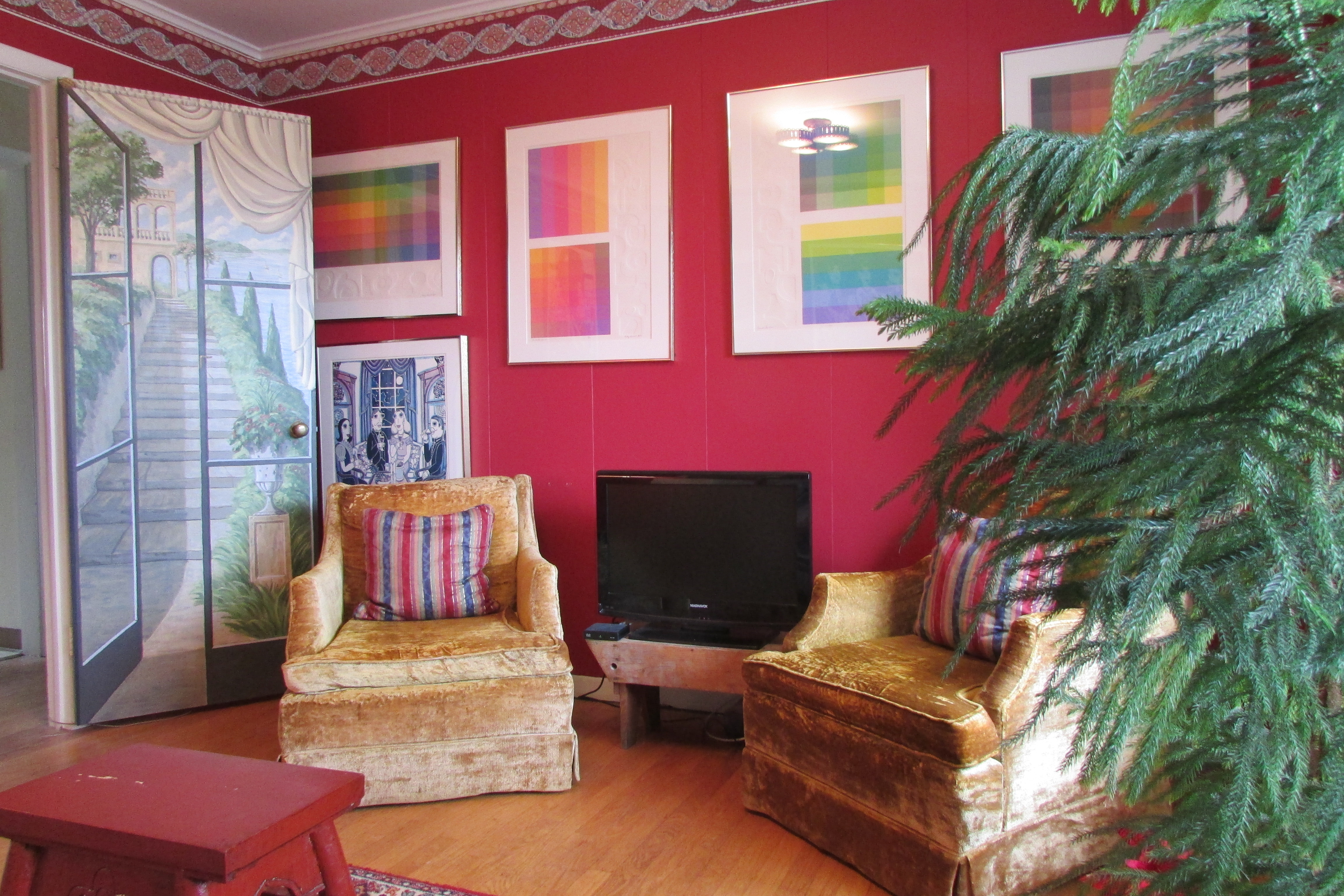 Looking from the sofa you can see the other side of my TV room. First notice the wallpaper border that runs around the top of the room, below the crown molding; it is composed of different tones of burgundy, colonial and navy blue. Secondly notice the two striped pillows on the two gold club chairs. They are mates of the one opposite them on the sofa. Look at my collection of Audrey Grendahl Kuhn original serigraphs, she is an artist friend of mine, we did shows together, back in the day. All of Audrey’s prints, as well as the door that I painted have the four colors in them that are pulled from the oriental carpet. In the foreground you see a Chinese bench, it too keeps the red working around the room.