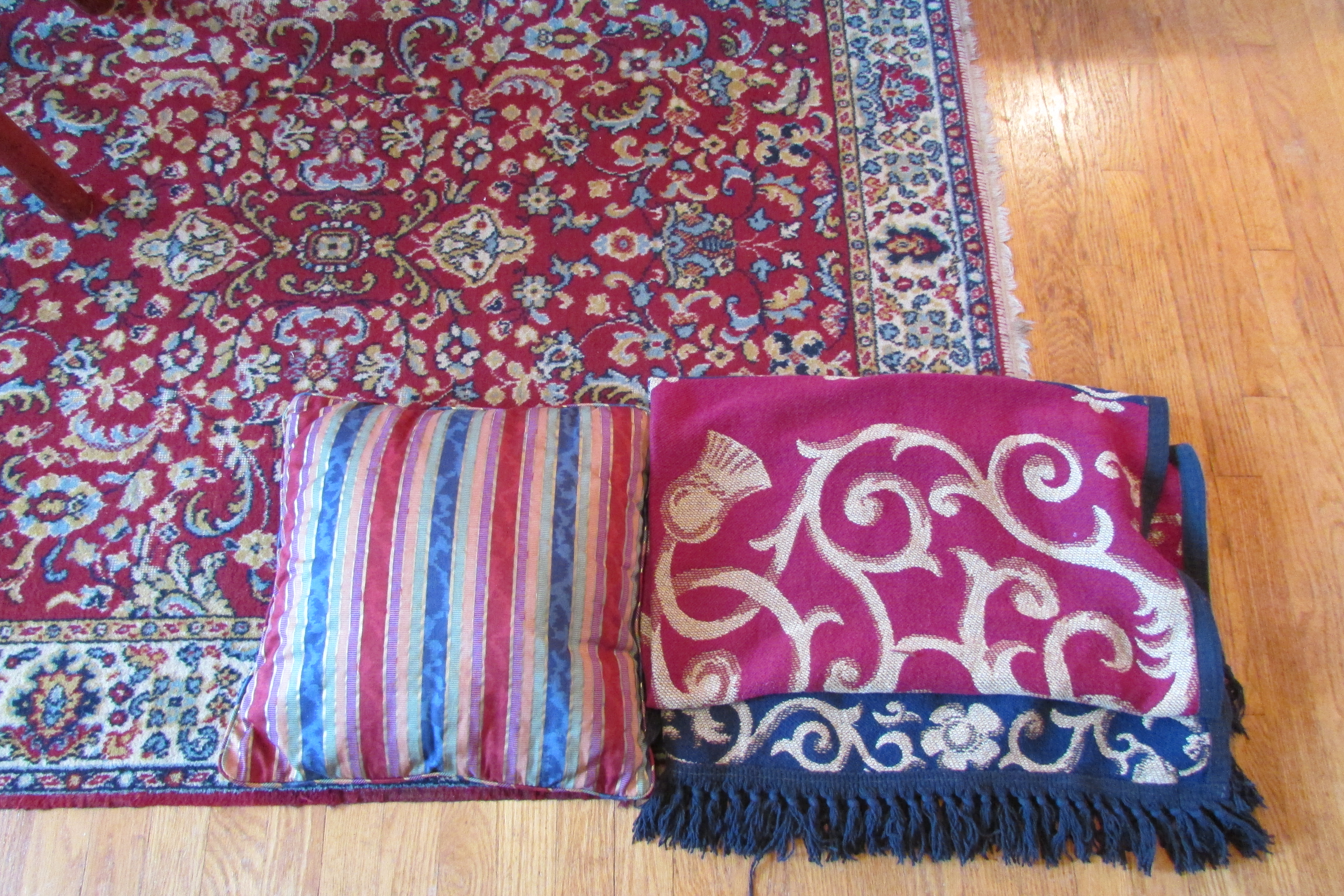 In interior decorating there are predominate, subordinate and accent colors in a room, and there are also predominate, subordinate and accent fabrics, and in this room the throw is the predominate fabric, because of its pattern size. The second most seen fabric (subordinate fabric), which also has all of the colors seen in the carpet are the striped pillows. One is on the sofa, and two others are on the gold toned club chairs on the other side of the room (seen in the next photo). The striped pillows also have a green stripe in them, that is why the two small green pillows also work in the room. At the center of the sofa is a pillow with a solid background. Because of the large amount of its background color, and its subdued pattern, in a way it reads as a solid. The oriental carpet, even though it was the inspiration piece, really turned out to be one of the accents. The next photo shows the throw, a striped pillow and the rug next to each other so you can see the different sizes/strengths of the patterns.