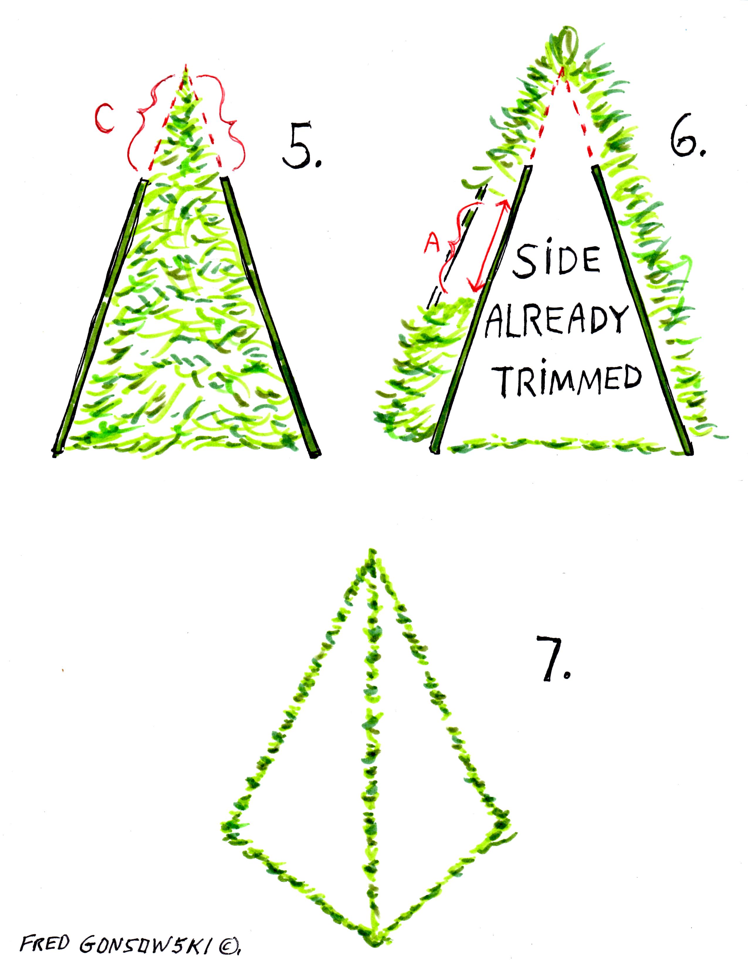 Now look at Illustration 5 labeled C. After clipping the middle and bottom of each side of the pyramid and stepping back, many times, to see if both sides are equal, for angle, it’s now time to trim/form the top. Starting on one side, slowly trim upwards from the top of the middle in the direction of where you think the point will be. You don’t want to trim from where you think the point should be, working downwards! After doing one side, step back, look and start the other. After trimming the second side, step back again and see which side, or if both side needs more work. You have just formed one half of your pyramid, as seen in illustration 6.