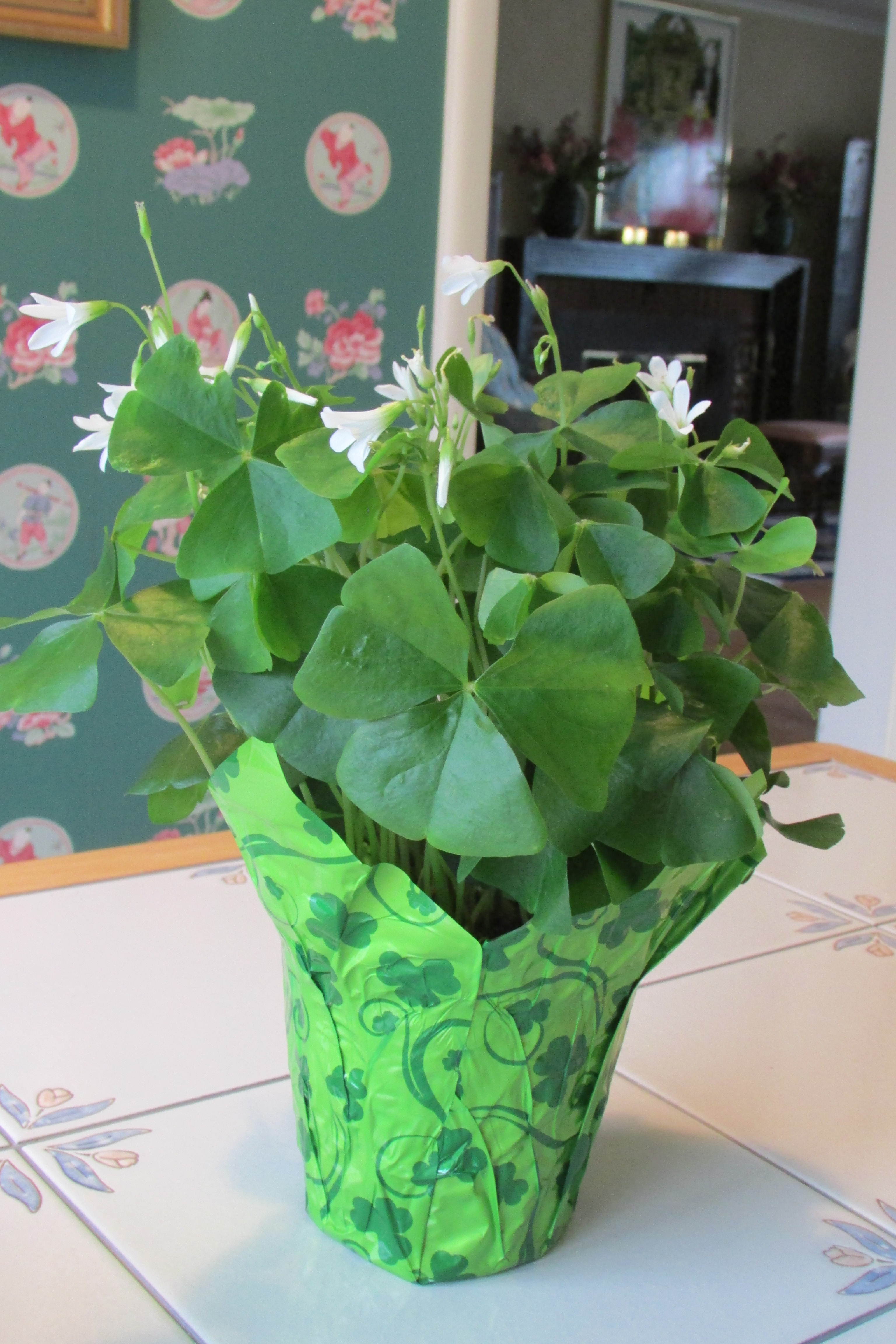 Saint Patrick’s Day is almost here, and in super markets and florist stores everywhere you will see the Shamrock Plant also called Oxalis. The Shamrock plant, which some people think brings good luck is a member of the wood sorrel family. The interesting thing about the Oxalis is the way that it opens its leaves by day, and how it closes them at night. The shamrock plant is most often seen in solid green (like the above photos), but there are also ones with burgundy-purple colored leaves and some that even have a green leave with a burgundy-purple center. Depending on the plant chosen, the oxalis will have either a white or soft pink trumpet-shaped flower. The shamrock plant which is inexpensive ( I paid $3.33 for mine) and is easy to grow, can be enjoyed in any room of your house, as long as you have it out of direct-strong light. The oxalis would be happy, set back from a bright sunny windows, on an end table, kitchen counter, the tank of a toilet, or even on a dining room or kitchen table. Being that the plant opens and closes its leaves daily it is best placed in a location where people congregate often, so they can see its movements.