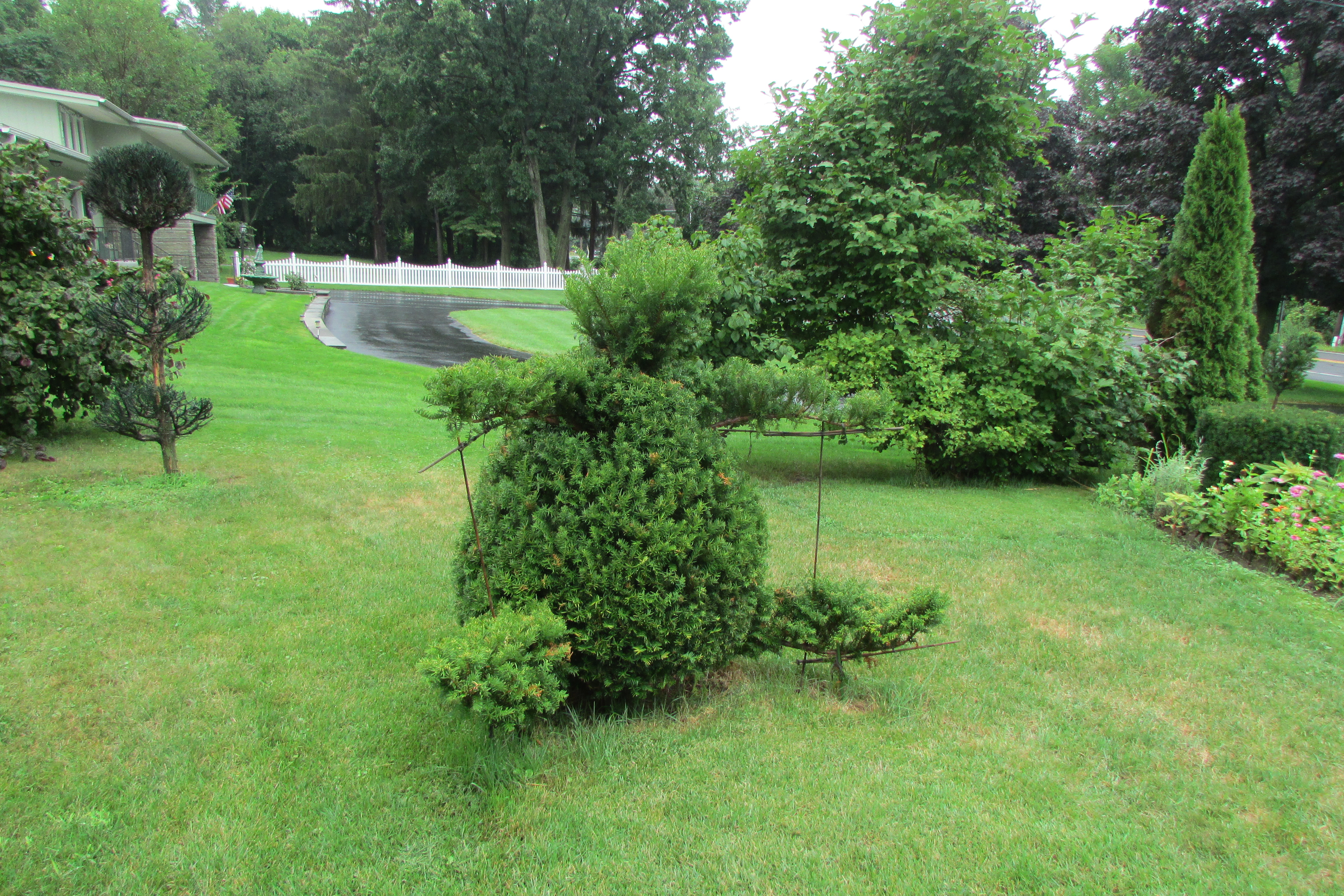 The above photo shows a bear topiary that I’ve started from a cone-shaped yew. What you are looking at is about four years growth. I hope in a year or two it will be more refined, but even now people see what I’m going for, without me telling them what it is.