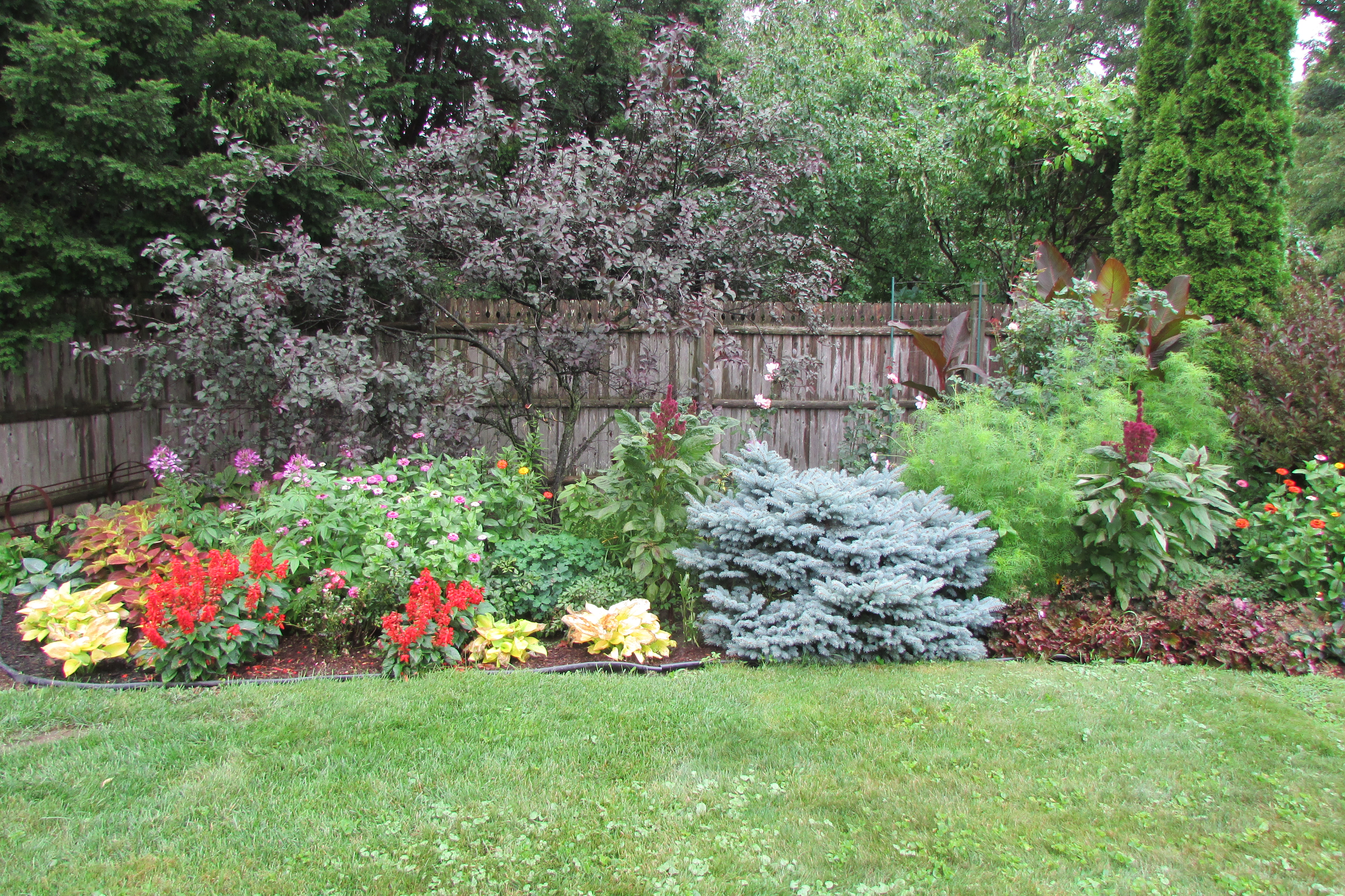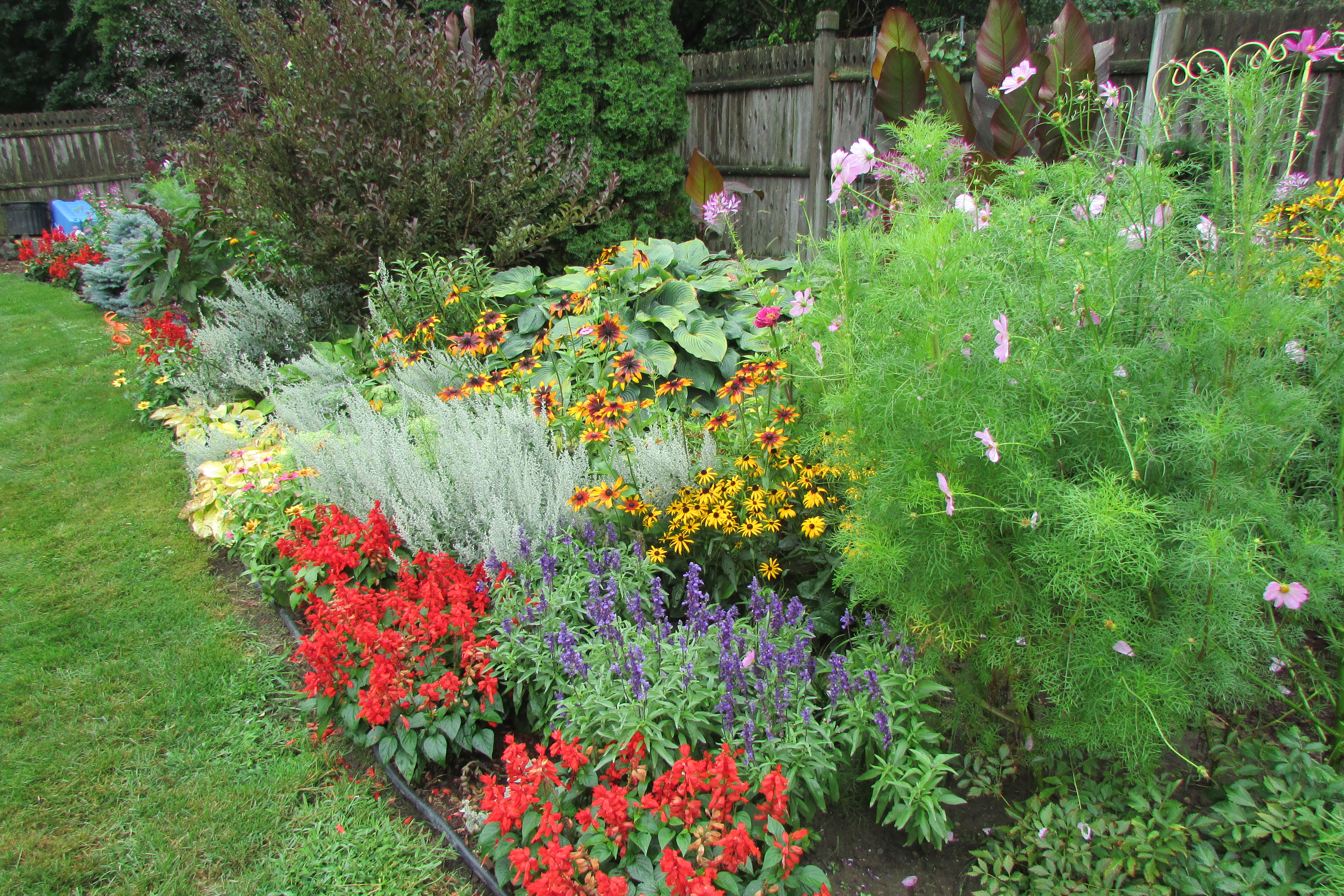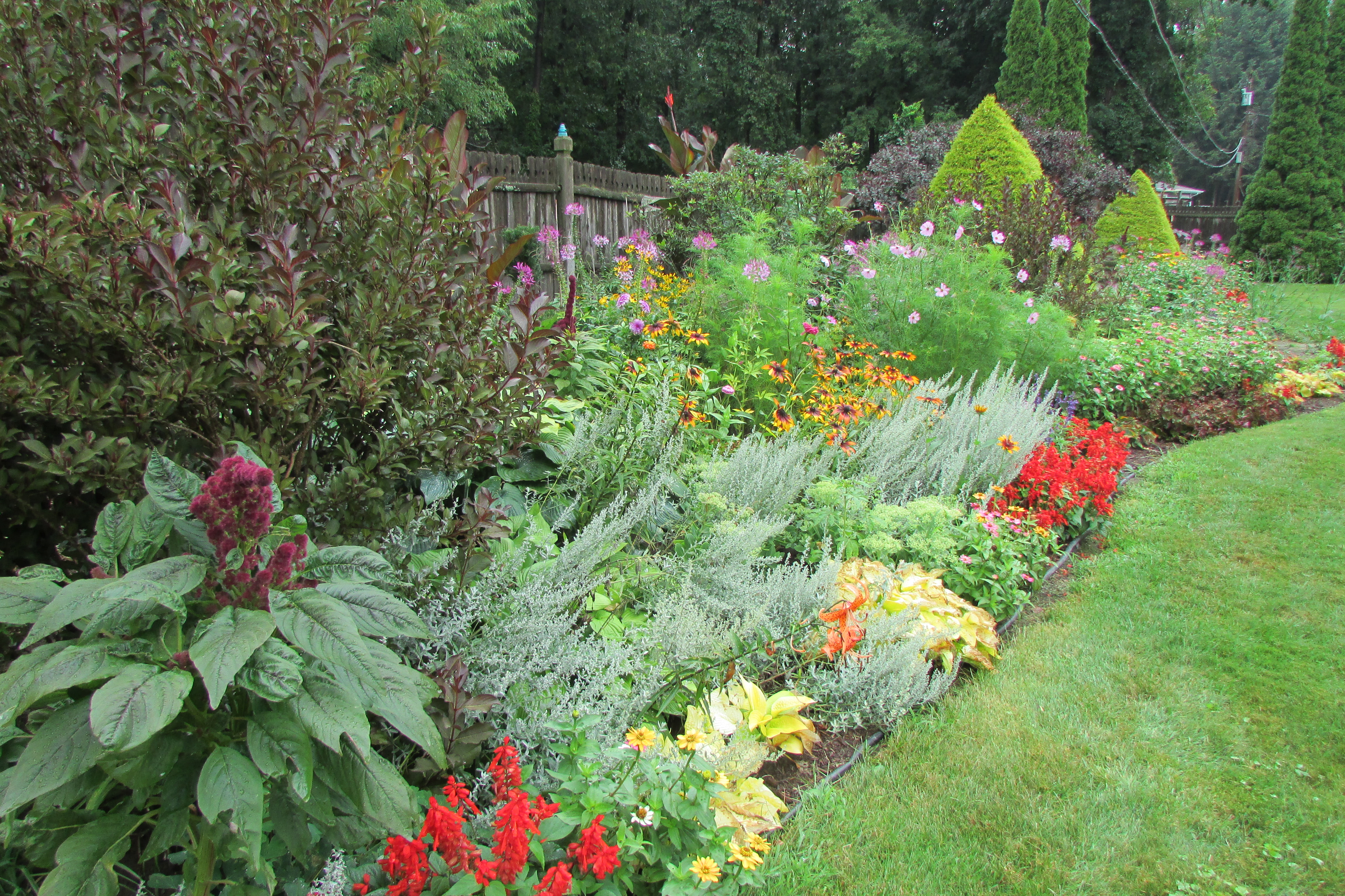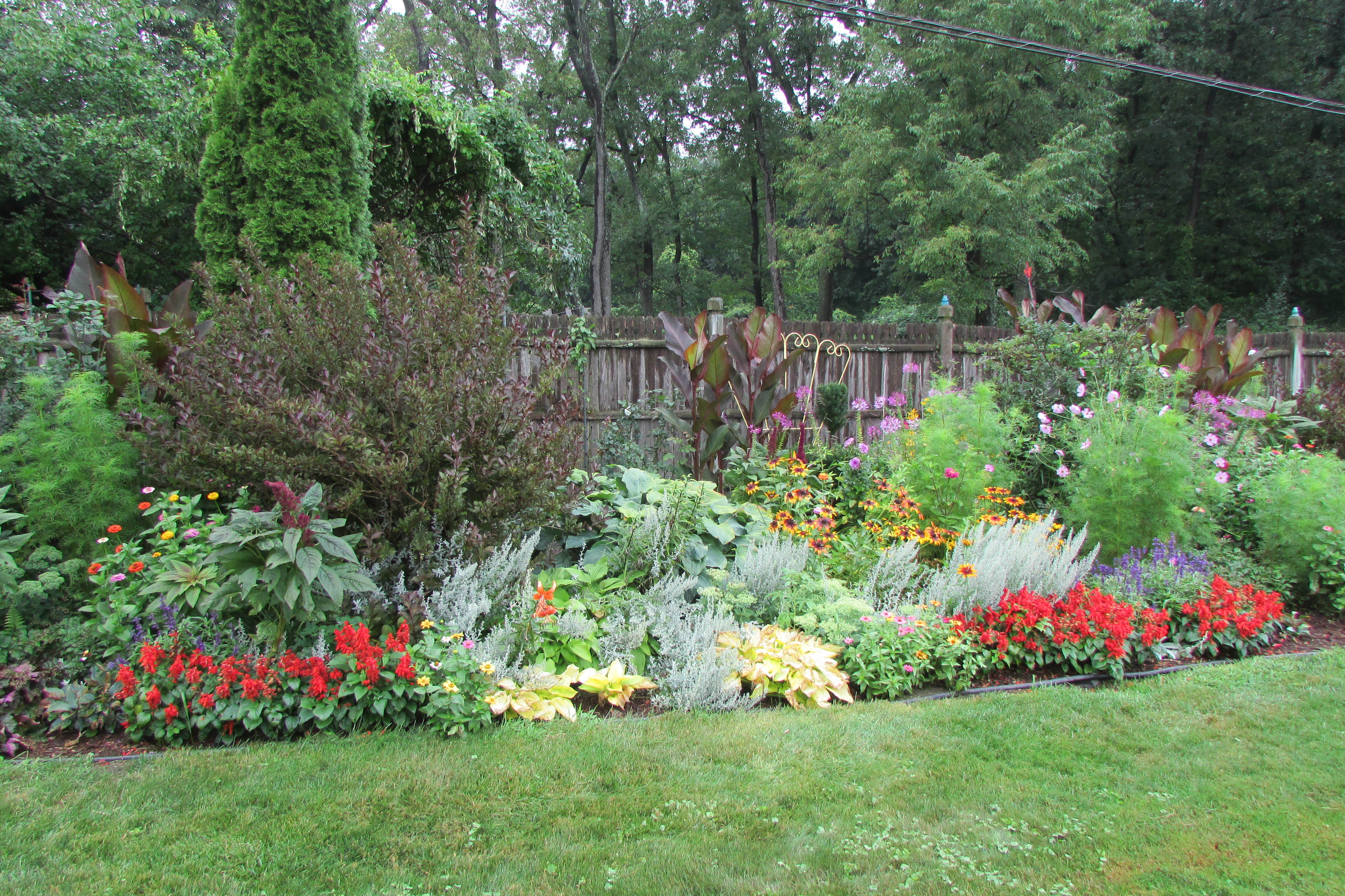 • Hi there Suzanne, no drip irrigation, just an oscillating sprinkler that I move once each hour to different parts of the garden. Yesterday was just the right time for me to photograph the garden, it had just rained and the sky was a bit gray. I’ve taken pictures a few other days, but the light was soo bright and things looked to harsh. This summer has been dry, but about a week ago we had about five inches of rain over two days that hydrated everything. The lawn is looking a bit better, as the drought dried out the lawn and made it crunch when it was walked on. The garden has been divided in many places, all of the annuals that I’ve started from seed, and the dahlias that are about to bloom and the cannas that are in the beds make it look fuller than it really is.