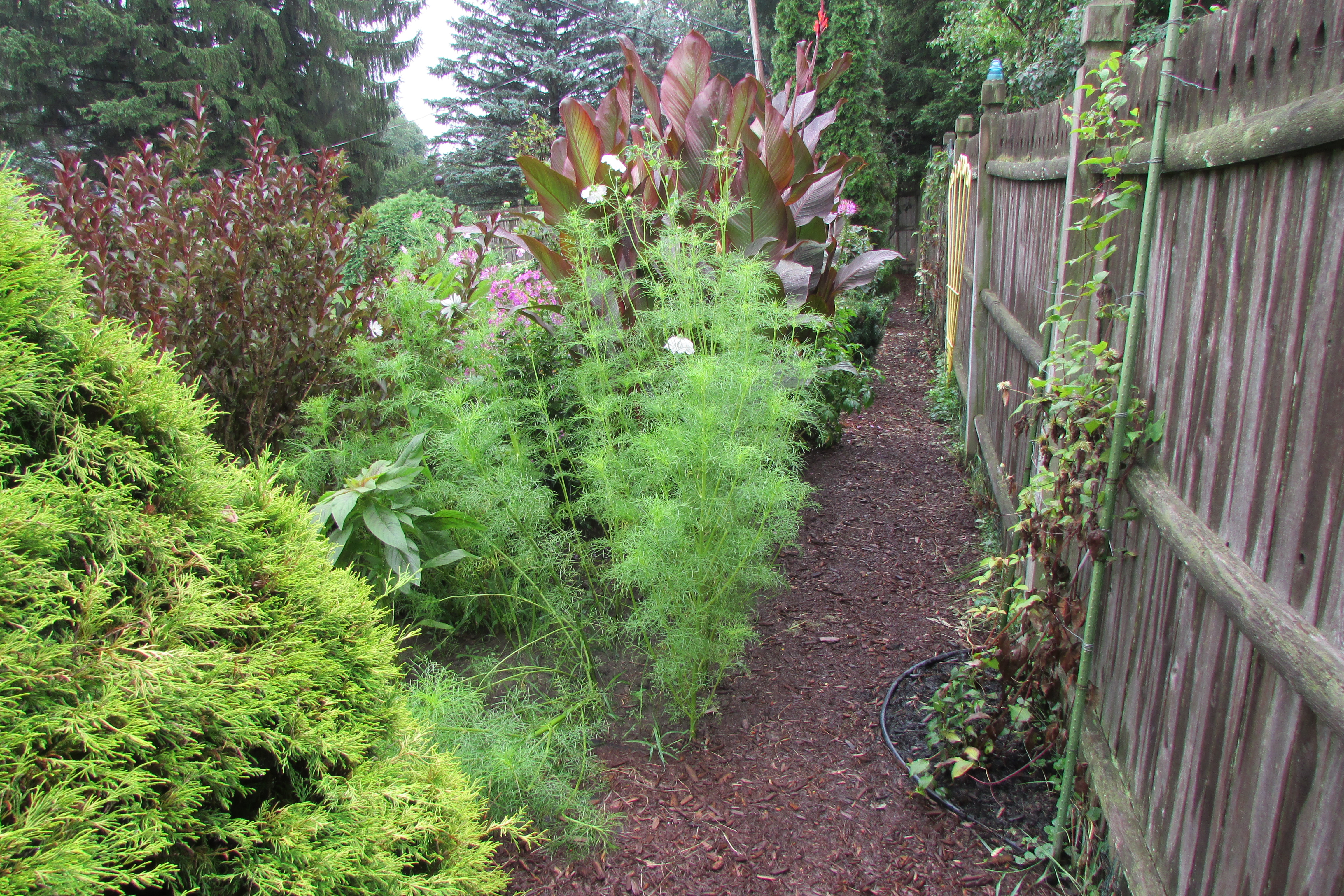 The above photo shows the space between the fence and the backside of the garden. This year, to make it easier for me to walk behind and weed, I put down Dewitt 12 year weed barrier landscape fabric that is three feet wide and covered it with dark brown cedar mulch. I just love how eliminating the three feet of garden made it soo much easier to plant and maintain. The three-foot space also allows air to pass behind the plants and improves the look of the garden.  After eliminating the three feet of garden space I wish I had done it twenty five growing seasons ago.