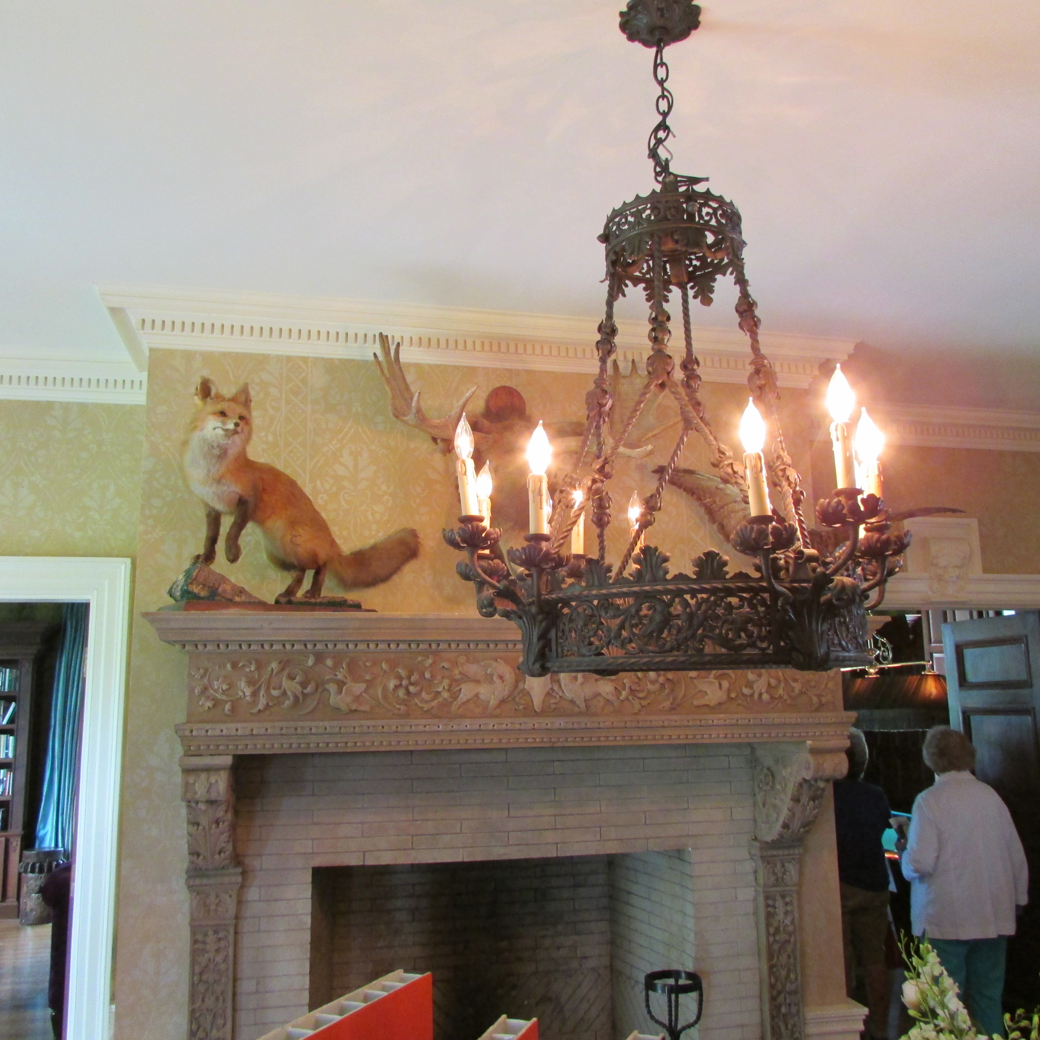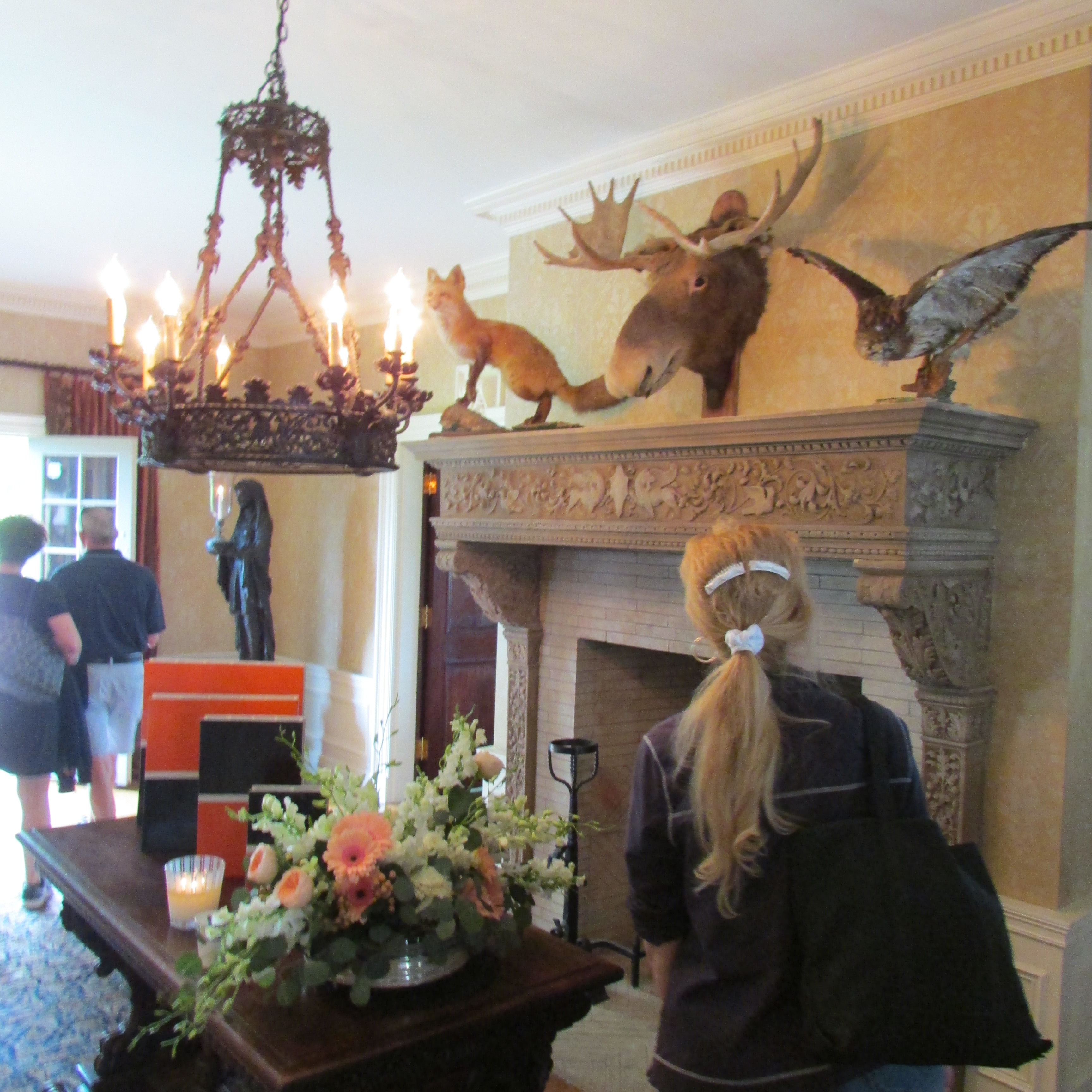 Once inside the great hall, which runs from the front of the house to the back, guests are greeted by a trio of taxidermy animals that look down from their lofty perch atop the fireplace mantel.