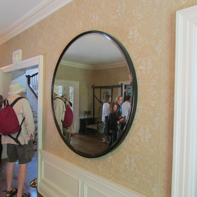 A large round mirror visually opens up the wide front hall even more, bouncing light around and reflecting things on the other side of the room.