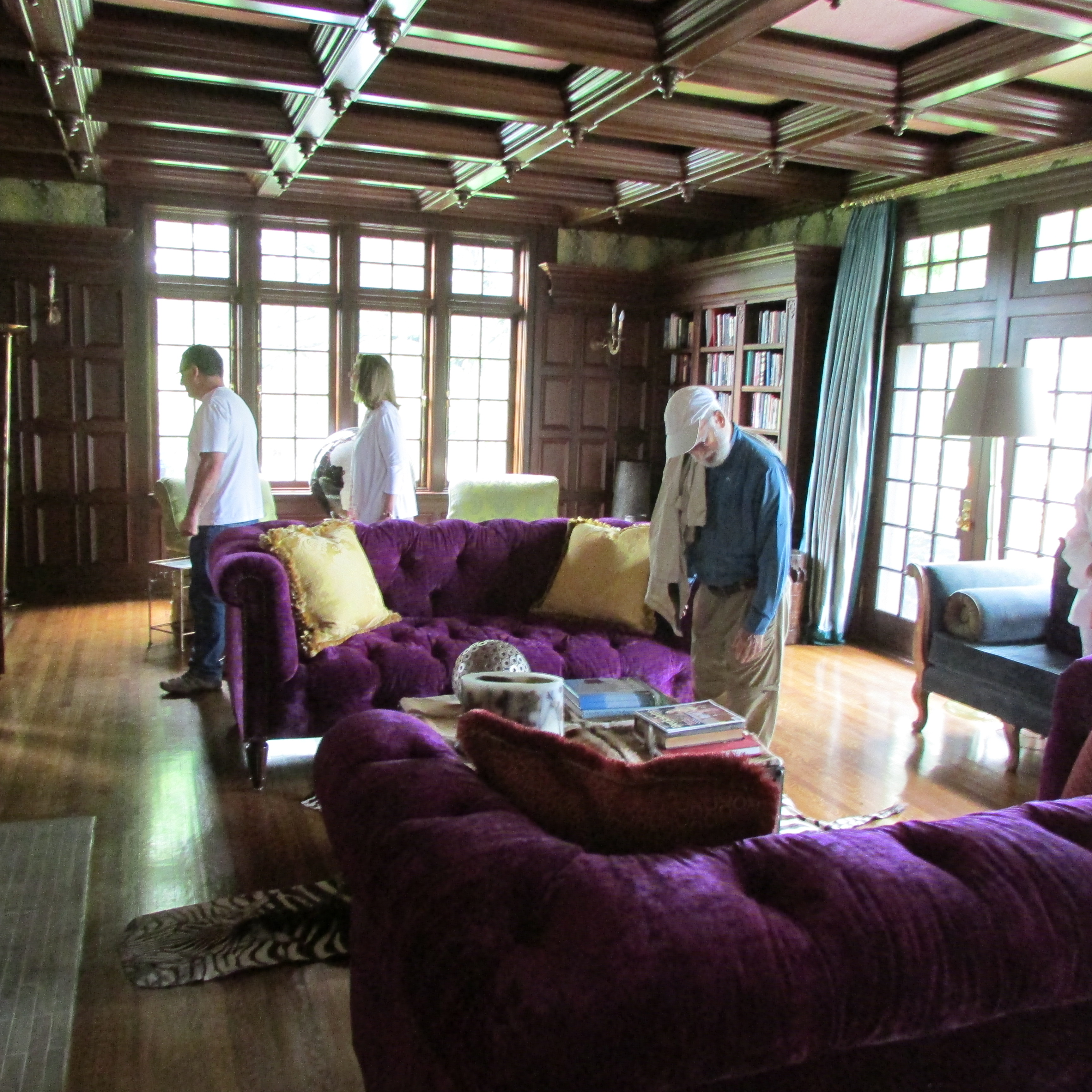 Looking at this room, other than the dark brown color of the wood, the colors used in the space are the bright purple of the sofas, the celery greens seen on the pair of club chairs (and possibly repeated on the big window seat cushion by the billiards table). The green tone is also seen on the wallpaper that runs around the top of the room. The color blue is seen on the drapes and the sofa in the window opposite the fireplace and looks to repeat as the cover color of the billiards table. A pinkish-red color appears on the light fixture over the billiards table and is also seen on a couple of pillows on one of the sofas. If you look carefully at the ceiling in the photos, you will also notice that the light green and pinkish-red is the color of the paint in the different boxes that make up the coffered ceiling. A golden yellow is also seen on some sofa pillows. (As stated before, interior decorating is all about moving/ repeating the same colors and even patterns in different places in the same room, which keeps the eye moving from one place to the next). Finally, the dark brown of the woodwork is also repeated on the floor as the color story of the zebra looking rug.