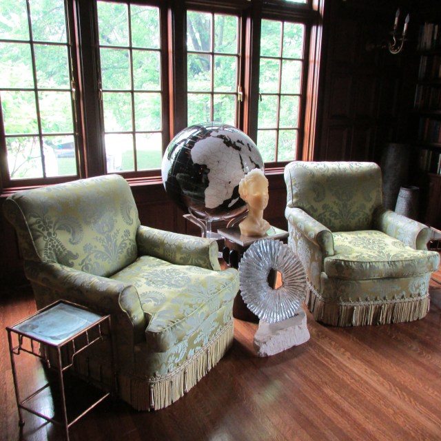 This furniture arrangement composed of two club chairs, a large globe, side table with bust, end-table and modern sculpture are an important counterbalancing grouping in the room. The above items, counterbalance for approximate size and visual weight, the billiards table seen on the other side of the room.