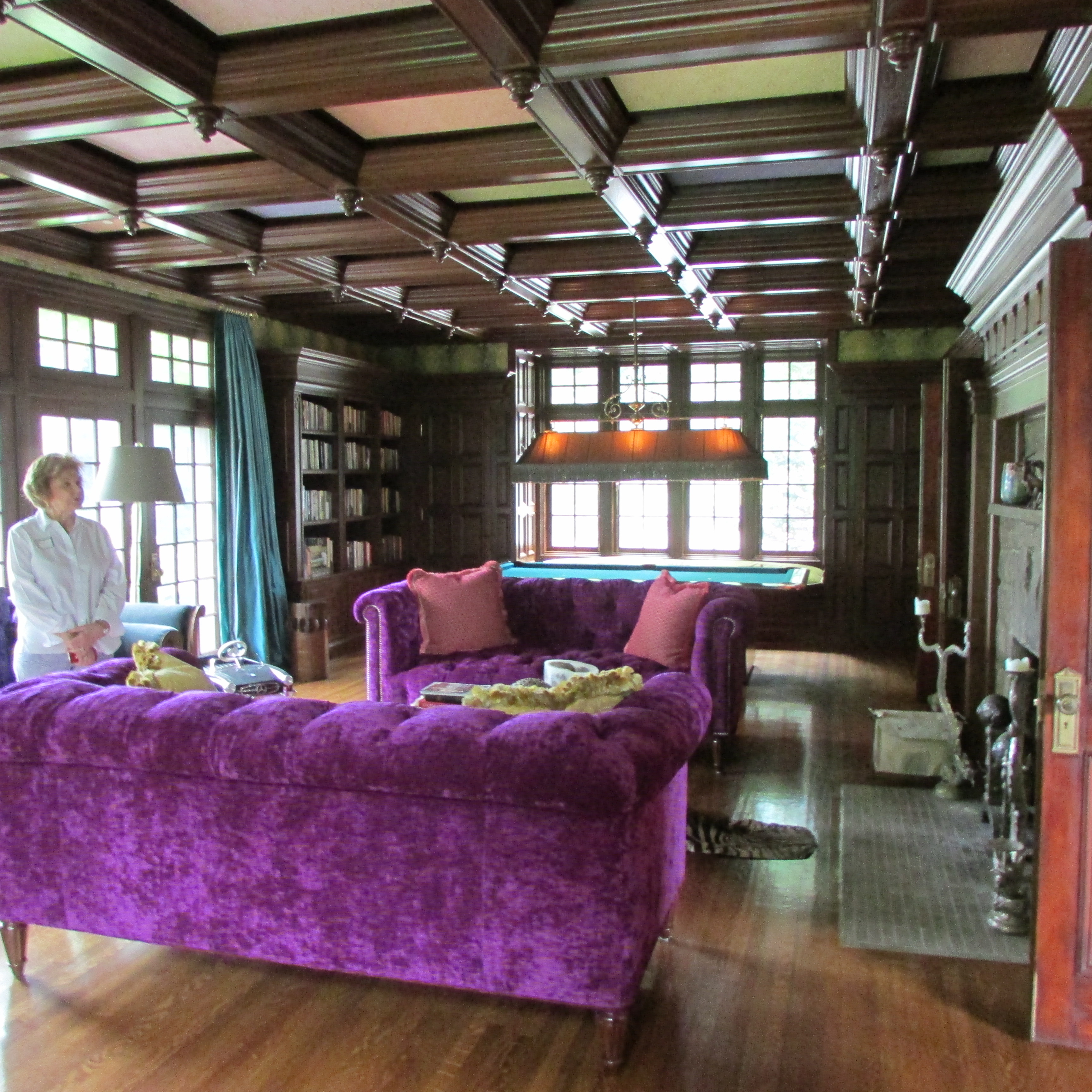 Interior decorating is all about balancing weights, and in this room with a lot of heavy woodwork, the bright/rich purple sofas perfectly counterbalance all of the wood, and adds a warm and fun pop of color to the space. The visual weight of the purple sofas also balance the dark visual weight of the cover of the billiards table.