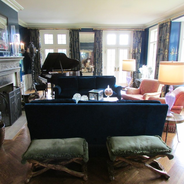 Exiting the library, and crossing the great front hall, we are now in Dorinda’s salon (a salon in a Berkshire Cottage is a living room anywhere else). Highly glazed, possibly Venetian plaster walls, beautifully reflect light coming in from every window. The magnificent room looks like you are in a lacquered box.