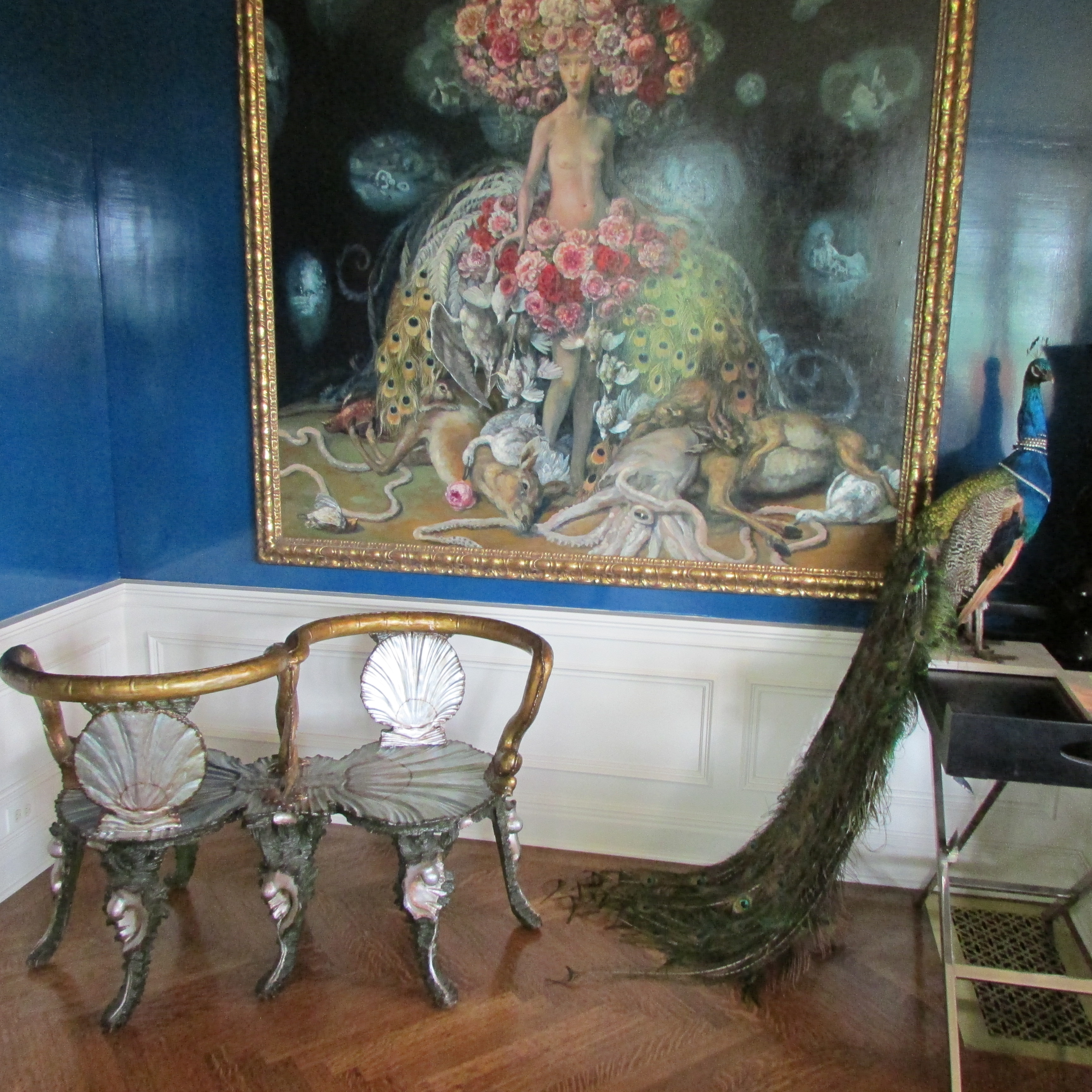 Some of the decorating high-lights in the room include the large painting, which could have been the inspiration piece from which all the color choices (blue, pink, green and gold) used in the room could have been culled, the Venetian grotto tete-a-tete bench and the stuffed peacock. (notice how the feathers of the peacock also appear in the painting).