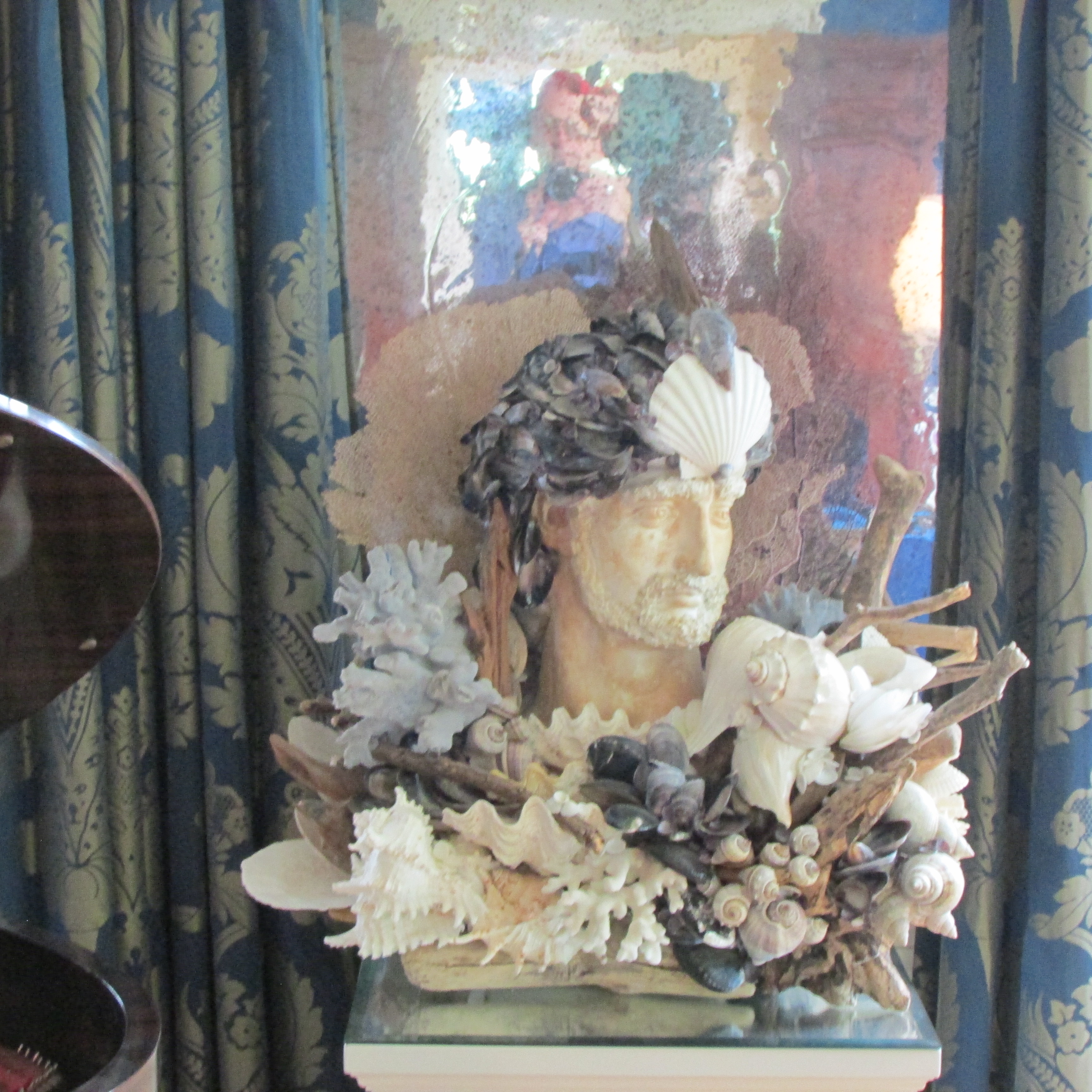 A bust of Poseidon (Neptune) the god of the seas and oceans, adorned in assorted shells and coral observed visitors from his pedestal on the far side of the room.