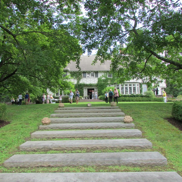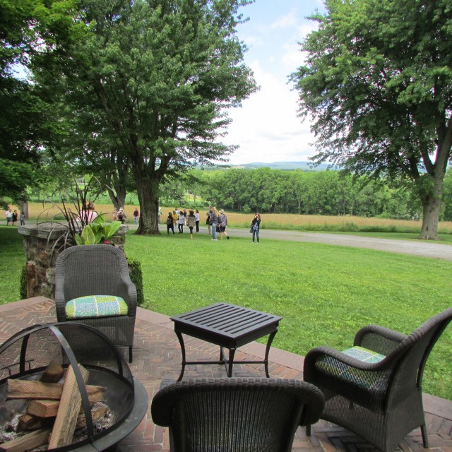 My last photo for this blog post and tour of Dorinda Medley’s Blue Stone Manor is from one of the patios, looking down from the house to the entry road, with views of the lawn, field and mountains in the distance. Garden tour guests are seen walking back to the buses to go on to the next estates.