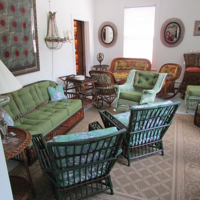 On the second floor of the Dawn Hill Antiques building is  Upstairs Antiques which consists of Antique Wicker, Glenn Allard of Patina, John Peden and the Nemati Collection.   The upper  rooms are filled with gleaming brass and polished copper, a room showcasing gorgeous wicker furniture, and other spaces displaying different kinds of unique finds.