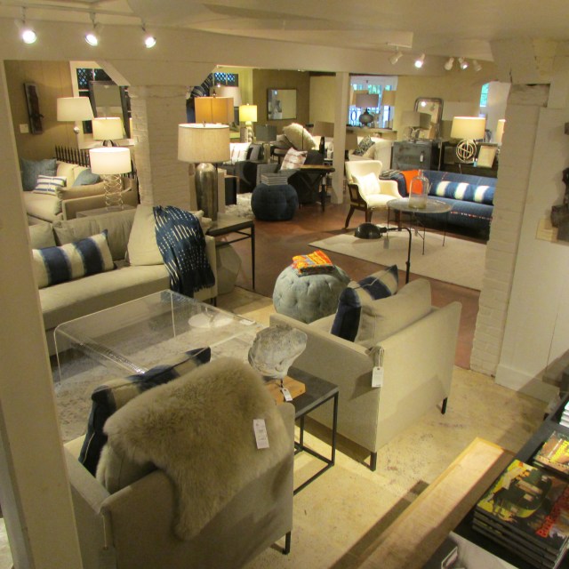 The above two photos show part of the furniture room seen on the lower level of the building.  What I want you to look at is how the color blue (in both medium and dark tones) is repeated many times across the space, which unifies it.  Look at how the blue appears as a stripe on pillows and throws.  Notice how that same dark blue is part of the color story on an upholstered bench, a poof, and in the second photo, a sofa is upholstered in it.  Interior decorating is  all about moving color and pattern around a space to keep the eye moving from one spot to another.