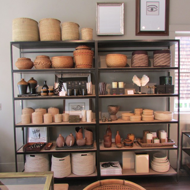 The above photos show the first room you see when entering the store and a detailed view of some of the offerings.  The collections of decorative elements presented, I would say, are transitional, so they would work well in a rustic environment or in a very industrial looking city loft.  When I look at the different baskets and other vessels, the words “primitive, tribal, and modern” come to mind; but for some reason I could also see some of the baskets and glass hurricane shades used in an 18th century house.