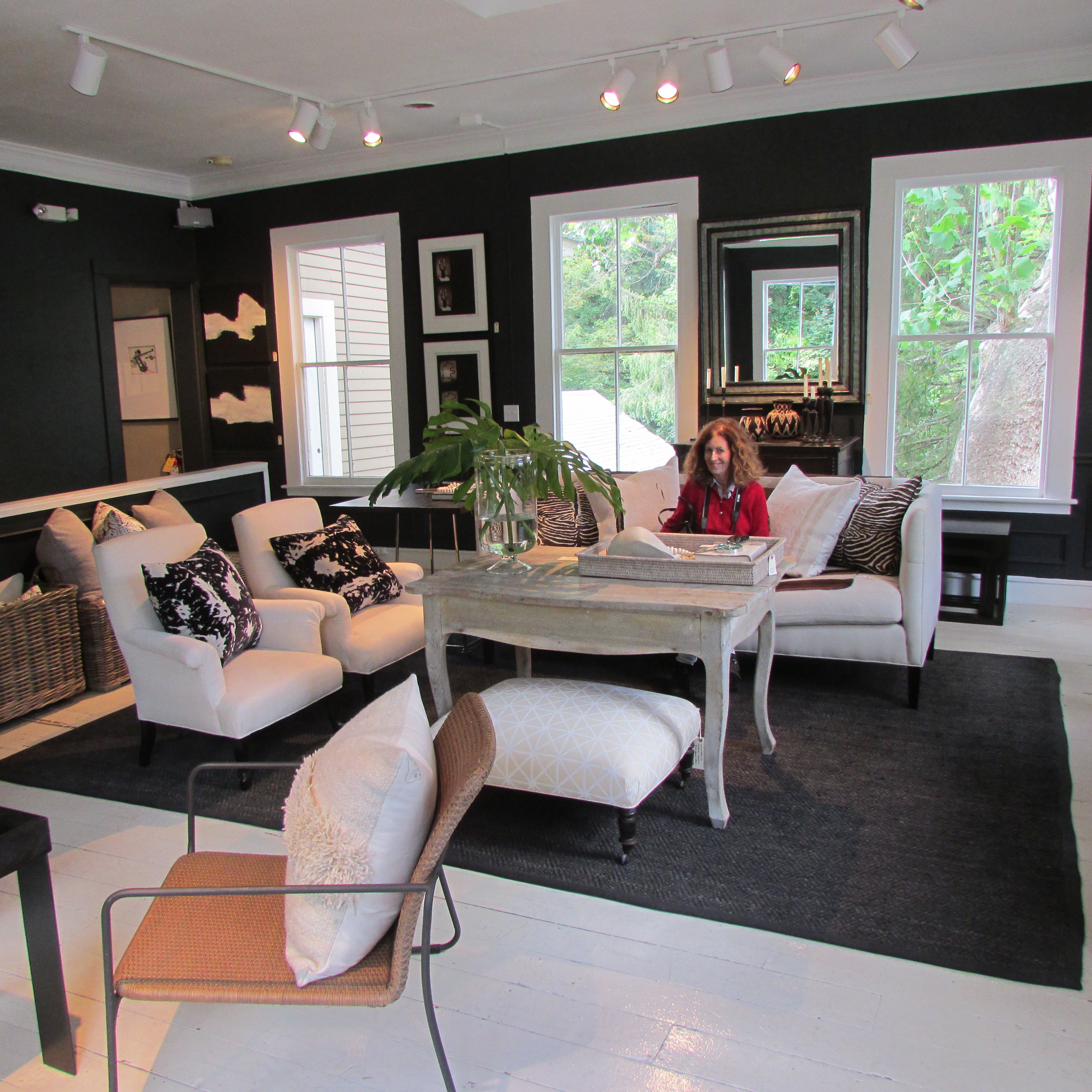 Once upstairs you are met with quite a visual surprise.  You are now in a black room that is so alive and full of light.  The space is soo chic and sophisticated, and is made up of an  eclectic mix of furniture and accessories.