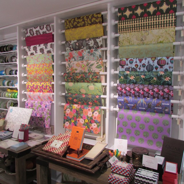 On the second floor of DK Schulman is a wonderful display of wrapping papers, seen above.  The papers would make any gift stand out above the rest for presentation, but I think the papers would make the most beautiful art works.  Just stick a sheet of wrapping paper (costing about $5. per sheet) in a frame, and you have  instant wall decor.  What a perfect pop of color for a kids room, a dorm room, or anyplace where you would want something fun to look at.