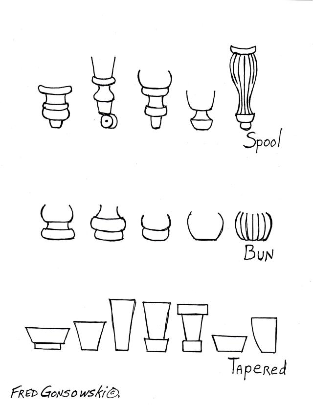 The above three illustrations show a variety of different styles of feet that are often seen on furniture with exposed legs; they are classified as Spool, Bun and Tapered. The spool, bun, and tapered foot is often seen on sofas and chairs, but you will also see those three shapes used as part of the design of end-tables and coffee tables, dressers and chests, the feet on bedroom furniture, and some dining room pieces.
