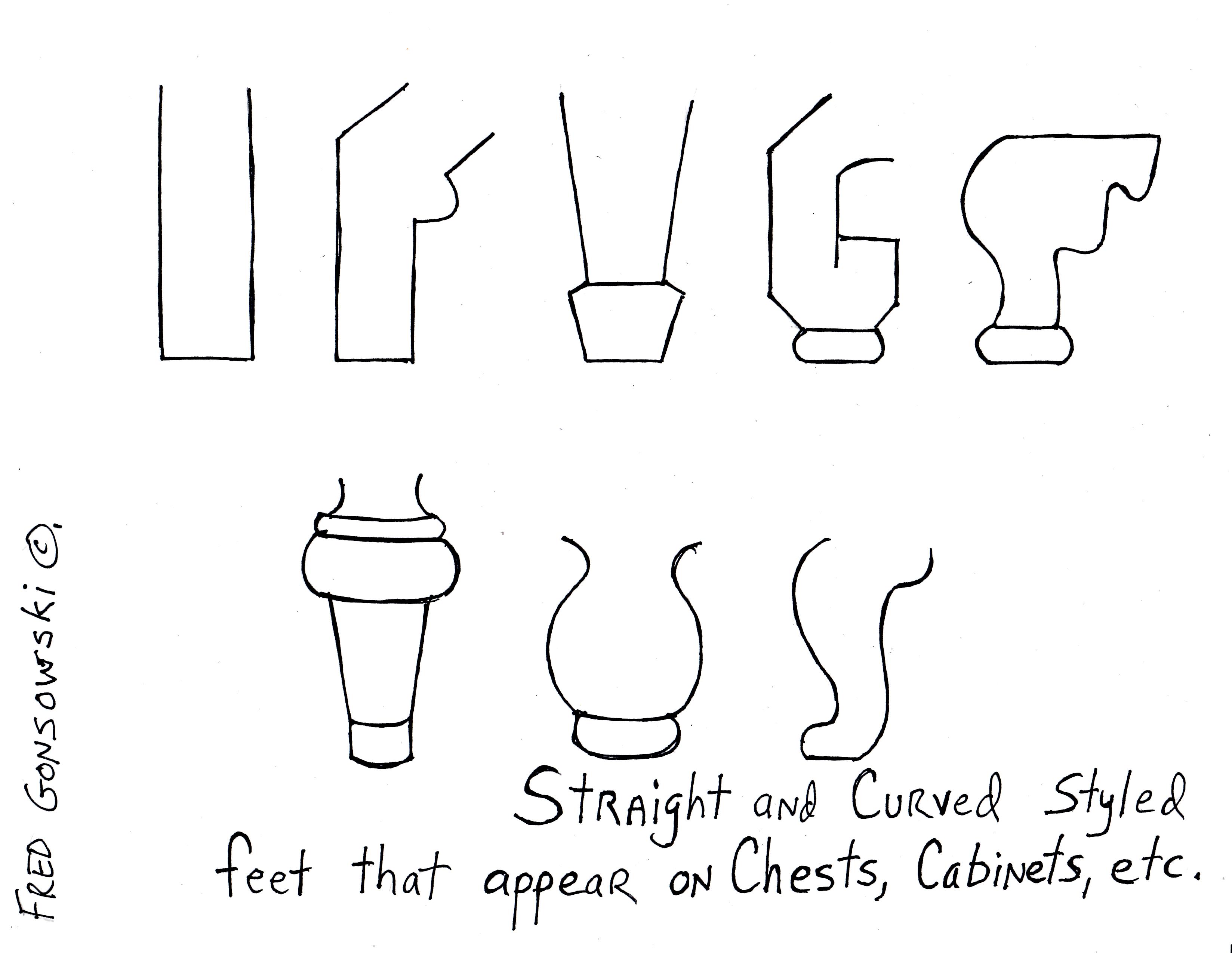 The final grouping of furniture legs to look at are an assortment of Straight and Curved styled feet that can appear on chests, dressers, cabinets, secretary desks, armoires, etc.