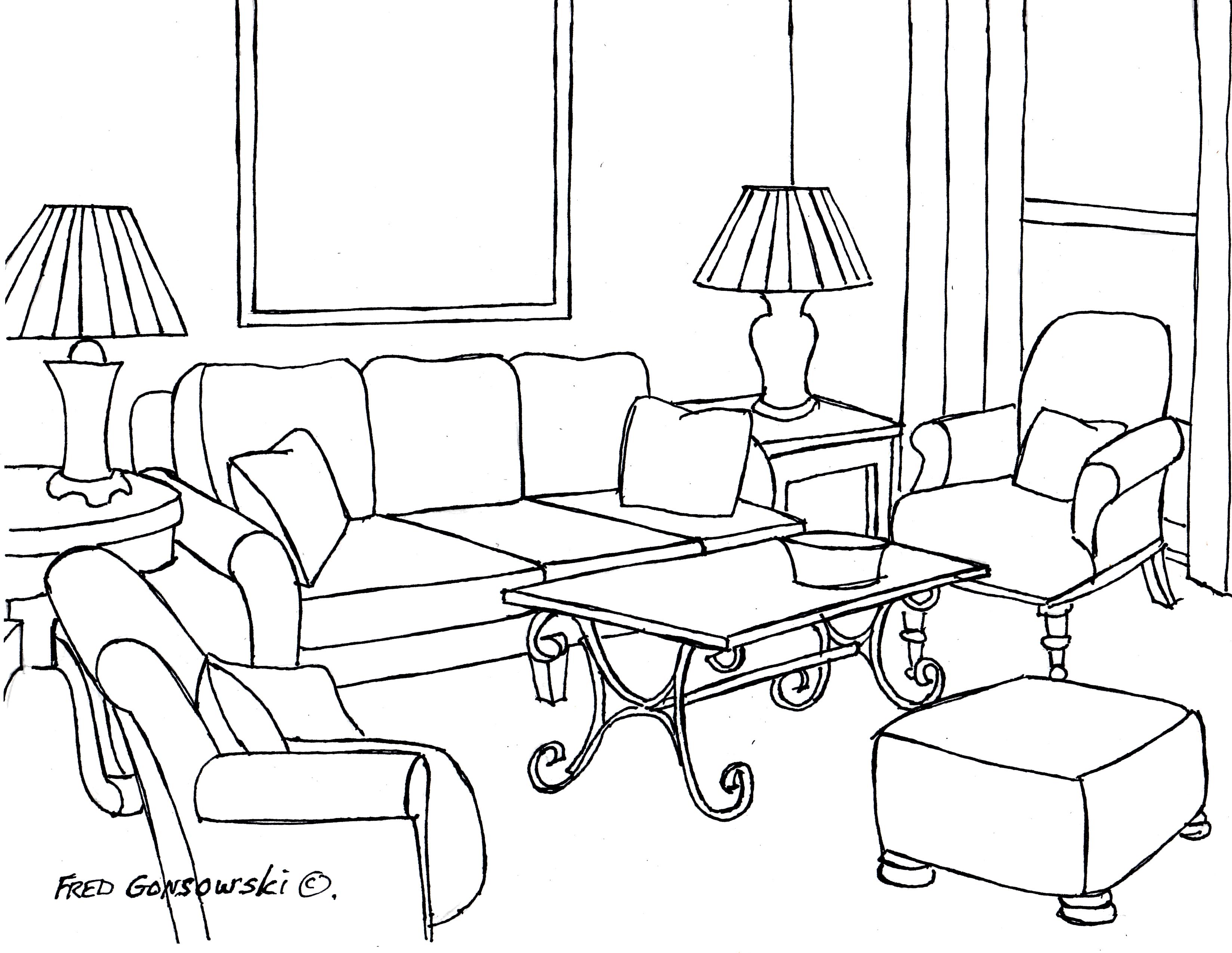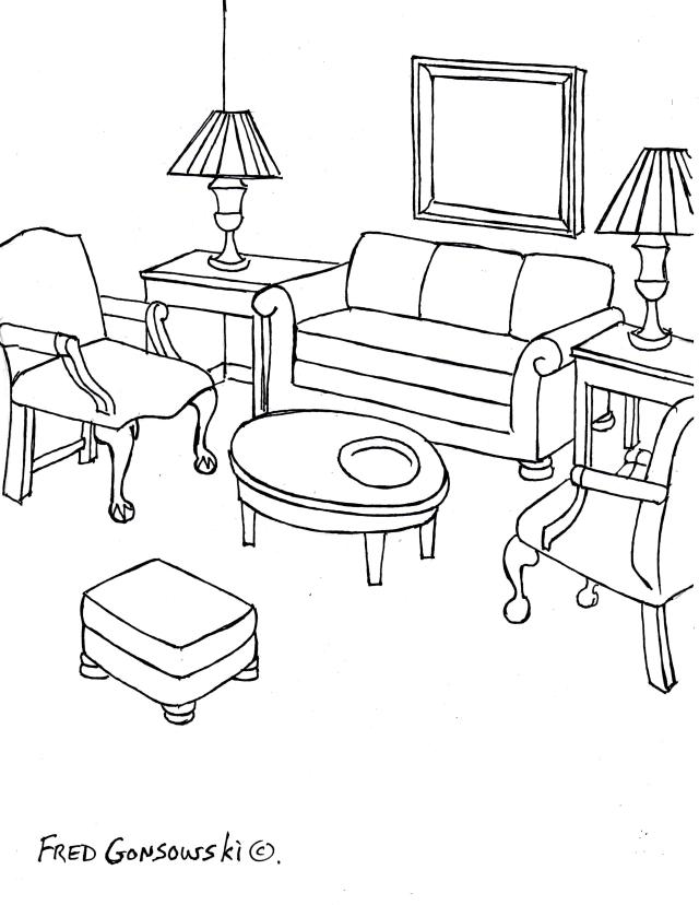 Now let’s look at the above drawing, it’s the cover illustration for this post before I colored it. First notice how the sofa has a tapered foot. Secondly look at how the two end-tables are not matched for style; one has straight legs, and the other is round with curved legs. Third, notice how the two chairs that face each other are matched with spool styled feet. Next look at the coffee table with its curved legs and finally the ottoman with its bun feet. If more of the room were shown, the bun feet of the ottoman and the tapered feet seen on the sofa would be repeated again in another part of the space if space allowed.