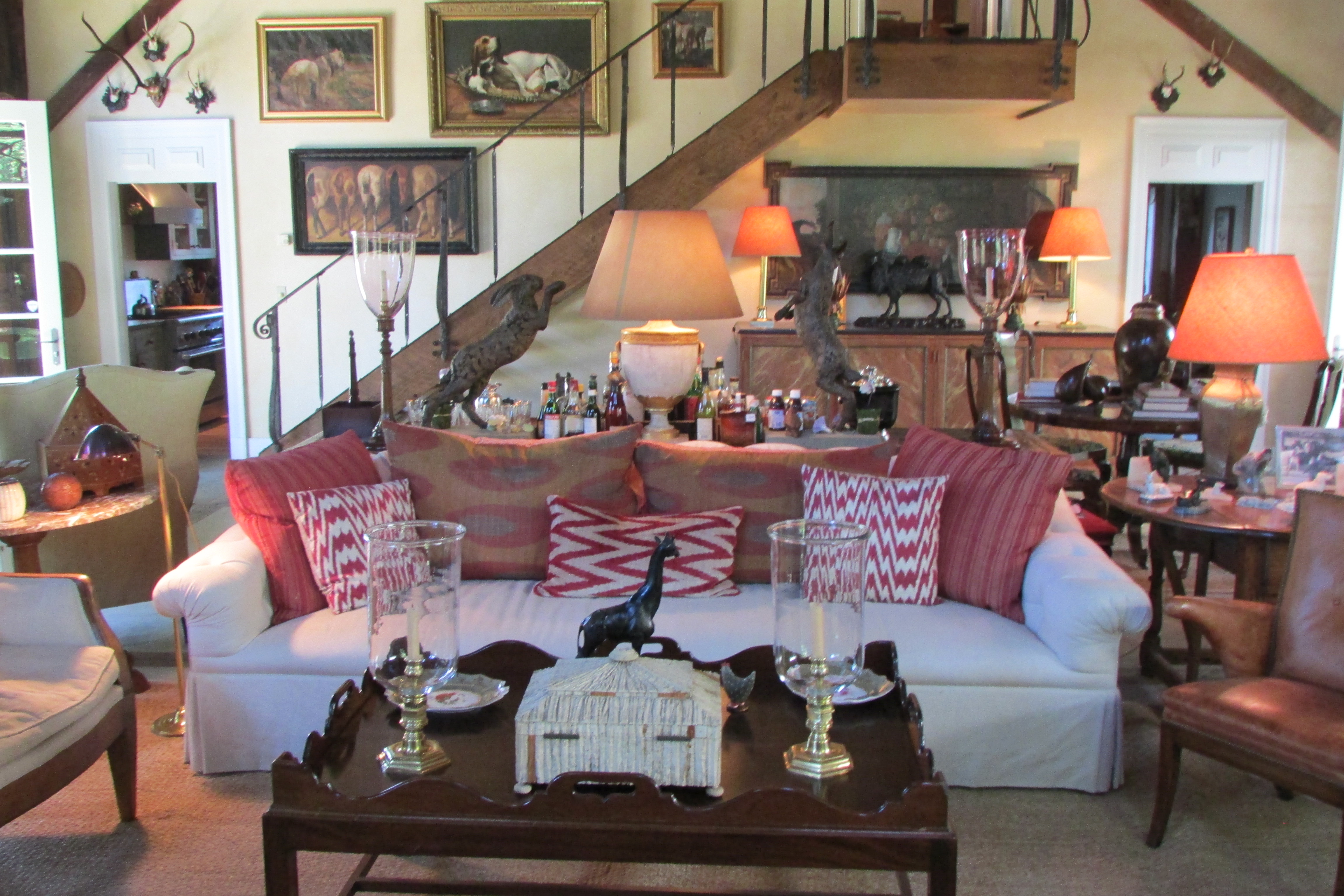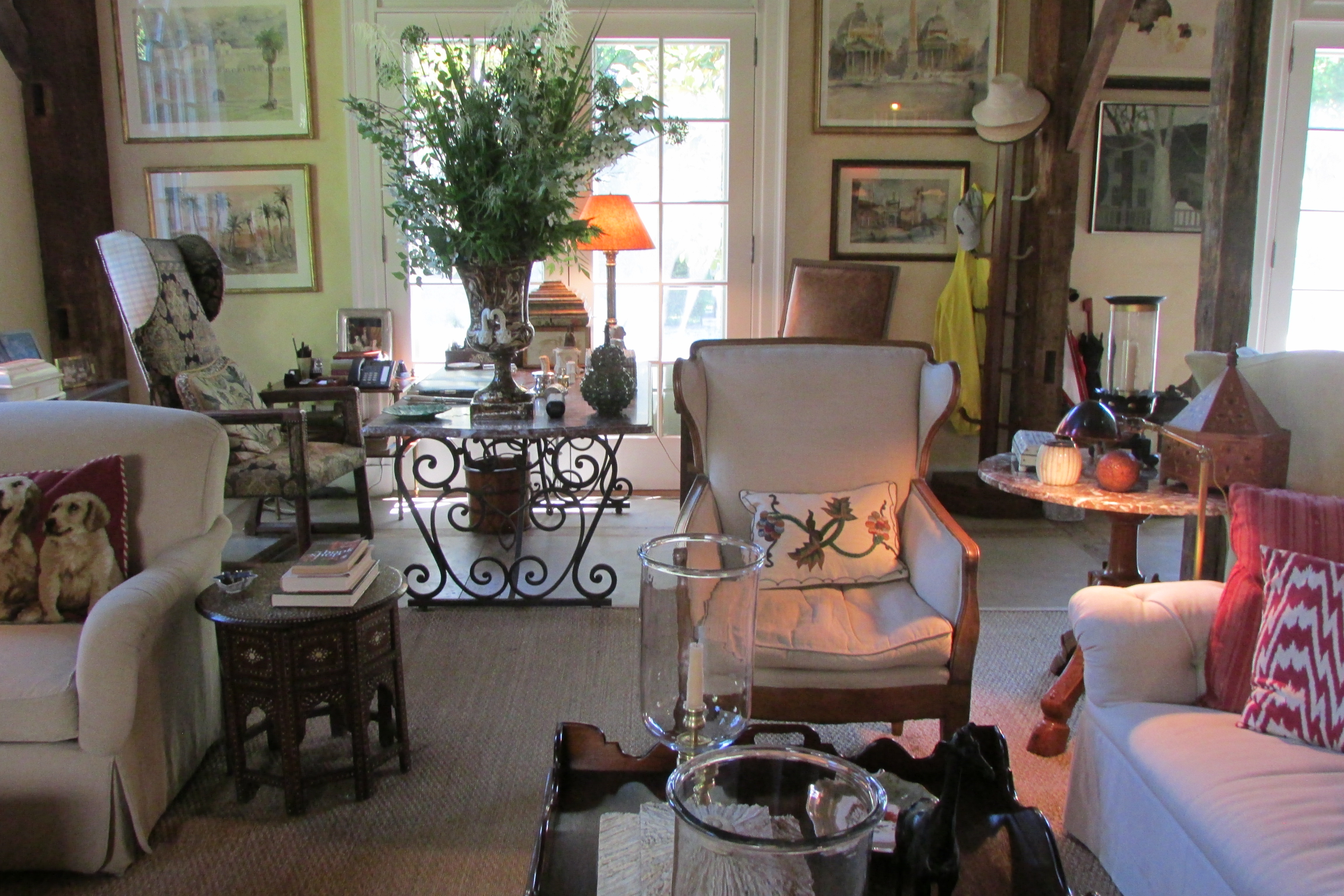 The above two photos show a small part of the great room which is in the Party Barn at nationally known interior decorator Bunny Williams and her husband John Rosselli’s Falls Village, Connecticut estate. What I want you to see here is how many different styles of furniture have been put together in that one room; there are things that could be considered modern, transitional, traditional and really antique. The diversity of pieces gives a lot of visual interest to the room, but the look is held together by the color of the off-white upholstery fabrics used on a lot of the furniture and the red which is an accent color in the space. Also notice how the sofa, with covered legs and the upholstered chair seen in the first photo, on the left, with its covered legs provides a bit of calm set against all the different kinds of legged furniture seen in the room.