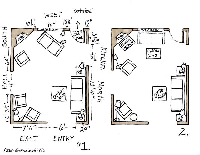 Wow Fred, so glad I stumbled across your website. I am so visual and your sketches are wonderfully helpful. I do think I have Summer beat as I have a living room with….5 or 6 entry points (depending on what counts as an entry point) plus a fireplace and TV on different walls. I have been wanting to buy new furniture for my living room ever since I bought my house almost two years ago, but I have no idea how to arrange my space. I have drawn it and redrawn it, scoured the internet for ideas, and even hired an interior designer to come see it and still I do not have a good plan. I would love your suggestions. If you are interested in tackling I will try to draw out an overhead view with measurements for you.