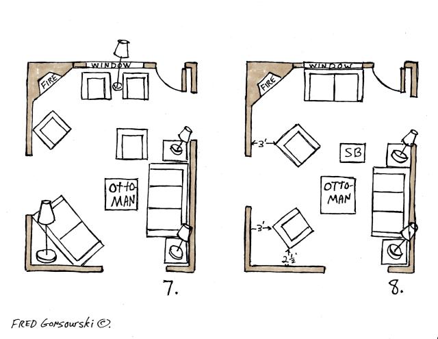 Illustrations #7 and #8 have the sofa placed against the north wall again.