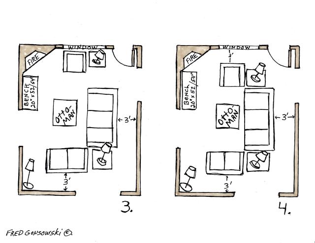 Illustrations #3 and #4 show how furniture is much more easily grouped in the space, when it is floating in the center of room.