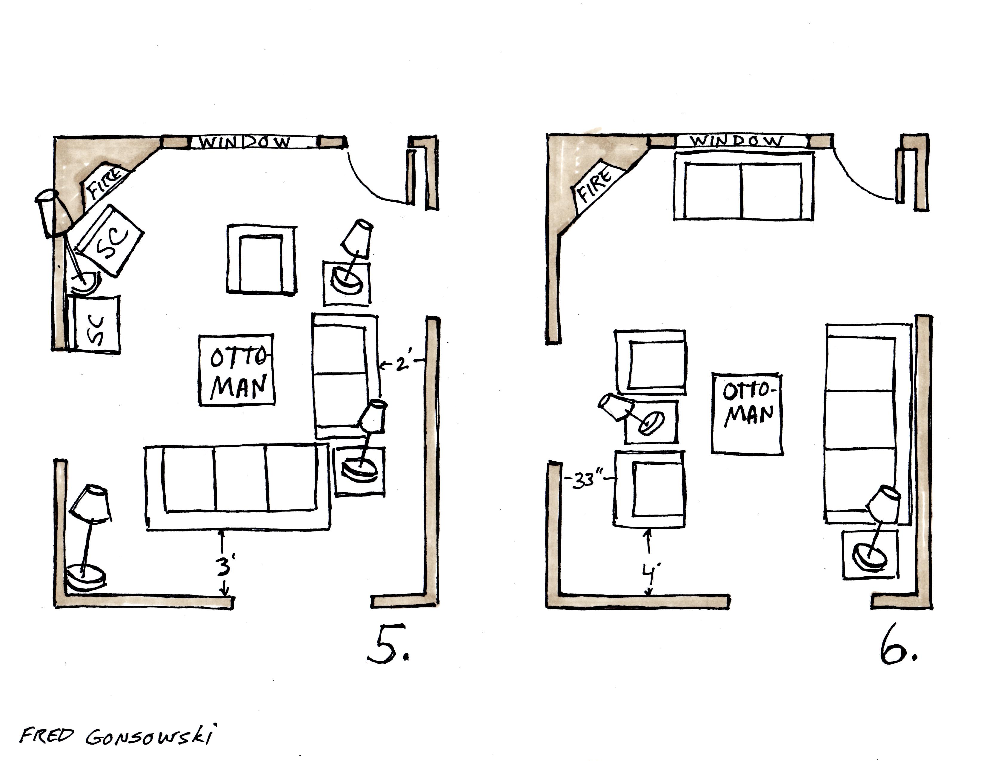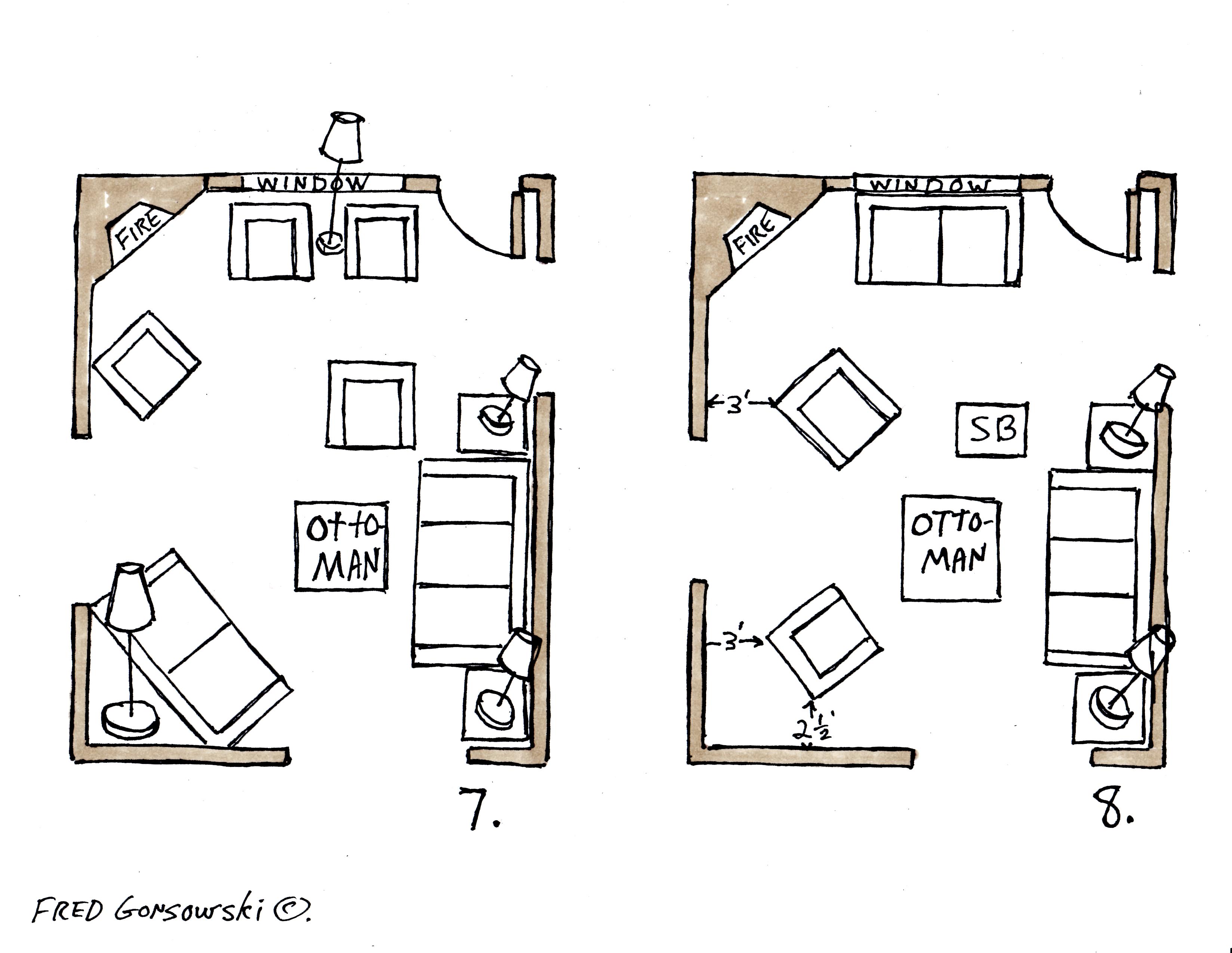 Wow Fred, so glad I stumbled across your website. I am so visual and your sketches are wonderfully helpful. I do think I have Summer beat as I have a living room with….5 or 6 entry points (depending on what counts as an entry point) plus a fireplace and TV on different walls. I have been wanting to buy new furniture for my living room ever since I bought my house almost two years ago, but I have no idea how to arrange my space. I have drawn it and redrawn it, scoured the internet for ideas, and even hired an interior designer to come see it and still I do not have a good plan. I would love your suggestions. If you are interested in tackling I will try to draw out an overhead view with measurements for you.