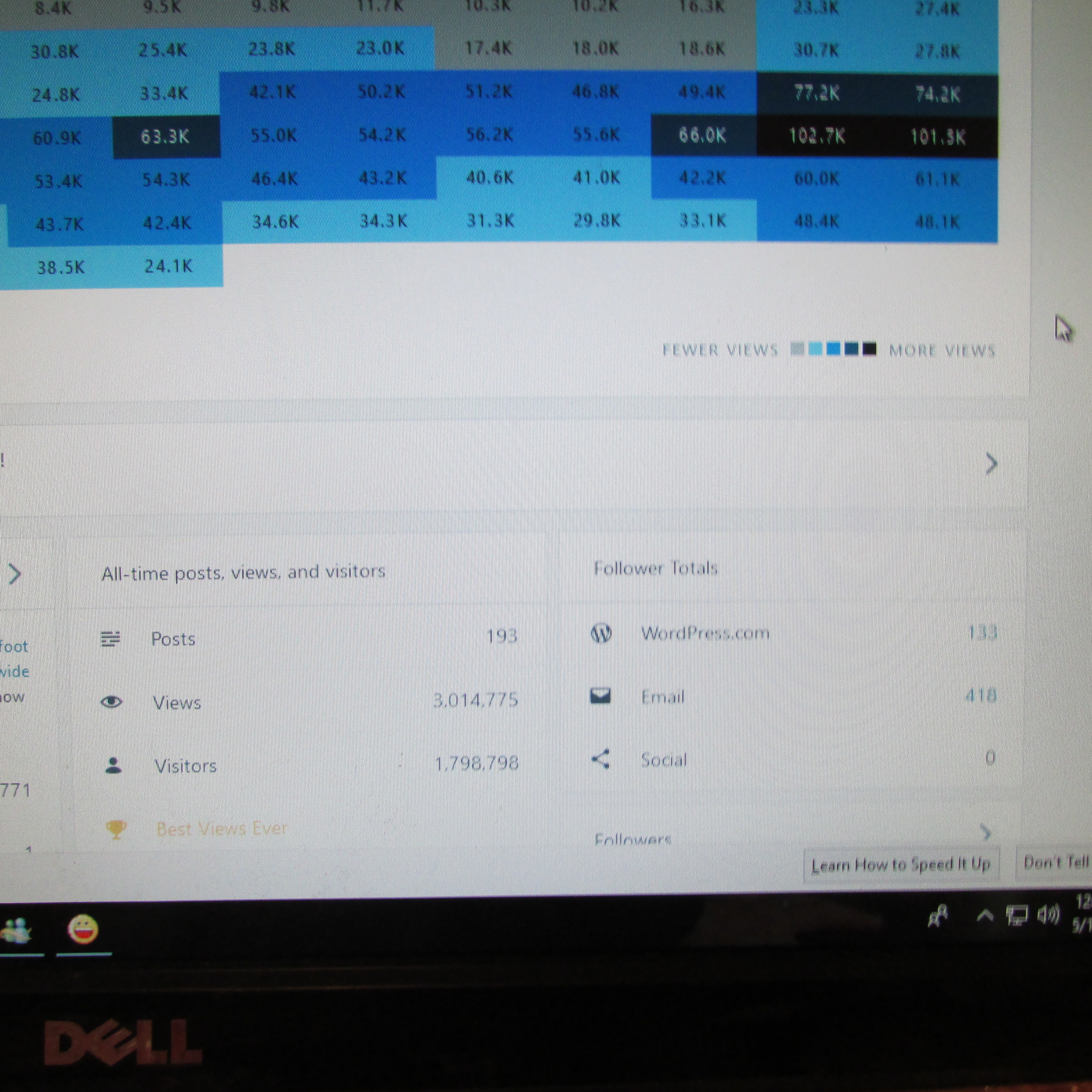 A photo of the Insight screen on my WordPress dashboard showing the 3,014,775 Page Views/Articles Read by the 1,798,798 visitors viewing this blog.