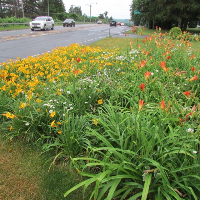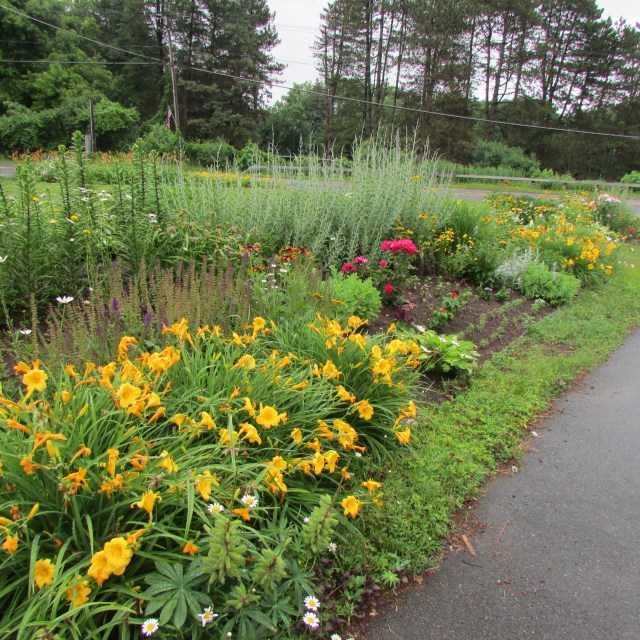 Down by the road a daylily bed filled with Stella de oro, some wild daises that have self seeded and an early and late varieties of wild orange daylilies catch the eye of passers-by.