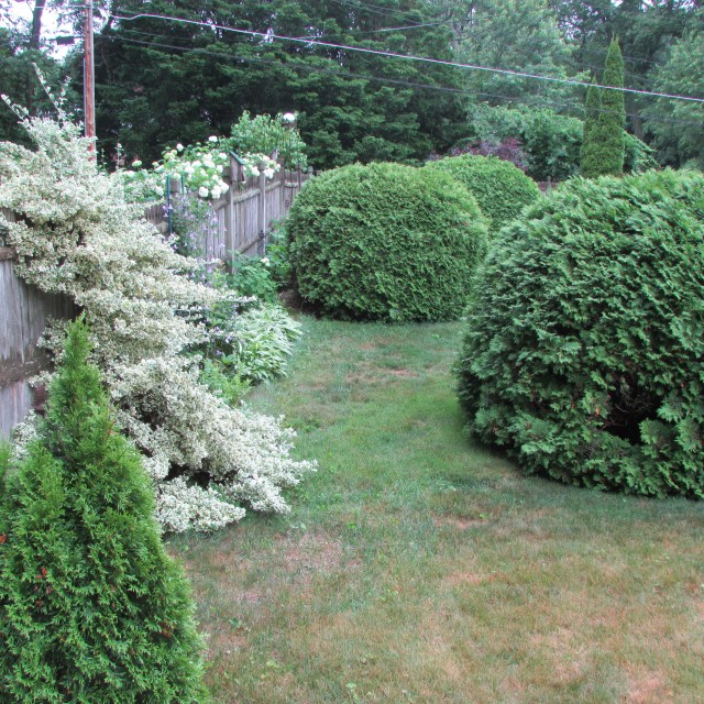 The  second photo shows the three arborvitae spheres that I planted along the fence and a wonderful euonymus that was started for me, more than 25 years ago, by my Aunt Anna.  I love how it’s growing up the fence and is pouring over the fence into my neighbor’s yard as her hydrangea pour over into mine.