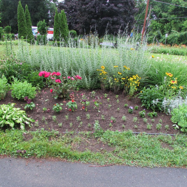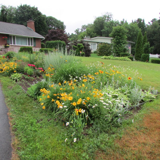 Twenty four bales was just enough to do the front garden, my newly designed vegetable garden (which will be shown in the next post)  and a new space where I’ve decided to plant the dahlias that I keep from year to year.  So let’s start the tour… The cover photo for this post and the above shot are views of out front looking down toward the road (click on photos to enlarge). The pinks, blues and purples of the peonies, lupine, iris and perennial salvia have past and the garden has now taken on the warmer colors of yellow, orange and red.  If you look closely at this side of the border you will see spaces between the clumps of perennials, this is where I plant oh-too many annuals.  I like the perennials because they come up every year and add structure to the garden, but I also want a lot of color for a long time, which only annuals provide.