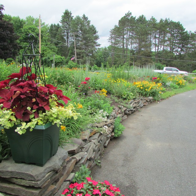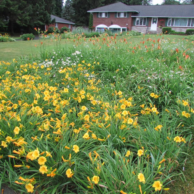 Down by the road a daylily bed filled with Stella de oro, some wild daises that have self seeded and an early and late varieties of wild orange daylilies catch the eye of passers-by.