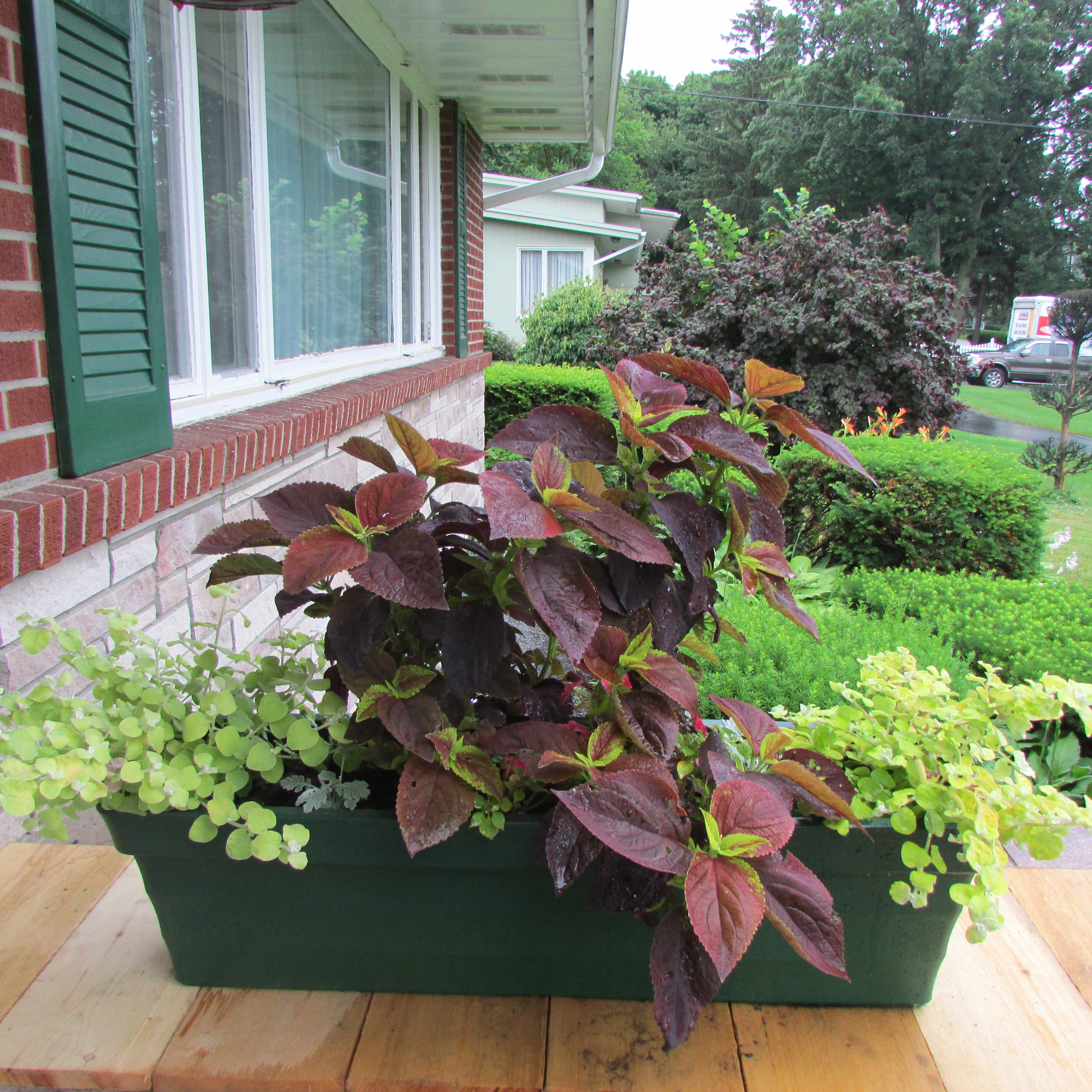I love burgundy toned foliage because it makes green, chartreuse,  gray and blue toned leaves and needles pop.   Here I used it in a new flower box, that I’ve painted green to match the shutters on my house.