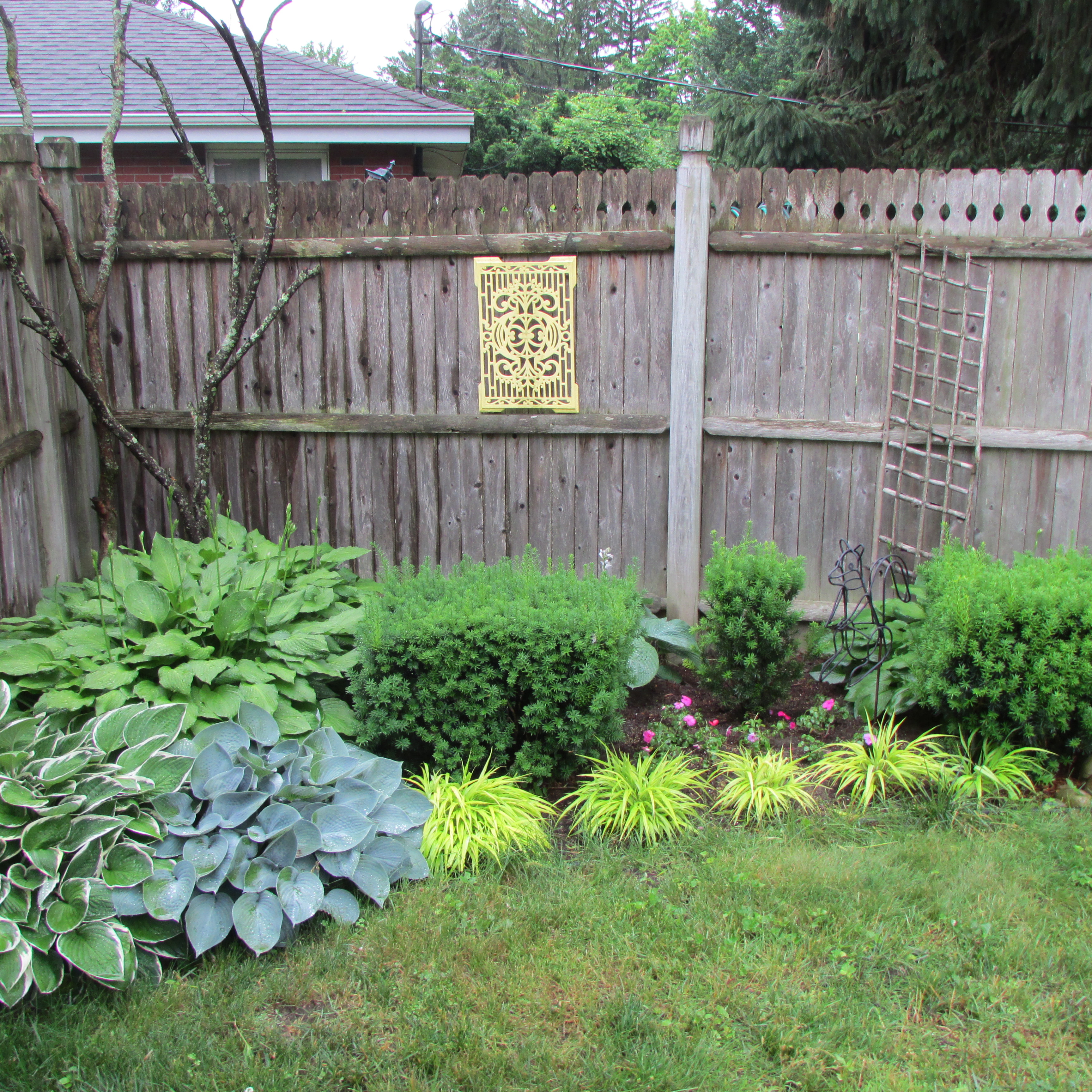 The  second photo shows the three arborvitae spheres that I planted along the fence and a wonderful euonymus that was started for me, more than 25 years ago, by my Aunt Anna.  I love how it’s growing up the fence and is pouring over the fence into my neighbor’s yard as her hydrangea pour over into mine.